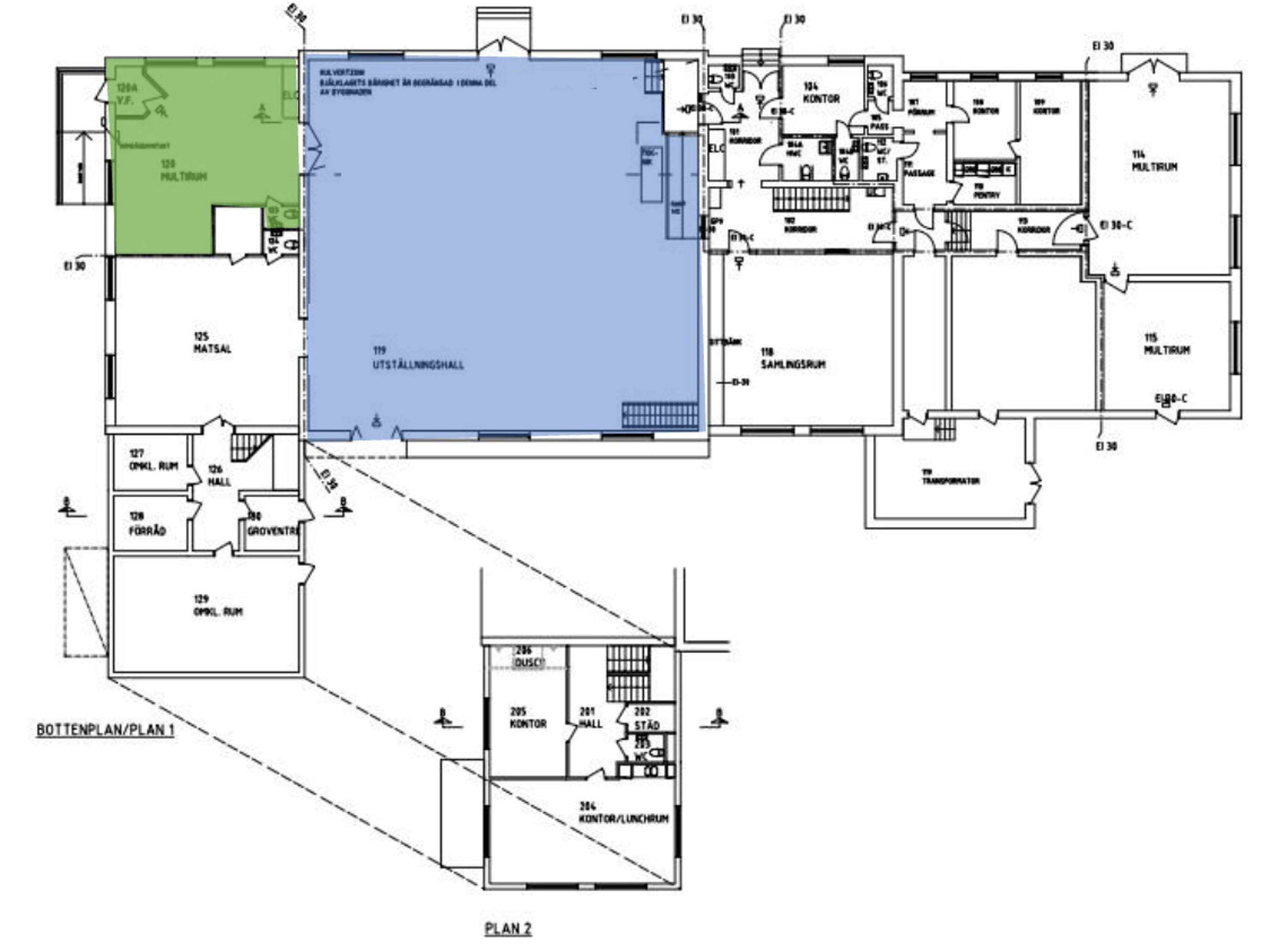 Lokal med med WC (grönt på ritningen).