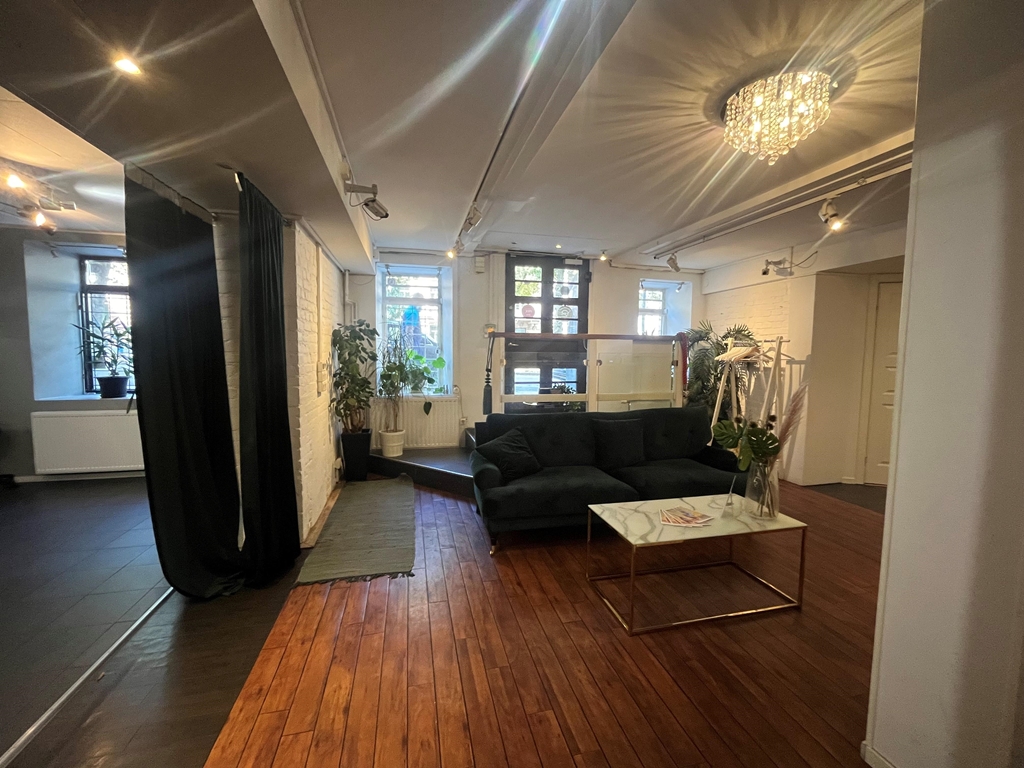 Lokalen har en välkomnande entré via en liten trappa, vilket direkt ger ett inbjudande första intryck. Här finns gott om utrymme för både en receptionsdisk och en loungegrupp, perfekt för väntande kunder eller gäster.