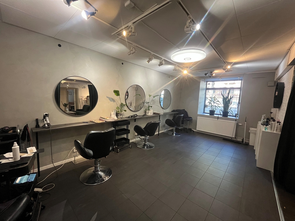 Till höger om entrén öppnar en större yta upp sig, som tidigare fungerat som frisöravdelning. Här finns även ett mindre utrymme för tvättmaskin eller annan praktisk utrustning. Längst in i lokalen finns ett personalpentry samt generösa ytor för förvaring, vilket gör att verksamheten kan fungera smidigt och effektivt utan att kompromissa med arbetsmiljön.