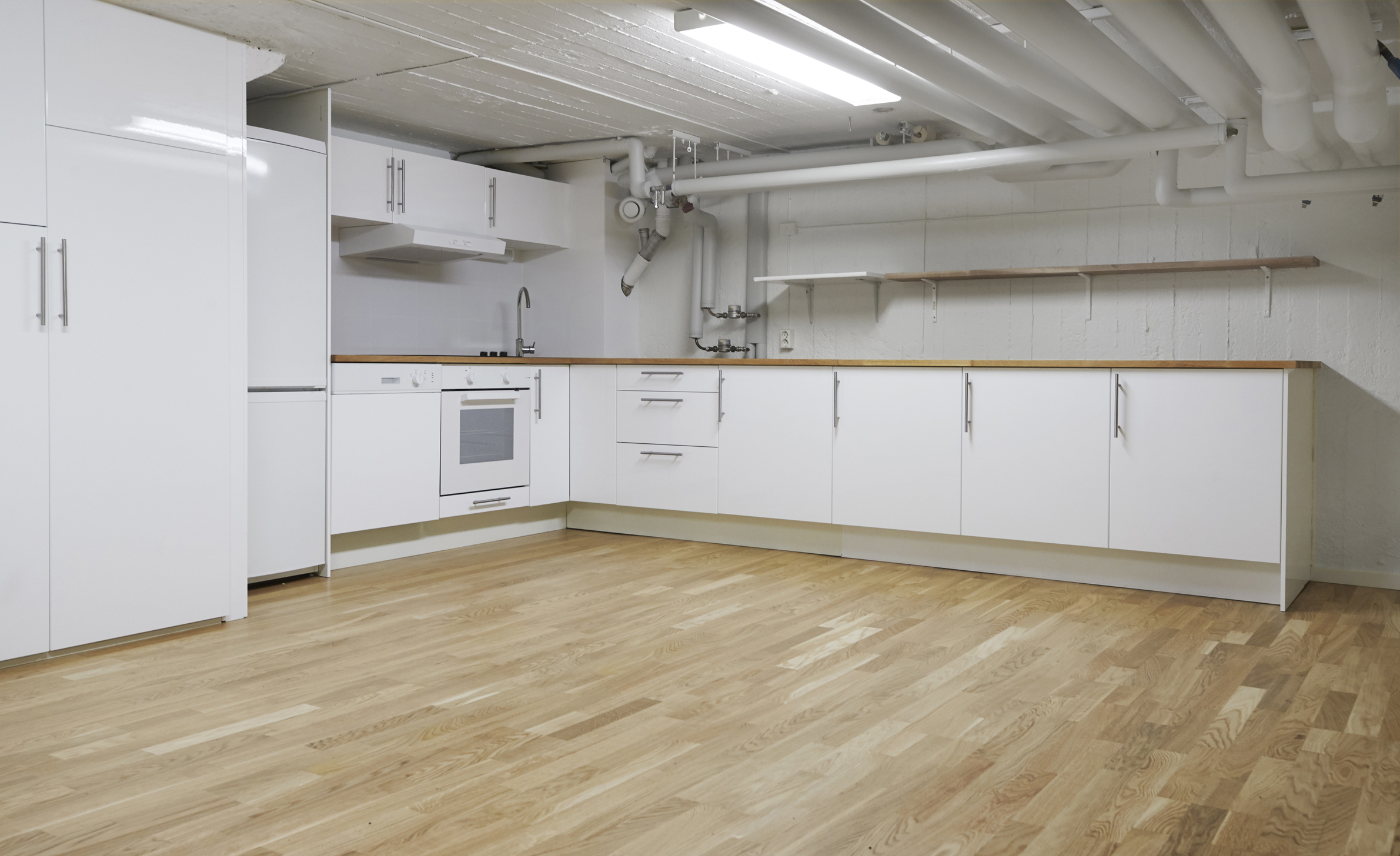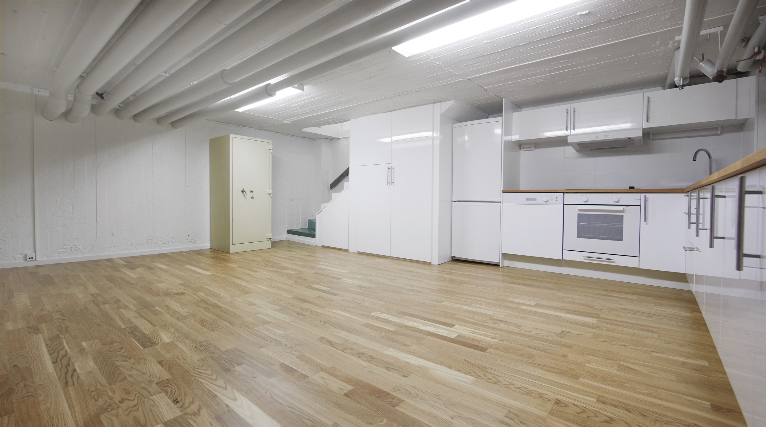 Två öppna våningar. BV med kontor, två ingångar och wc. Källarplan med lagermöjlighet samt pentry.