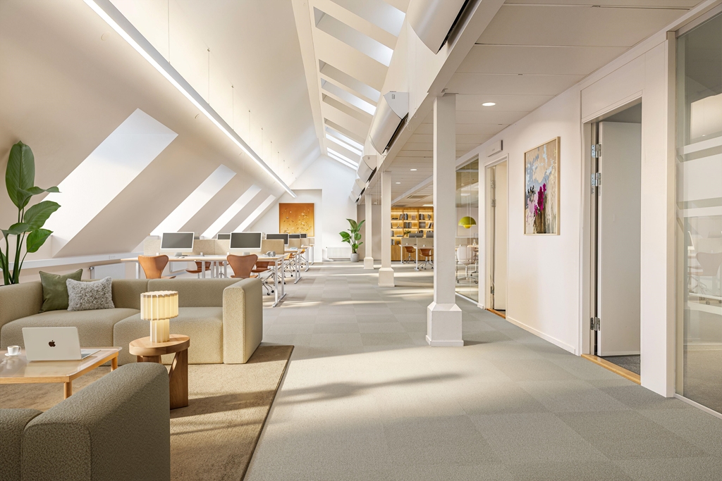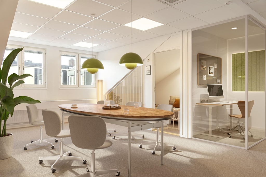 Kontoret erbjuder en arbetsmiljö som kombinerar funktion, komfort och en tydlig känsla av rymd. Med en takhöjd på upp till cirka 4,5 meter i det öppna landskapet och stora fönsterpartier får lokalen ett fint ljusflöde som skapar en trivsam och inspirerande atmosfär. Planlösningen är flexibel och anpassad för moderna arbetssätt, med en bra mix av öppet kontorslandskap, flera mötesrum och mindre rum för digitala möten och fokuserat arbete.