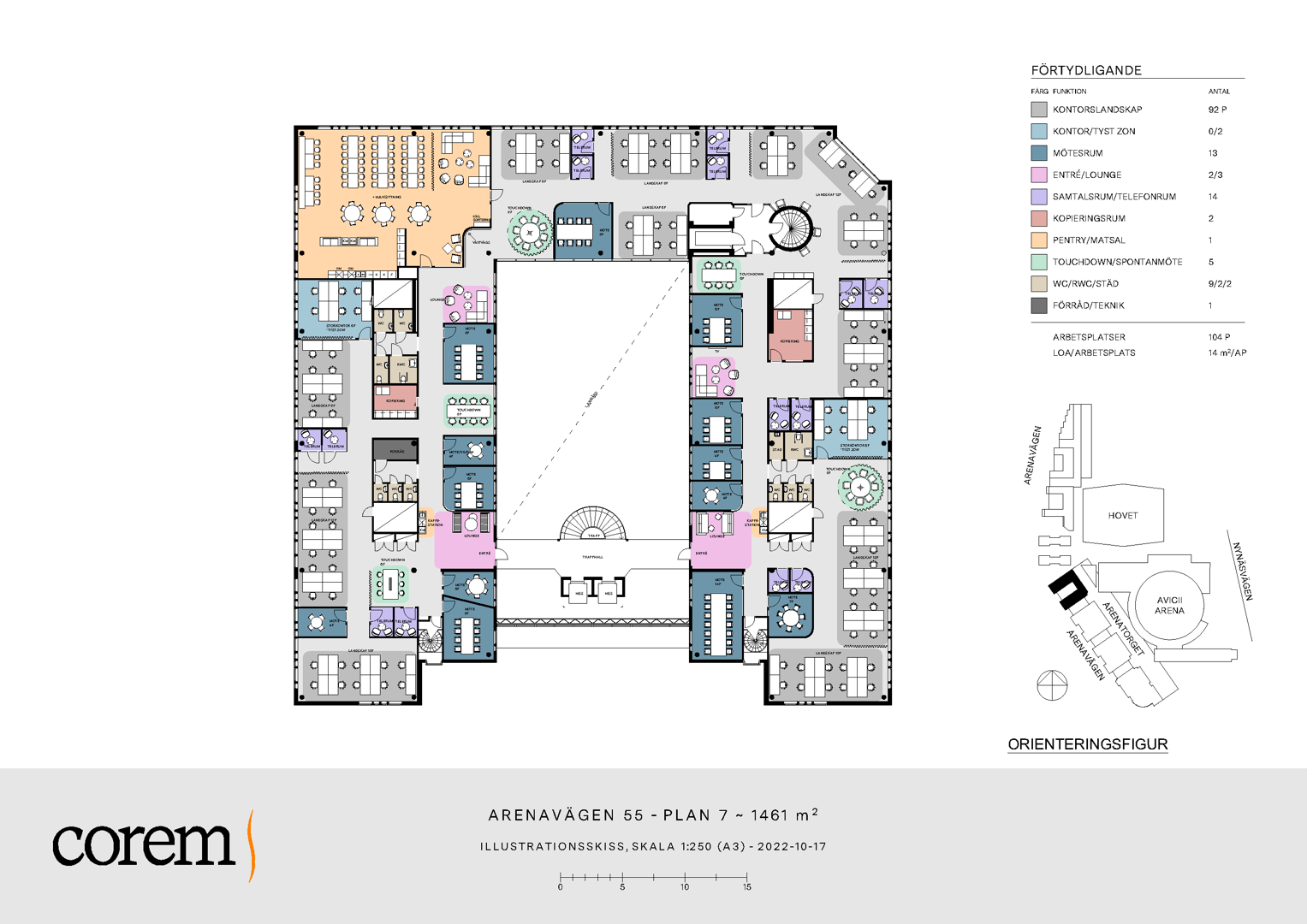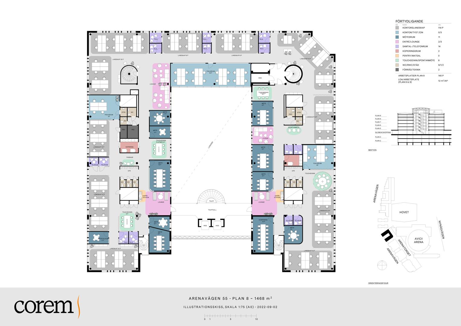 Välkomna till Arenavägen 55 där vi på Corem just nu tar ett helhetsgrepp och renoverar samtliga ytor till morgondagens standard och behov. Corem har just nu lediga lokaler från 800 - 3 000 kvm. Lokalerna ligger runt ett atrium där Globen Shopping ligger i botten med många butiker, restauranger och service. Här finns möjlighet att vara med och anpassa planlösningen och färgval efter eget tycke och smak. I fastigheten erbjuds dessutom ett garage som nås med hiss i direkt anslutning till lokalerna och cykelrum för alla som cyklar till och från jobbet. Bilagda planlösningar är endast exempelritningar. Kontakta oss gärna för mer information eller för att boka en visning!