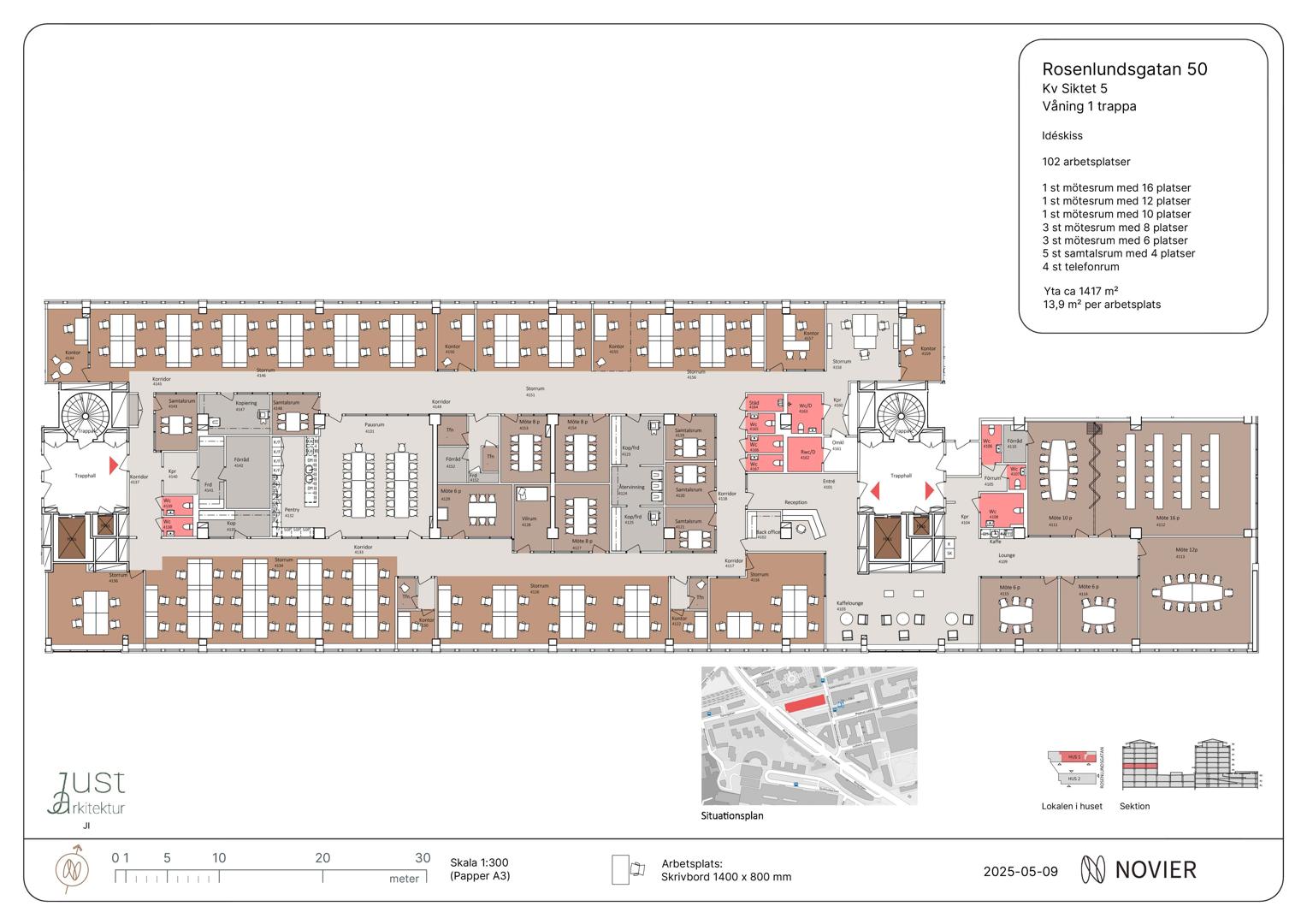 Lokalen har flera kontorsrum, mötesrum, arbetsplatser och gemensamma ytor. Vidare finns det två entréer som delar upp lokalen i en intern och en extern del.