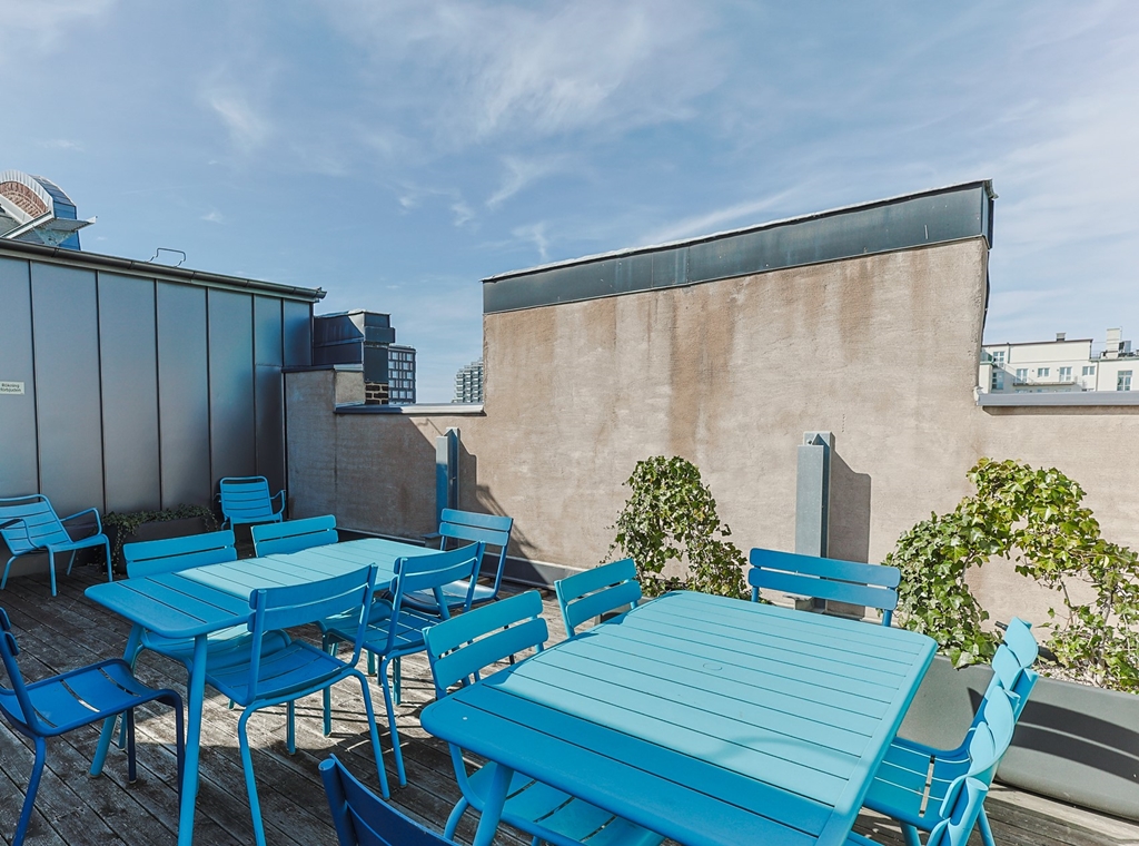 En enastående takterrass med utsikt över takåsarna där ni kan njuta av lunchen.