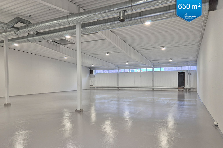 Helt nyrenoverad lager-/utställningslokal med kontor och kök, öppen planlösning och port i markplan. Fasta P-platser finns utanför lokalen och ingår i hyran.