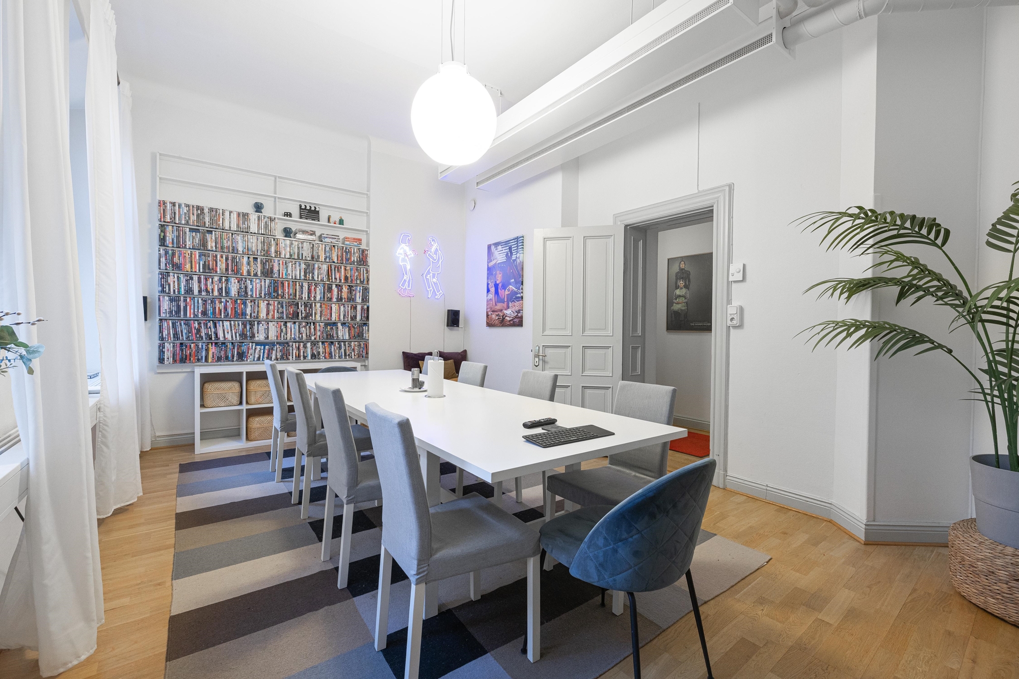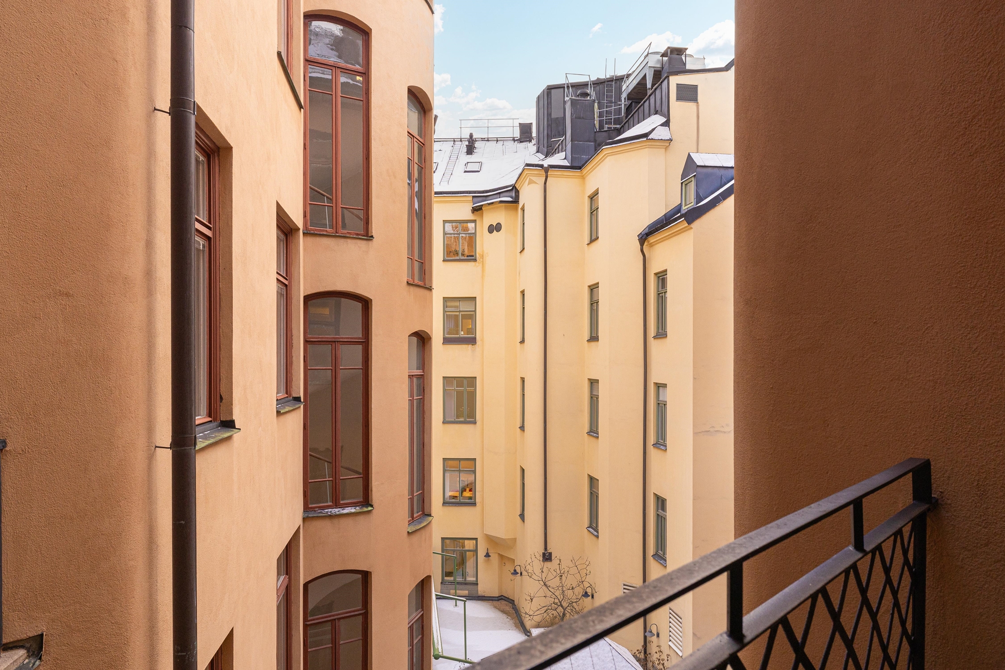 Innanför entrédörrarna möts du av en välkomnande hall med plats för anhängning. Intill hallen finns ett mötesrum med en härlig balkong i sydvästläge.