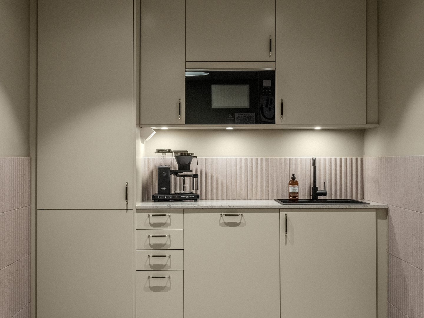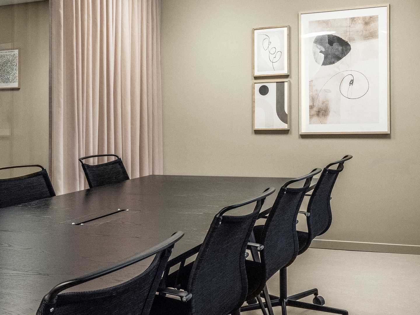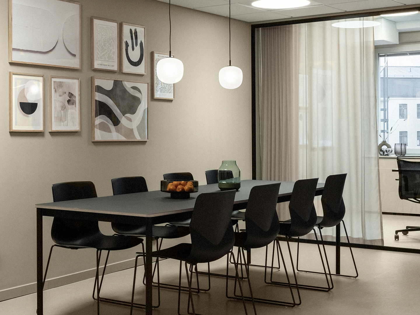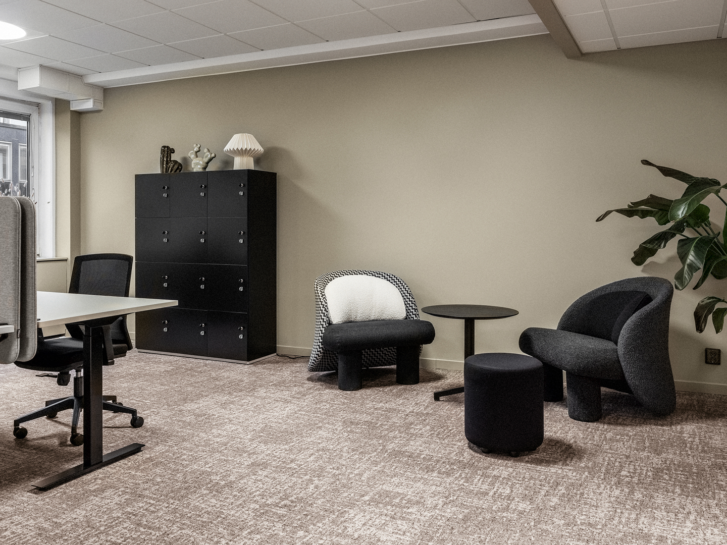 Lokalen om 117 kvm erbjuder ett modernt och stilrent kontor med sobra färger i mattor, väggar, kakel och sten, som kontrasteras av svarta detaljer, belysning och möbler. Resultatet är en inbjudande arbetsmiljö som passar perfekt för 8–10 personer.