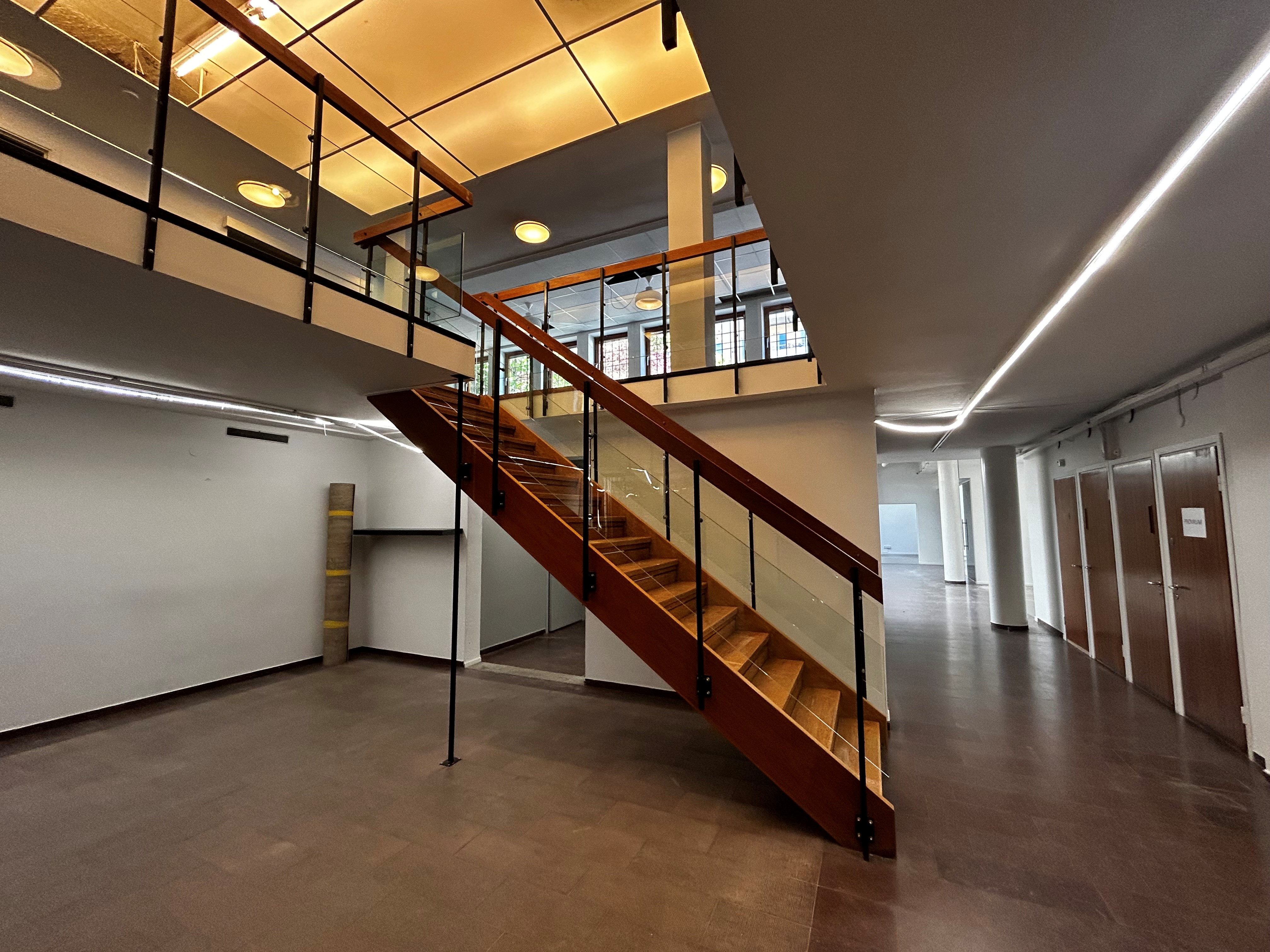 Denna fantastiska lokal i etage erbjuder en välkomnande entré som leder in till en yta med generös rymd och en takhöjd på nära 4 meter - passande för exempelvis showroom. En ståtlig trapp leder upp till en perfekt intern yta där arbetsplatser och mötesrum kan anpassas efter era behov och önskemål.