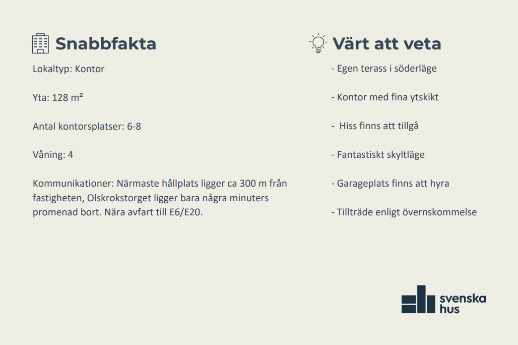 Välkommen till en fin lokal med plats för ca 8-10 arbetsplatser. Lokalen är idag rumsindelad men går att öppna upp om man så önskar. Här sitter man med ett fint skyltläge och snabb access ut till både E6, E20, R40, till det har man även närhet till centrala stan. Lokalen erbjuder dessutom en egen terrass i härligt soligt söderläge där man kan njuta av sin lunch eller en kopp kaffe. Garageplatser finns att hyra i fastighetens garage. Angivet pris per m² är en indikativ kallhyra för lokalen i befintligt skick. Driftskostnader och fastighetskatt tillkommer. Välkommen att kontakta mig för mer information eller boka tid för visning.
