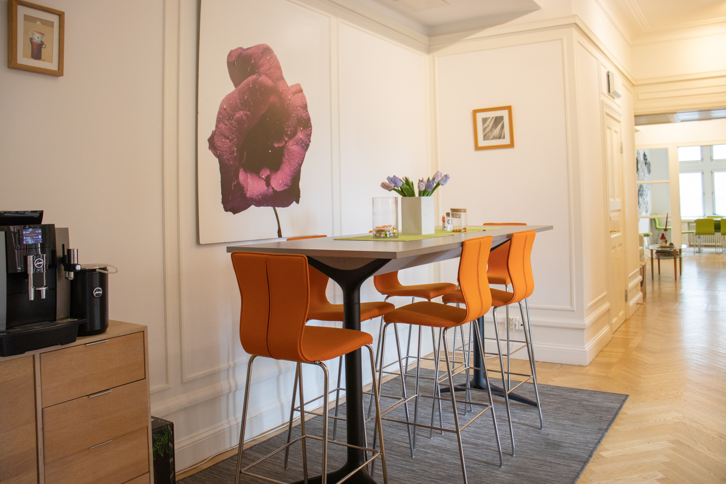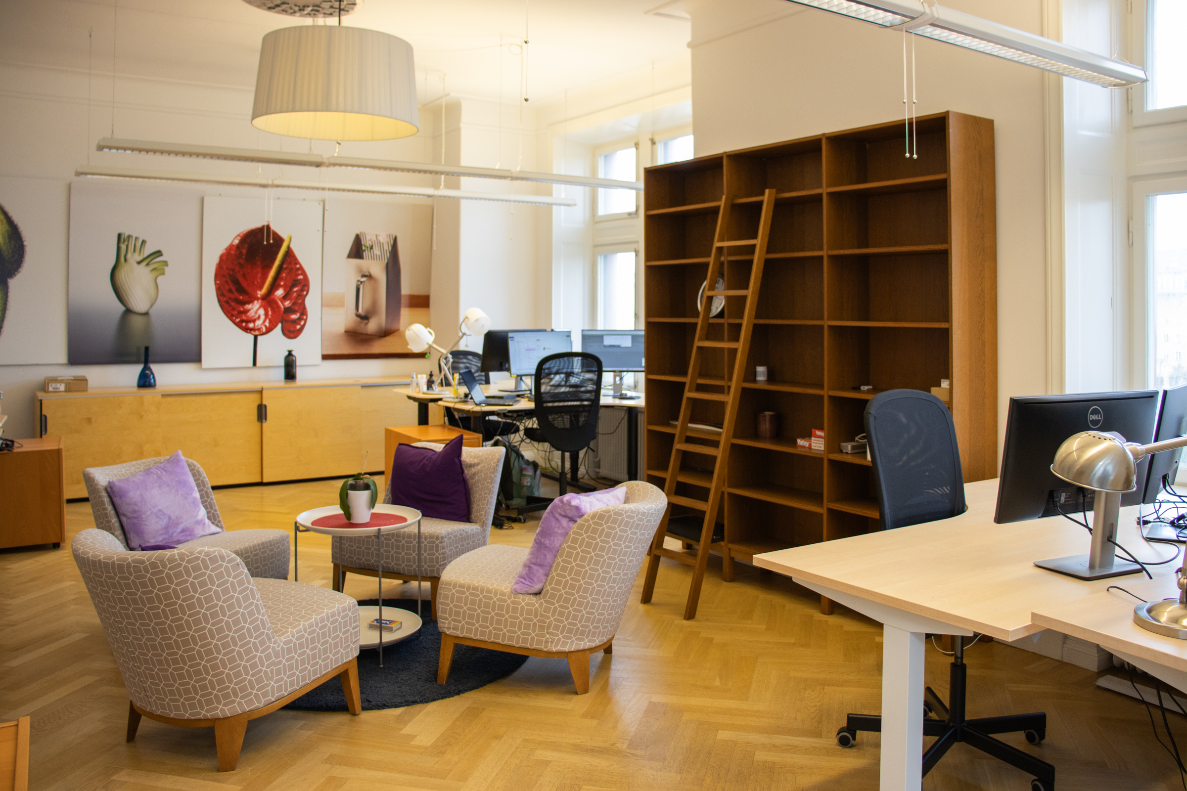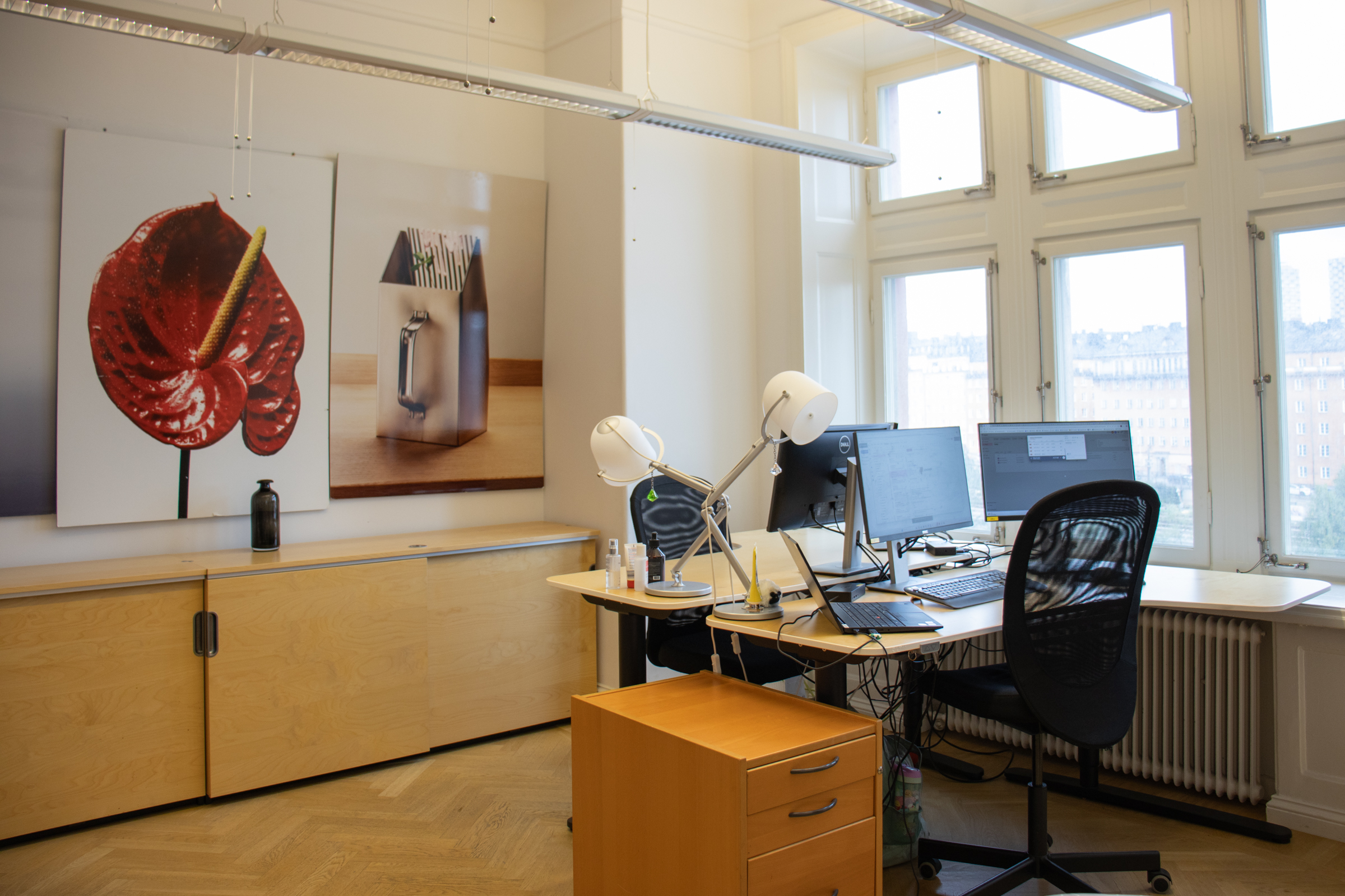 Denna fina och unika hörnlokal har en väl tilltagen takhöjd och ett vackert stavparkettgolv och består dels av ett större ljust hörnrum med plats för 10-12 arbetsplatser med utsikt över Karlbergskanalen och Sankt Eriksbron. Här finns också ett större konferensrum, två inglasade samtalsrum, ett mindre mötes-eller projektrum, pentry, förråd samt två wc varav en med dusch. Lokalen har dessutom en inbjudande social loungeyuta med en liten balkong ut mot en lugn innergård.