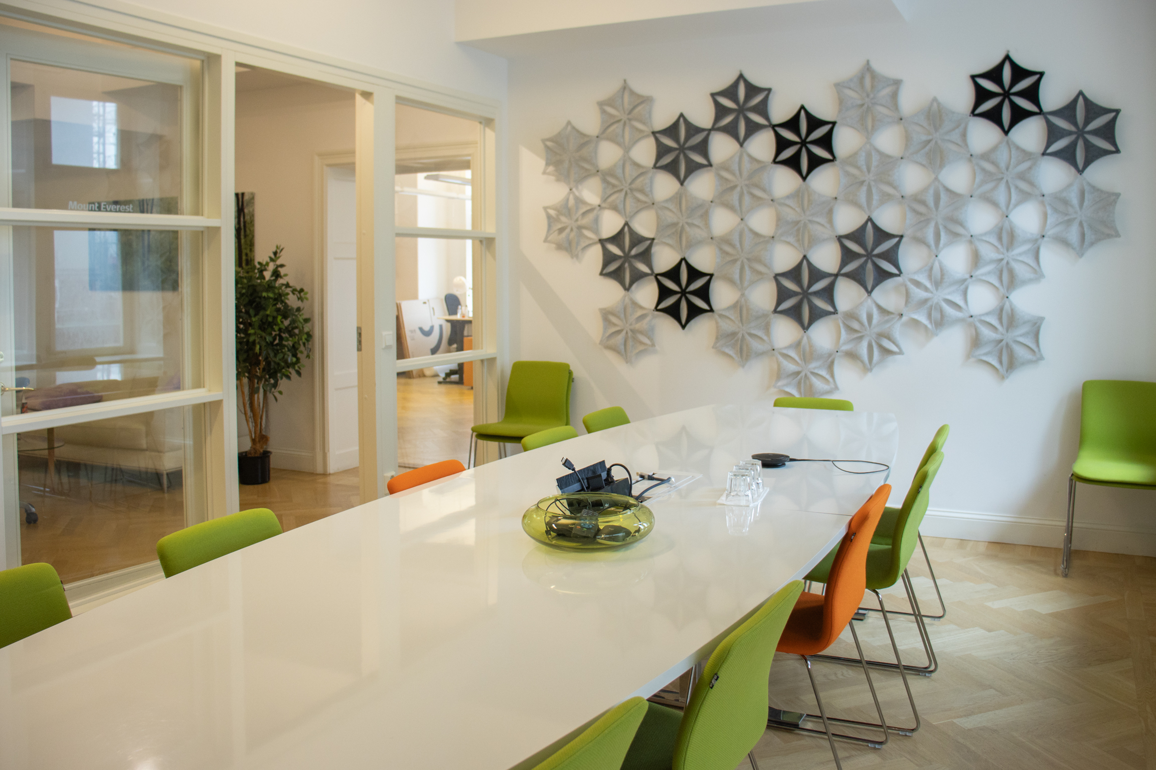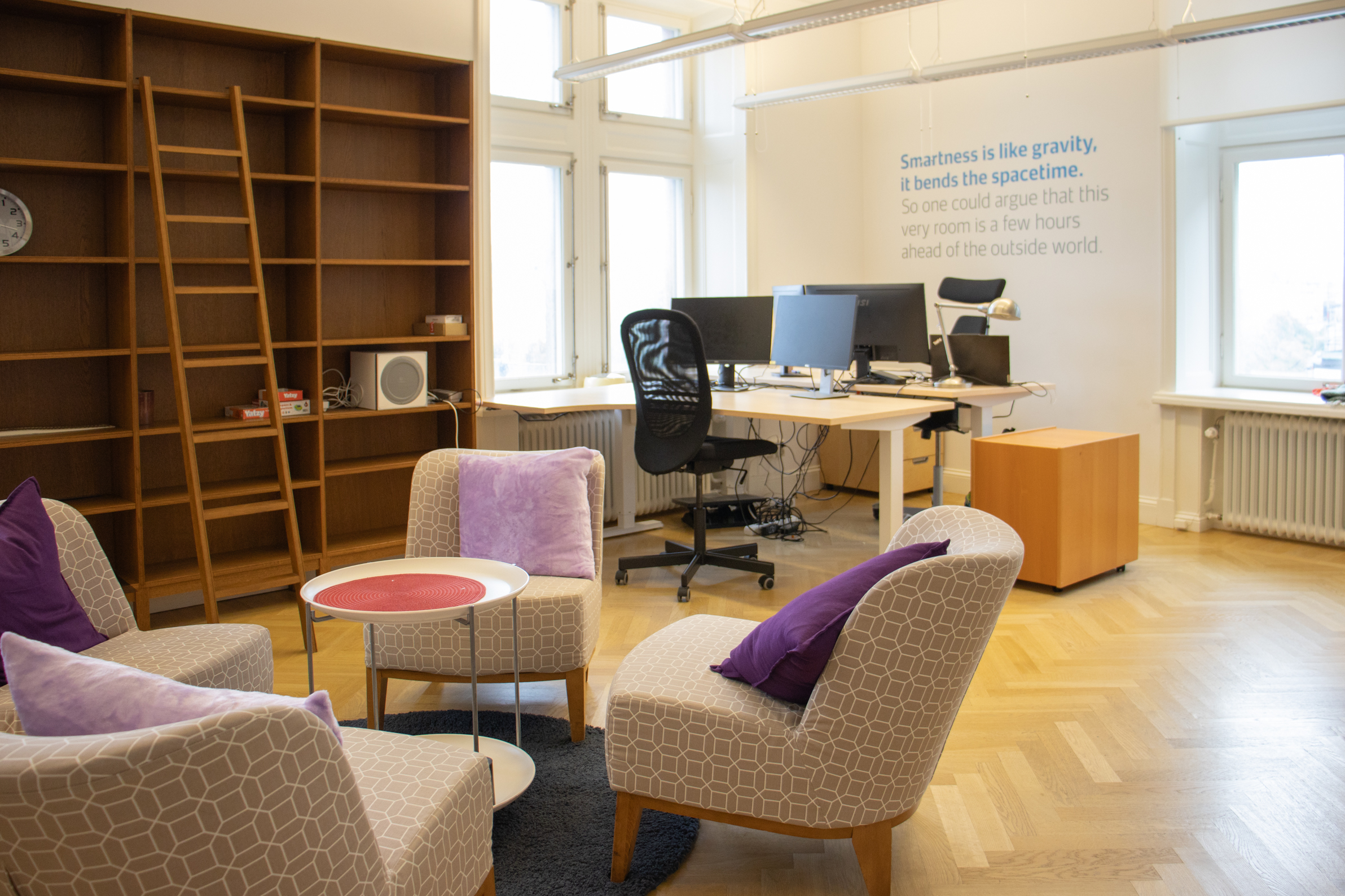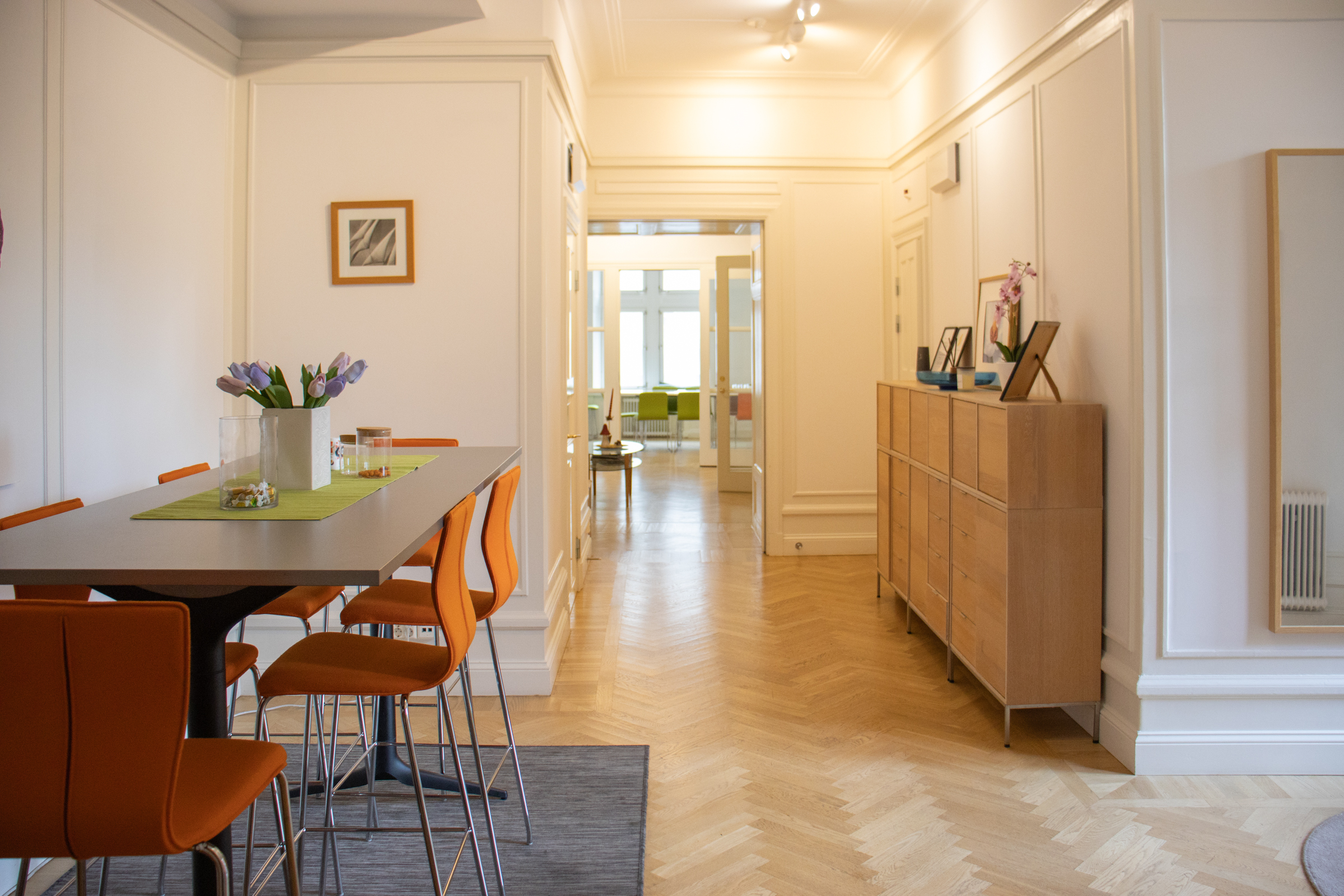 Denna fina och unika hörnlokal har en väl tilltagen takhöjd och ett vackert stavparkettgolv och består dels av ett större ljust hörnrum med plats för 10-12 arbetsplatser med utsikt över Karlbergskanalen och Sankt Eriksbron. Här finns också ett större konferensrum, två inglasade samtalsrum, ett mindre mötes-eller projektrum, pentry, förråd samt två wc varav en med dusch. Lokalen har dessutom en inbjudande social loungeyuta med en liten balkong ut mot en lugn innergård.