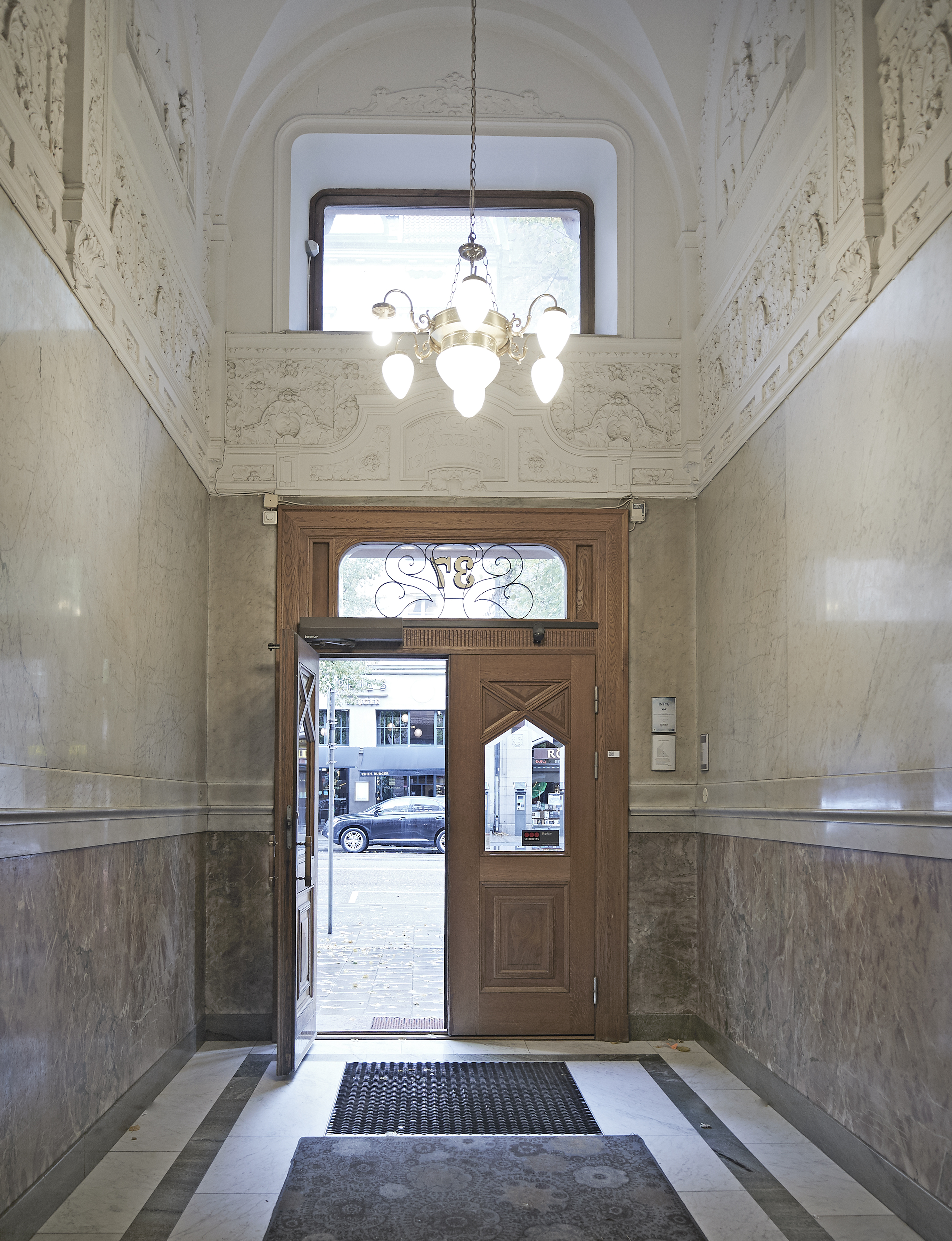 Byggt 1910-12, ritat av arkitektfirman Hagström & Ekman. Mycket vackra entréer med blyinfattade fönster, reliefer och stukaturer på väggar och tak.