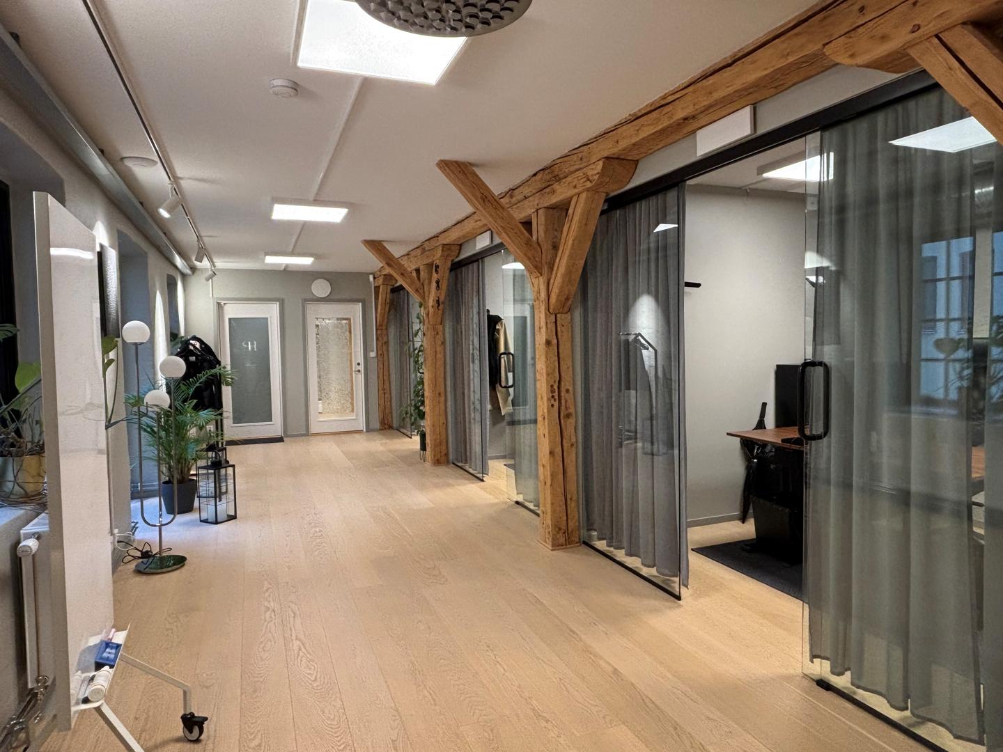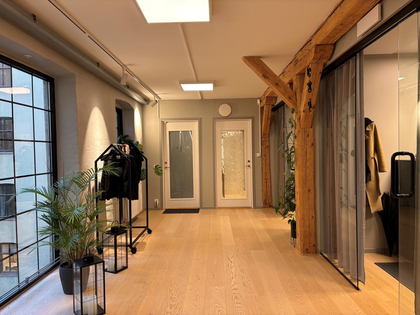 I lokalen om 100 kvm erbjuds två kontorsrum samt loungedel mellan rummen. Konferensrum finns i anslutning till entrén och ett mindre samtalsrum finns jämte pentryt.