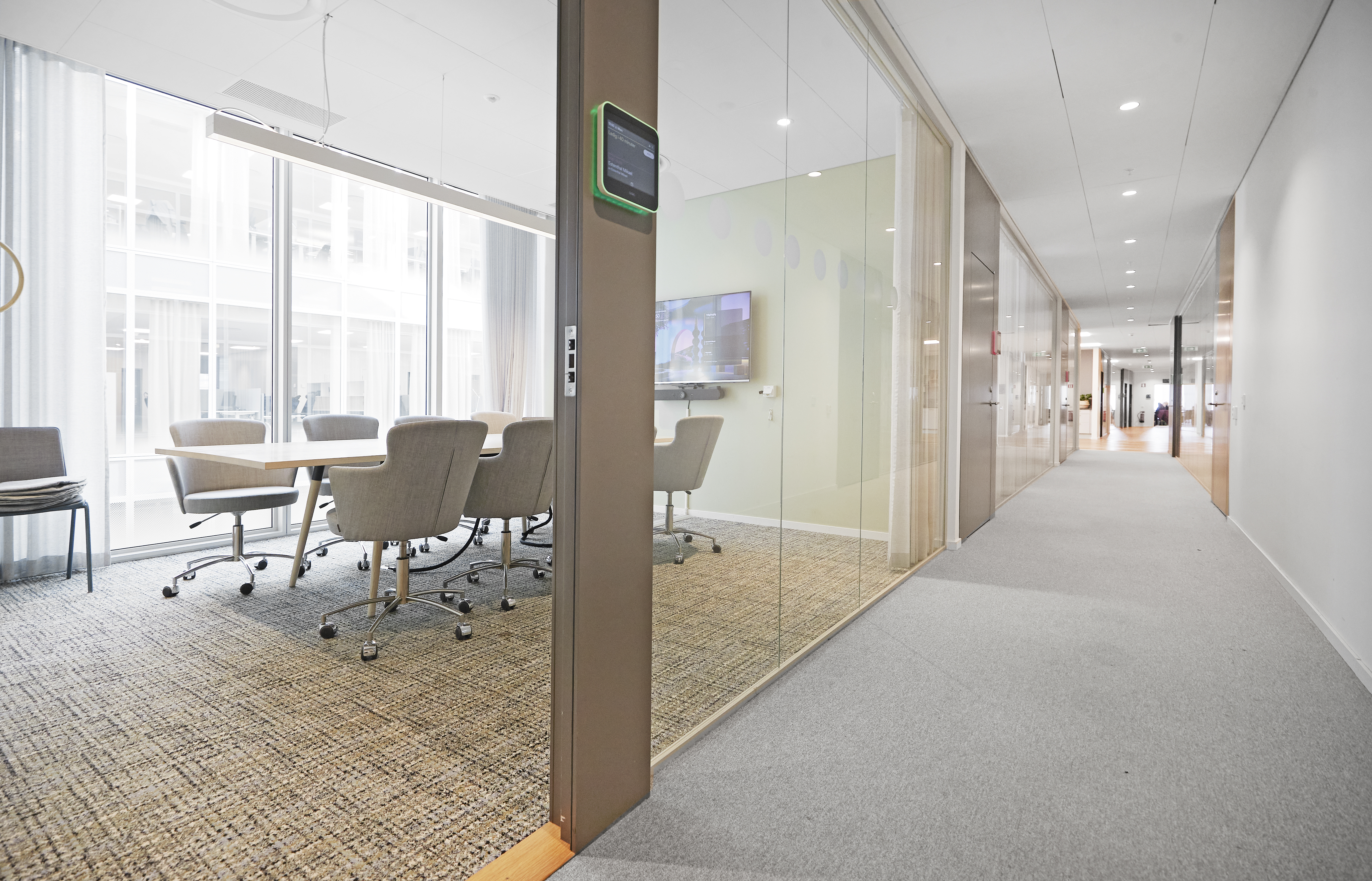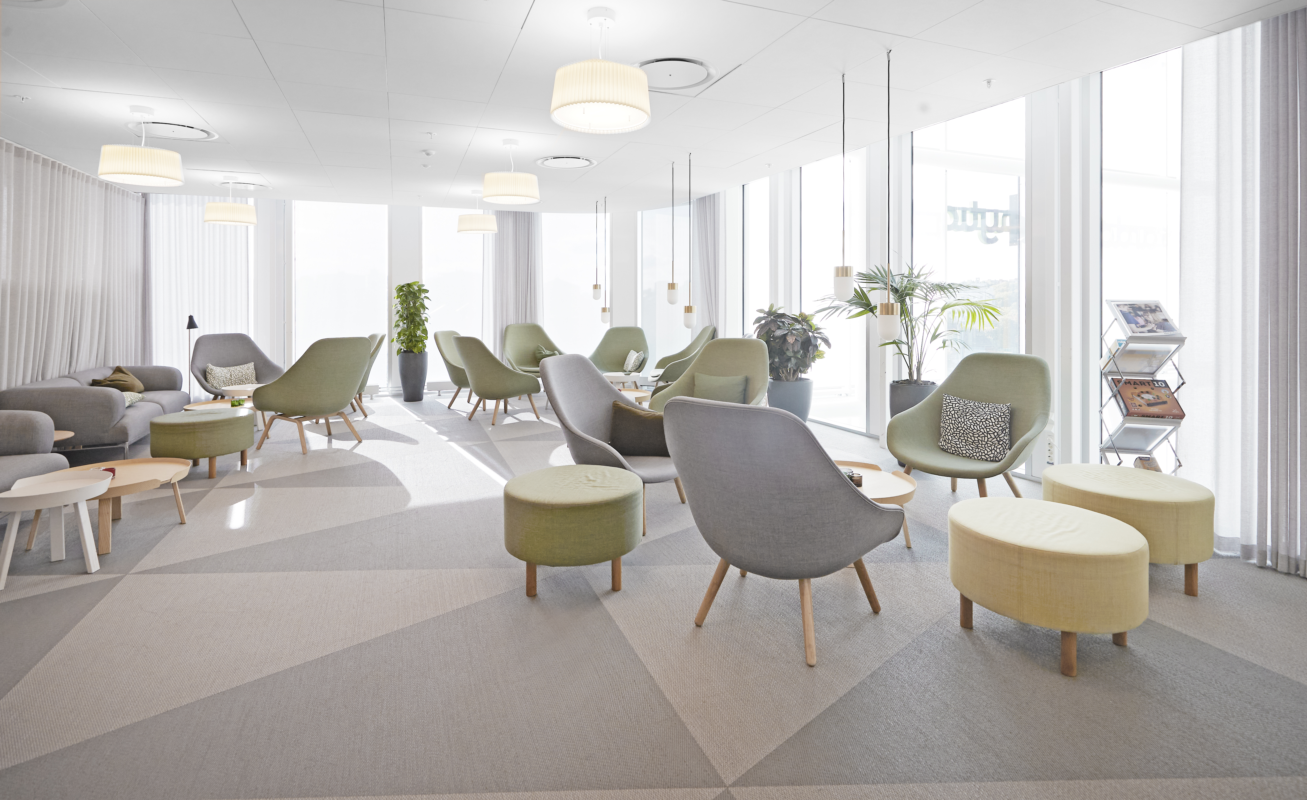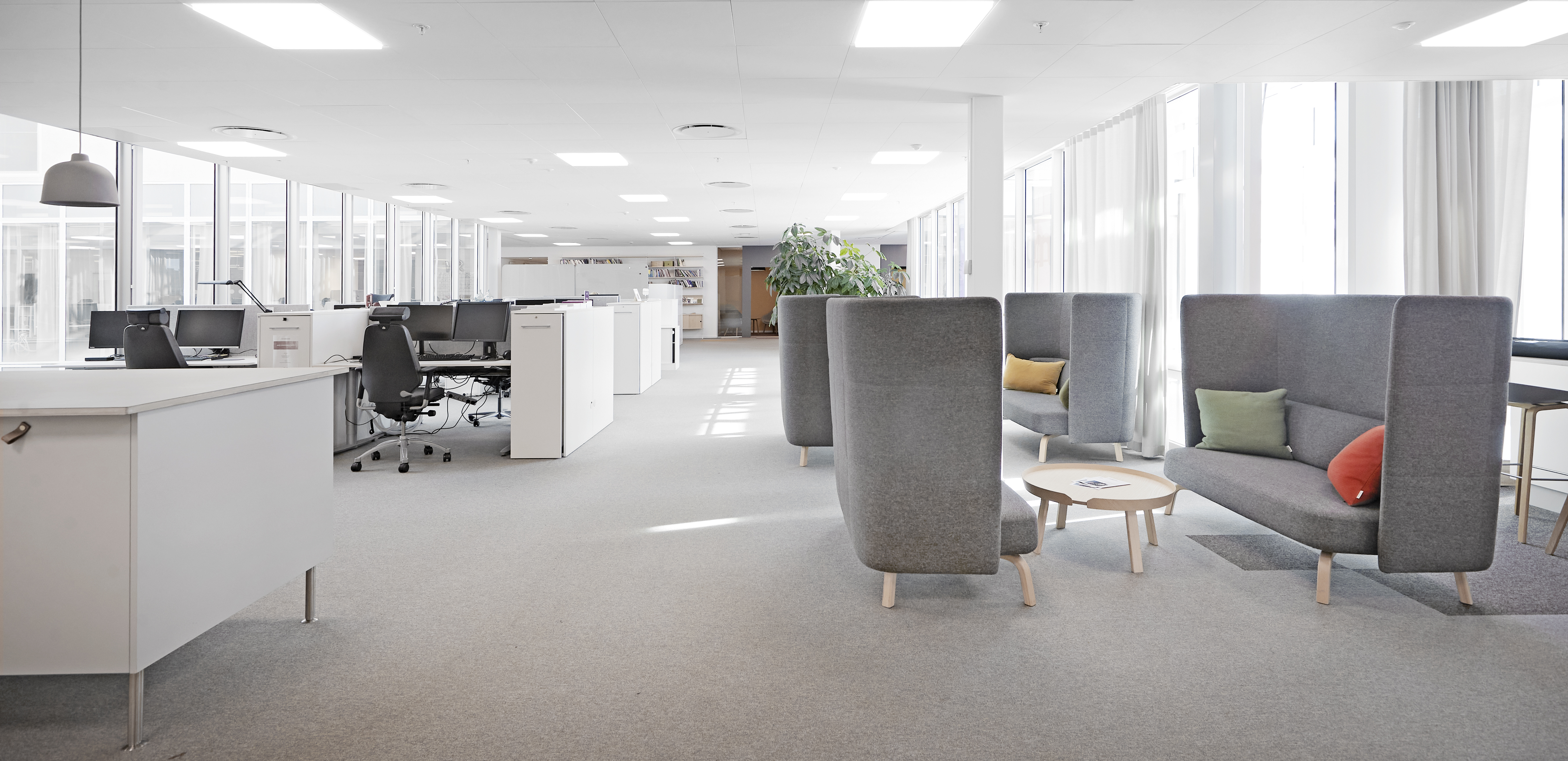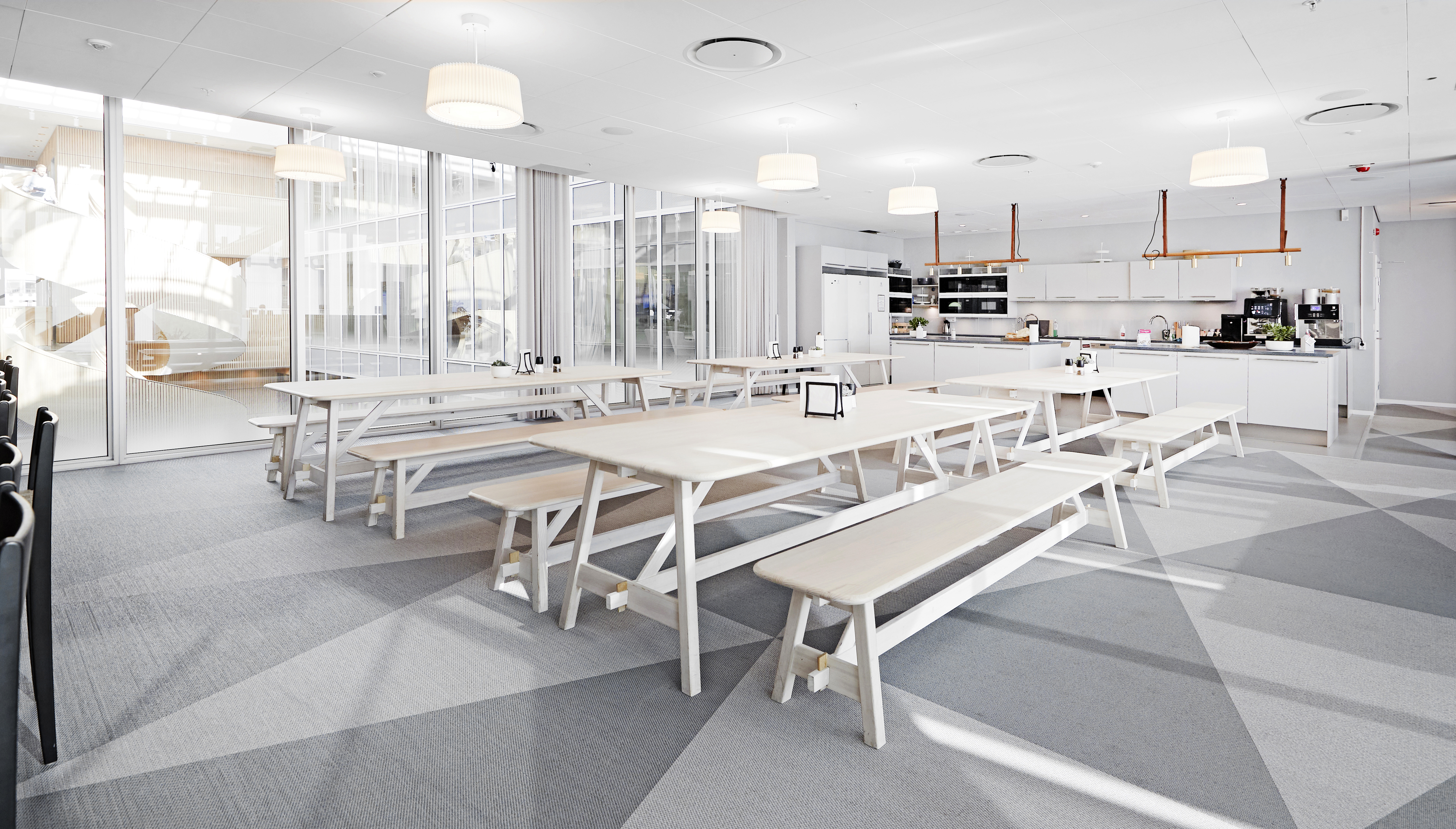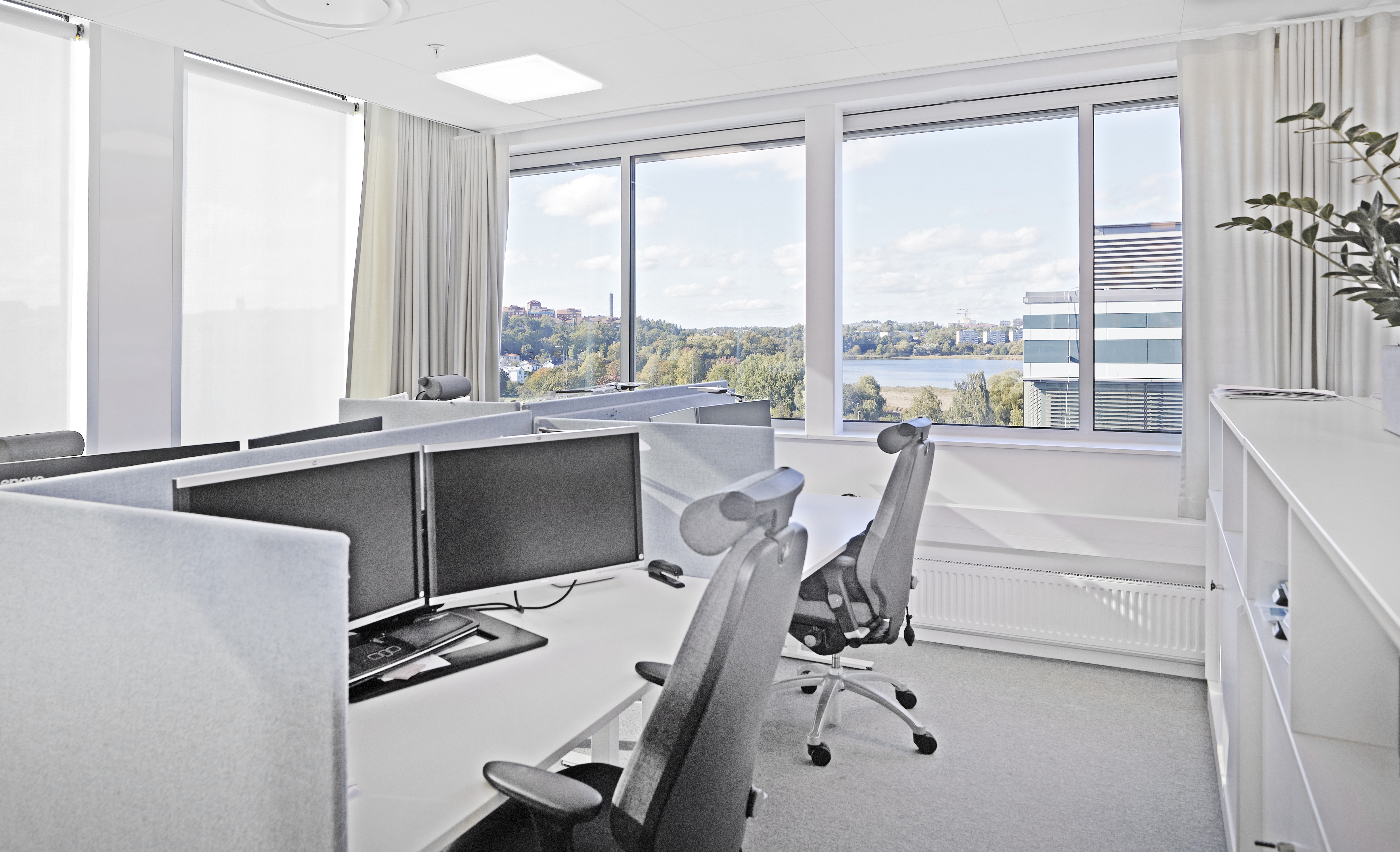 Kontorslokalen har fönster från golv till tak och ljusa, fräscha ytskikt. Vy över pulserande Evenemangsgatan på ena sidan och grönskande Råstasjön på andra. Gott om sällskapsytor ger möjlighet för anställda att umgås.