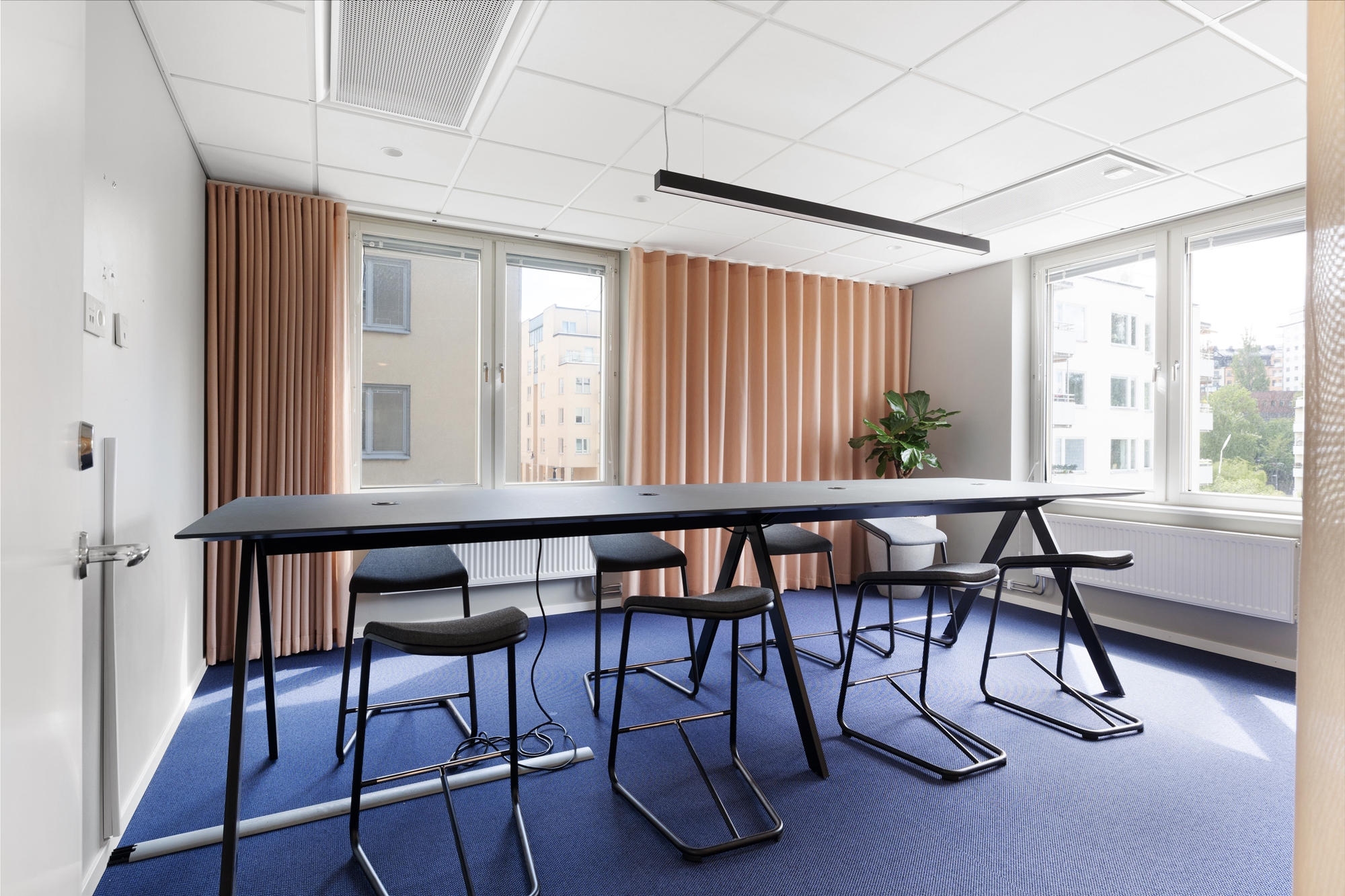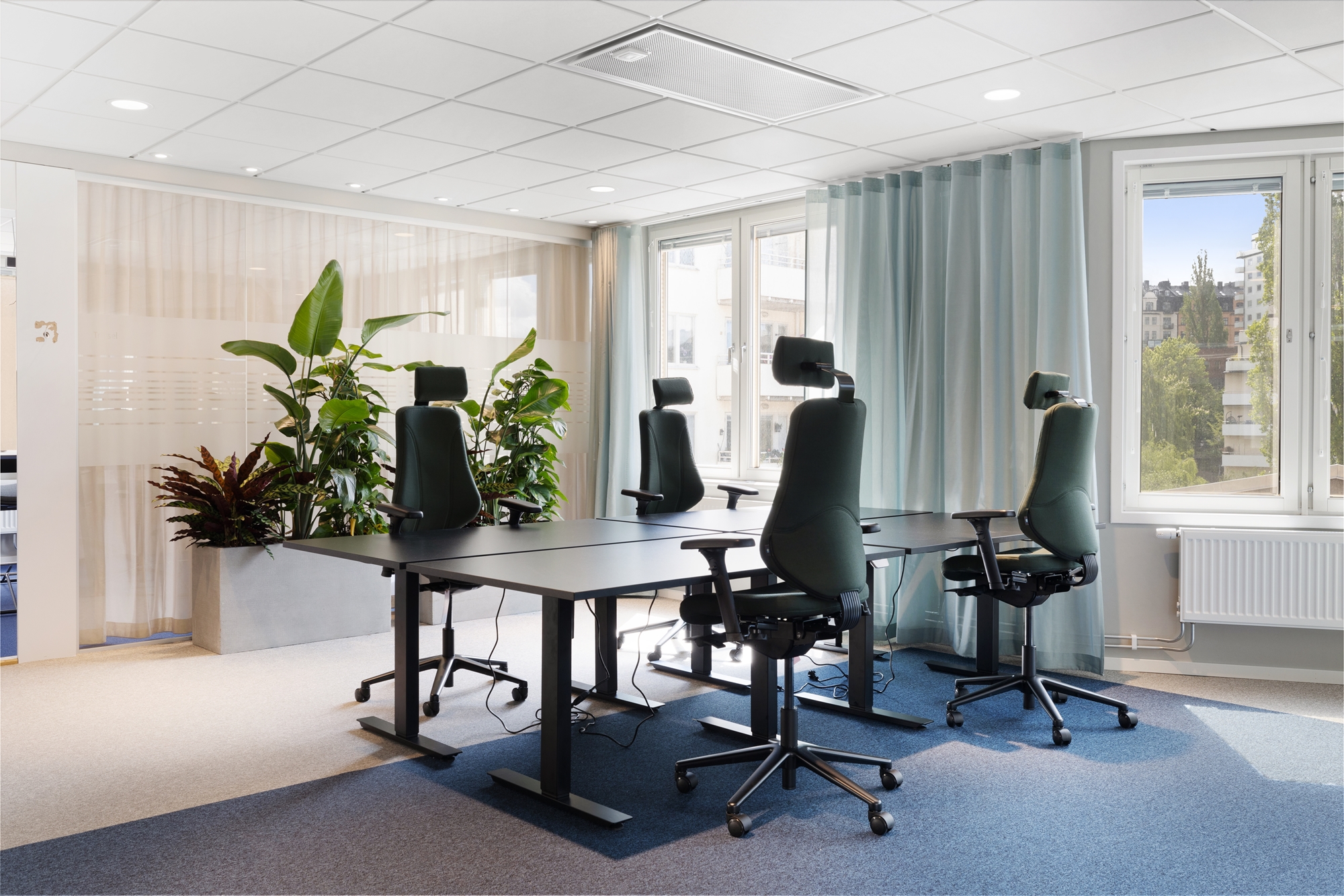 Fönsterpartierna släpper in rikligt med ljus och ger en härlig utsikt över Klara Sjö och Kungsholmen, vilket skapar en inspirerande och trivsam arbetsmiljö.