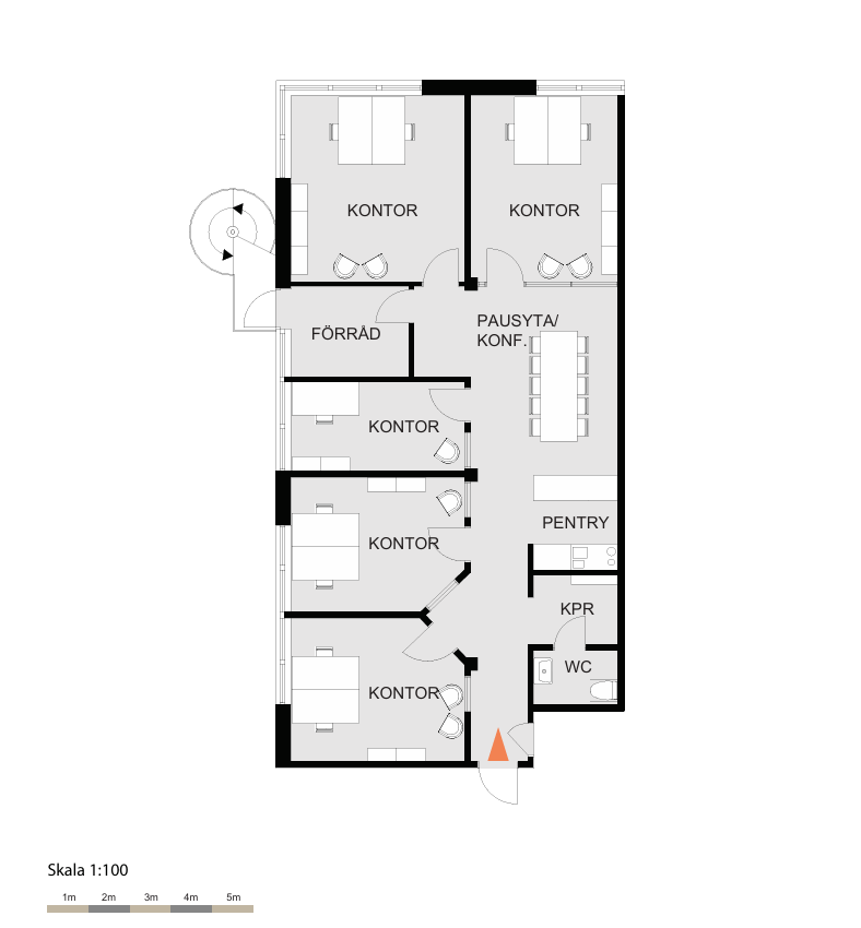 Planlösningen utgår från en central korridor från entrén och inkluderar även gemensamma ytor såsom konferensrum och pentry. Här finns även ett pausutrymme, WC samt förråd som ger goda förvaringsmöjligheter.