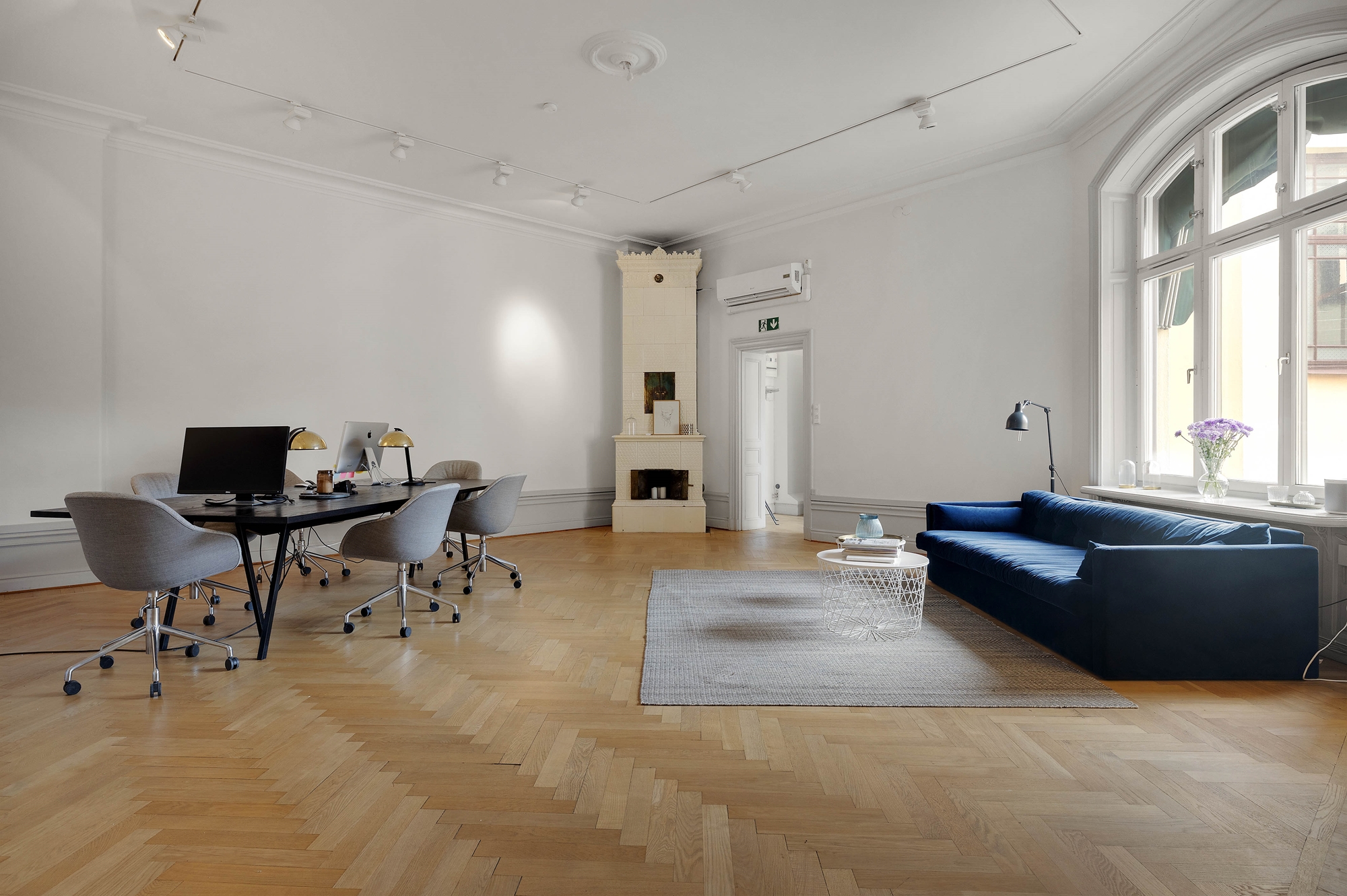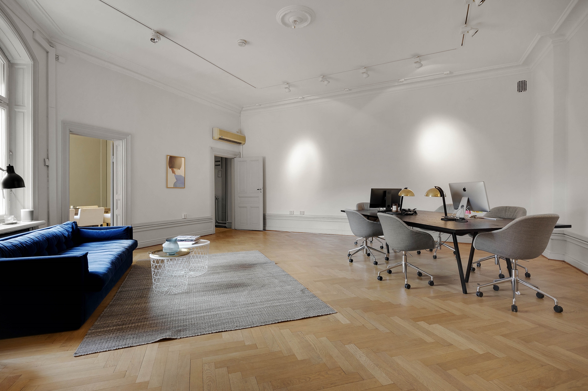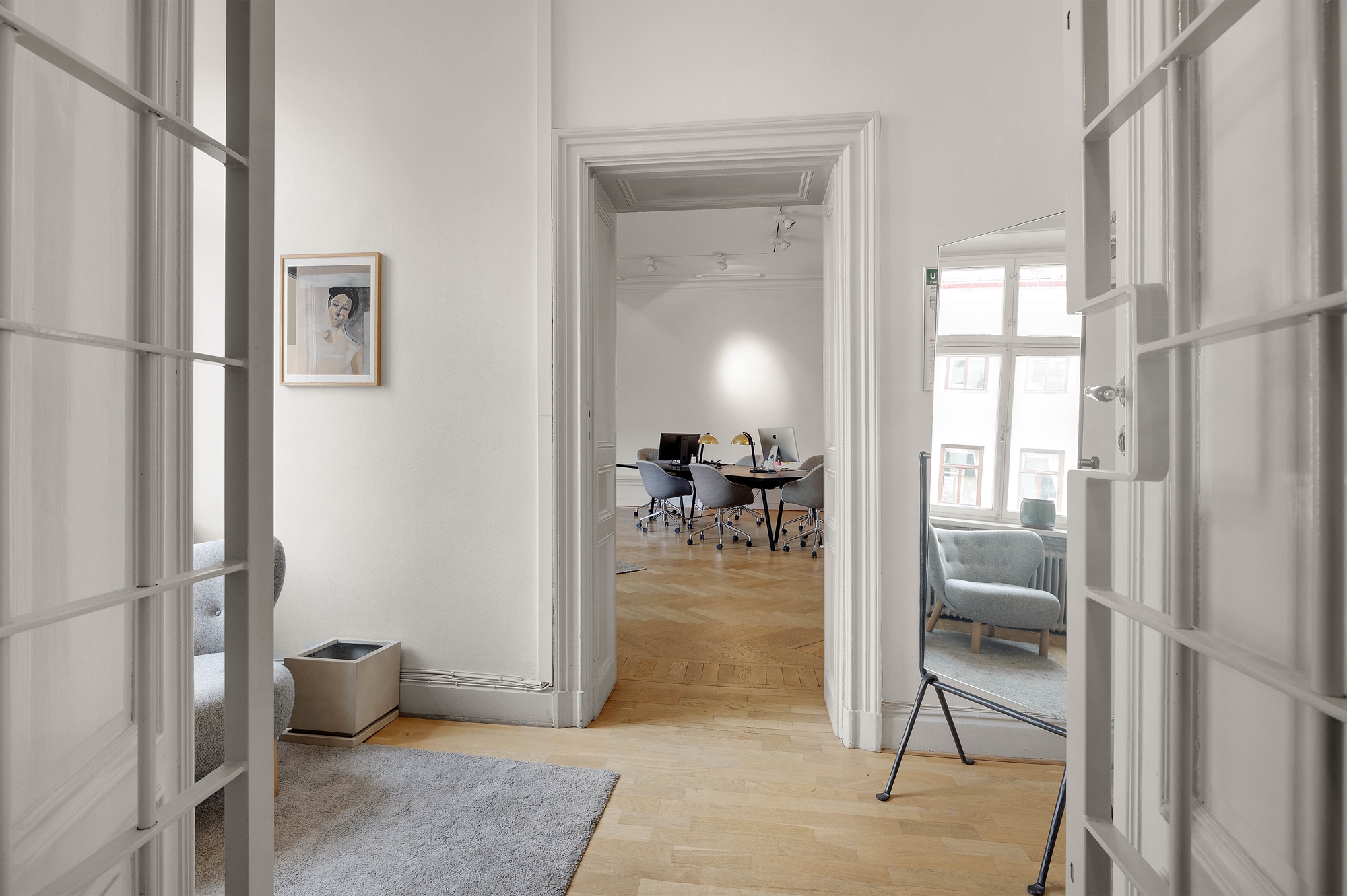 Innanför hallen möts du sedan av ett stort härligt rum med plats både för kontosbord och stolar, samt en loungeyta.