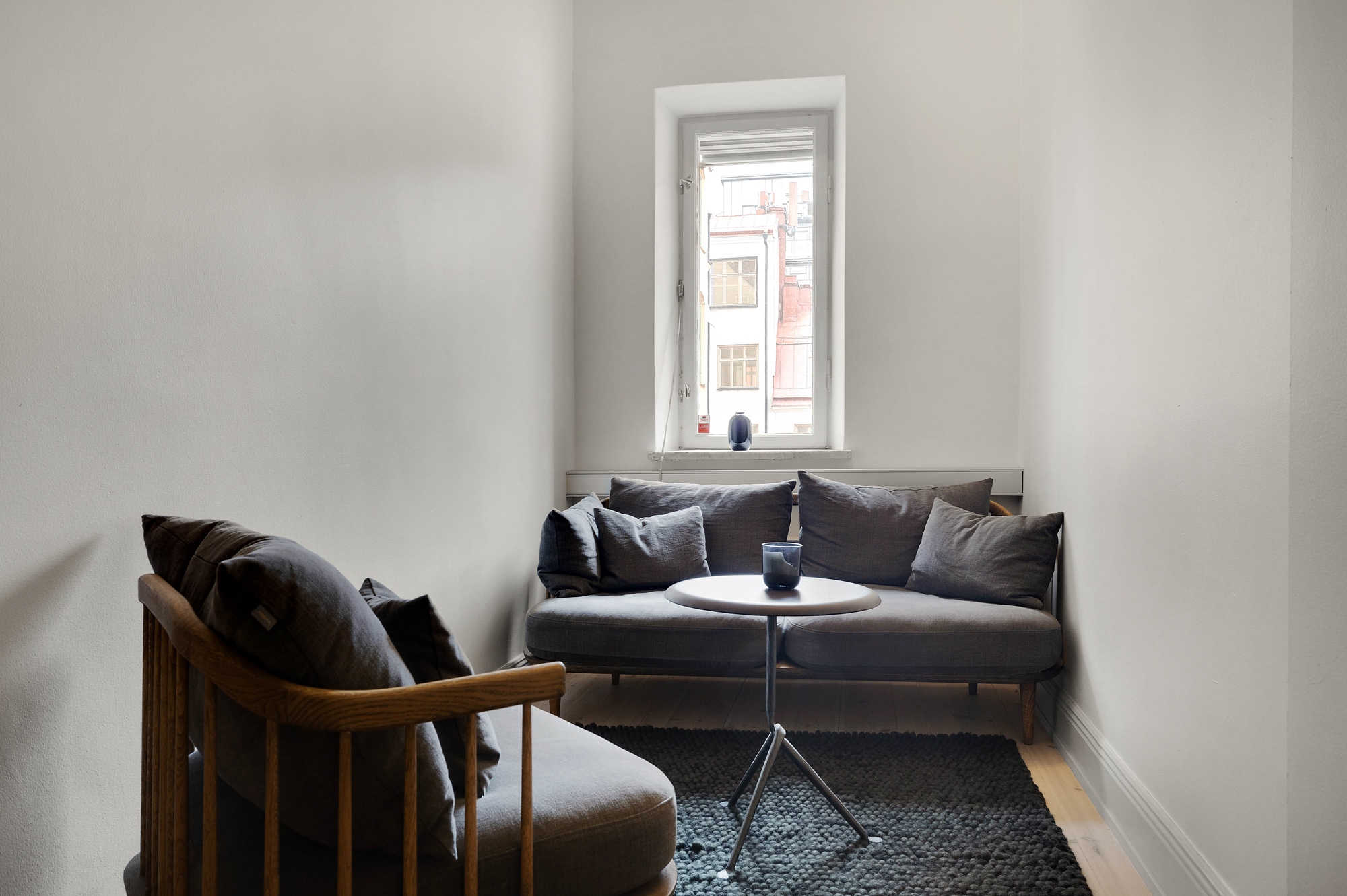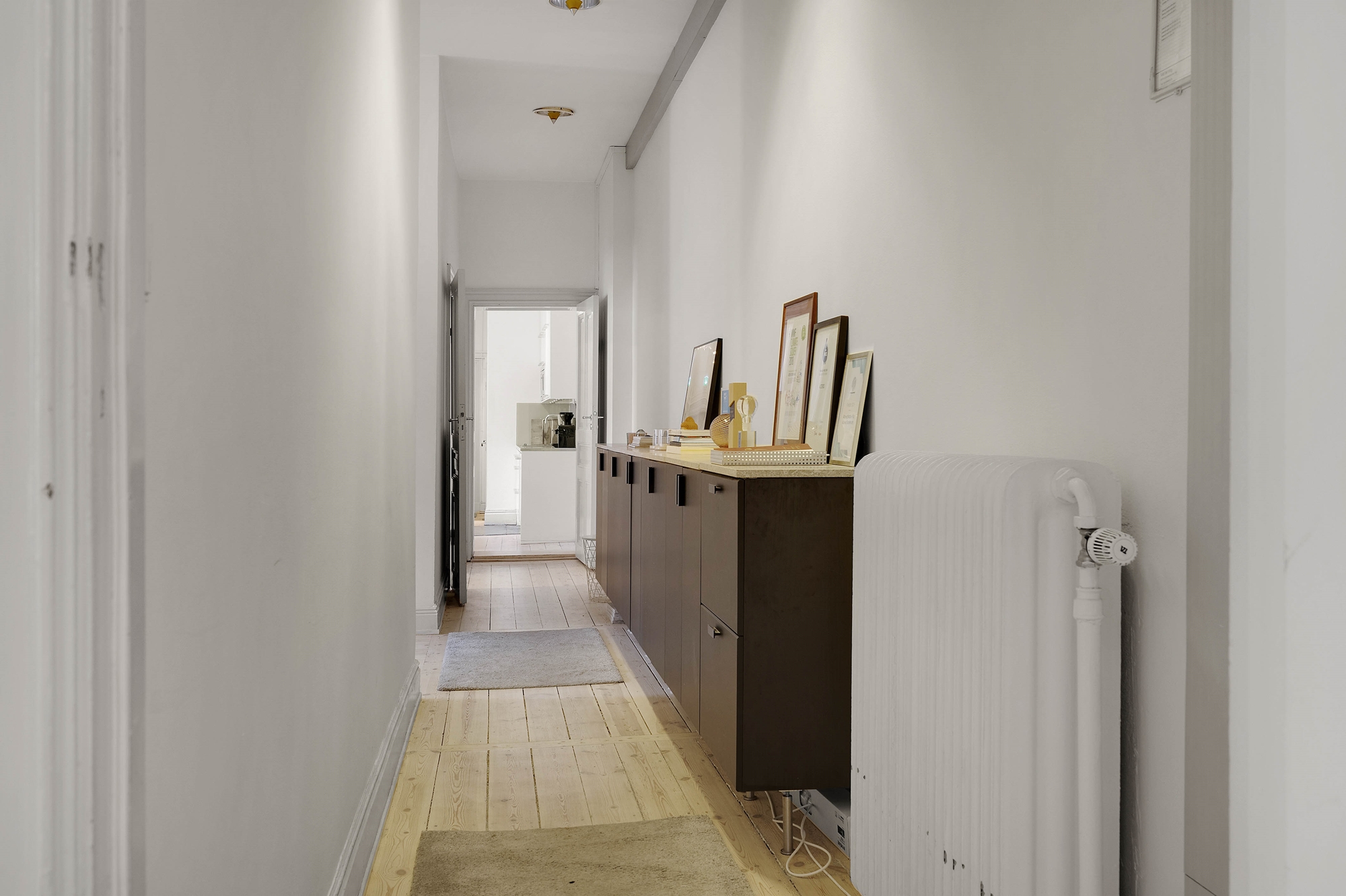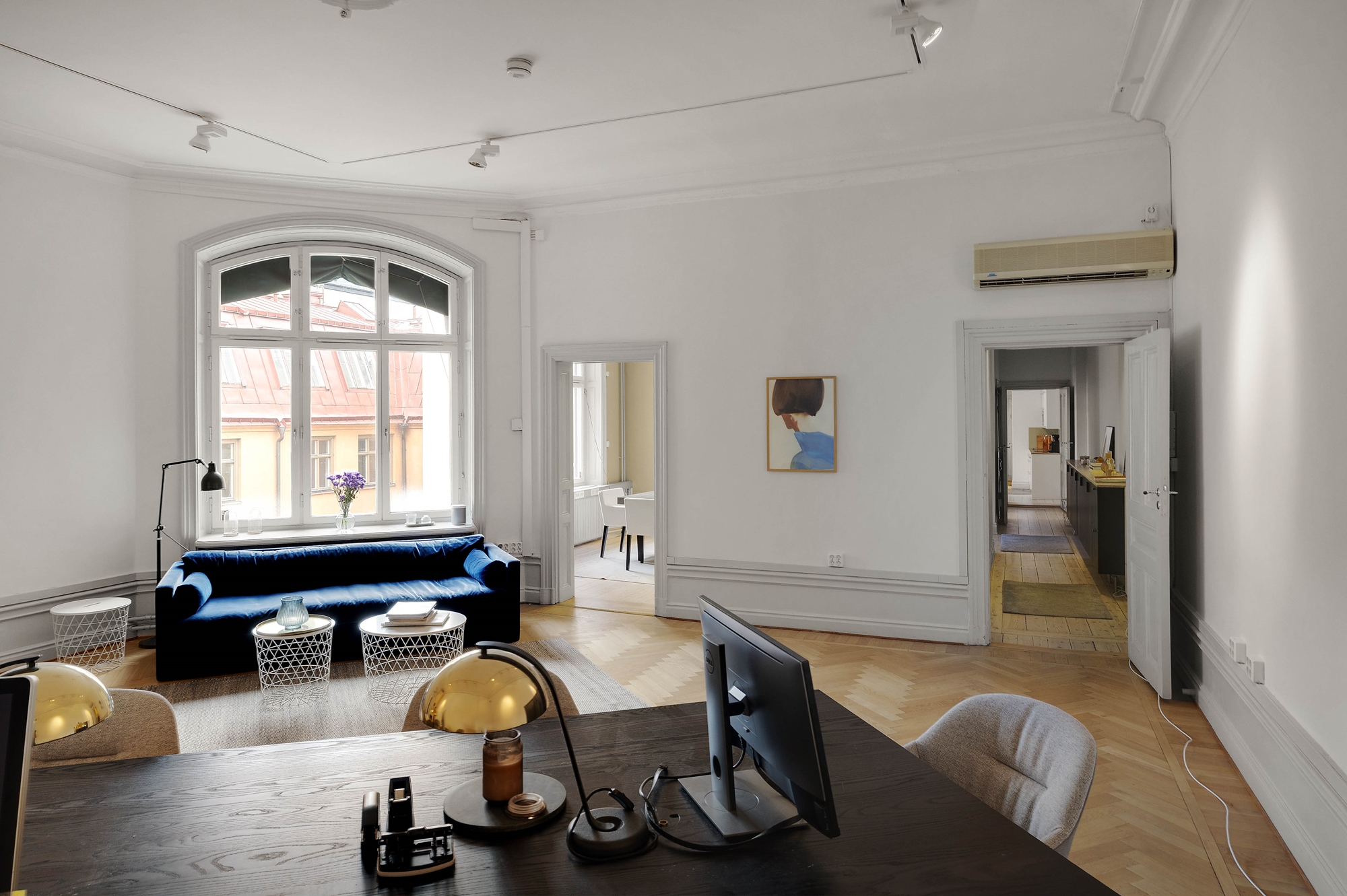 Innanför hallen möts du sedan av ett stort härligt rum med plats både för kontosbord och stolar, samt en loungeyta.