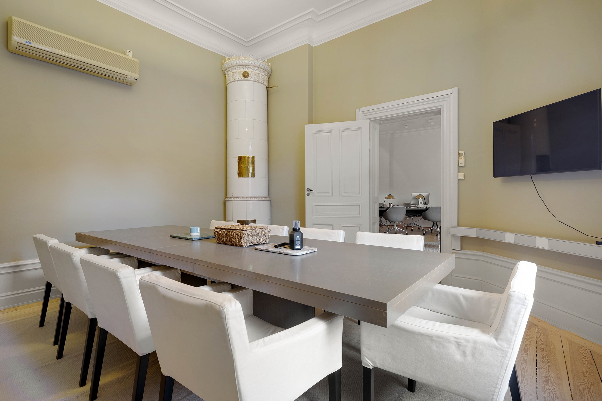 Intill kontorsrummet finns ett separat mötesrum med plats för ca 8-10 personer sittande vid långbord.