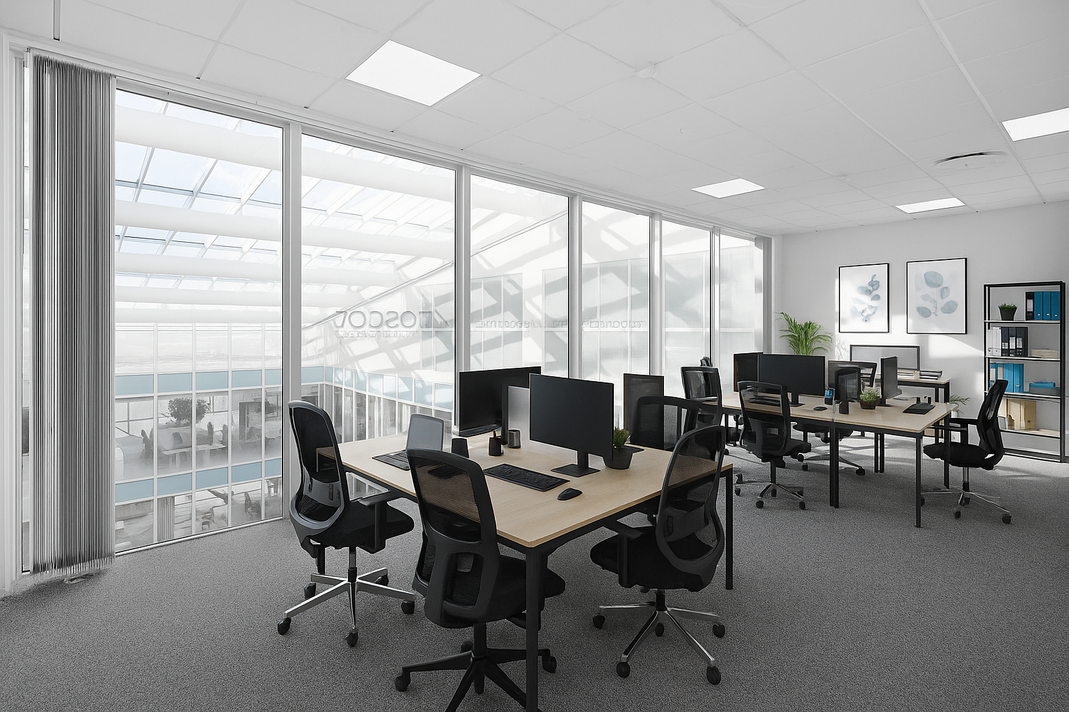 Öppen planlösning med stora fönsterpartier ut mot fastighetens ljusgård. Takfönster ger en unik vy och ljusinsläpp.