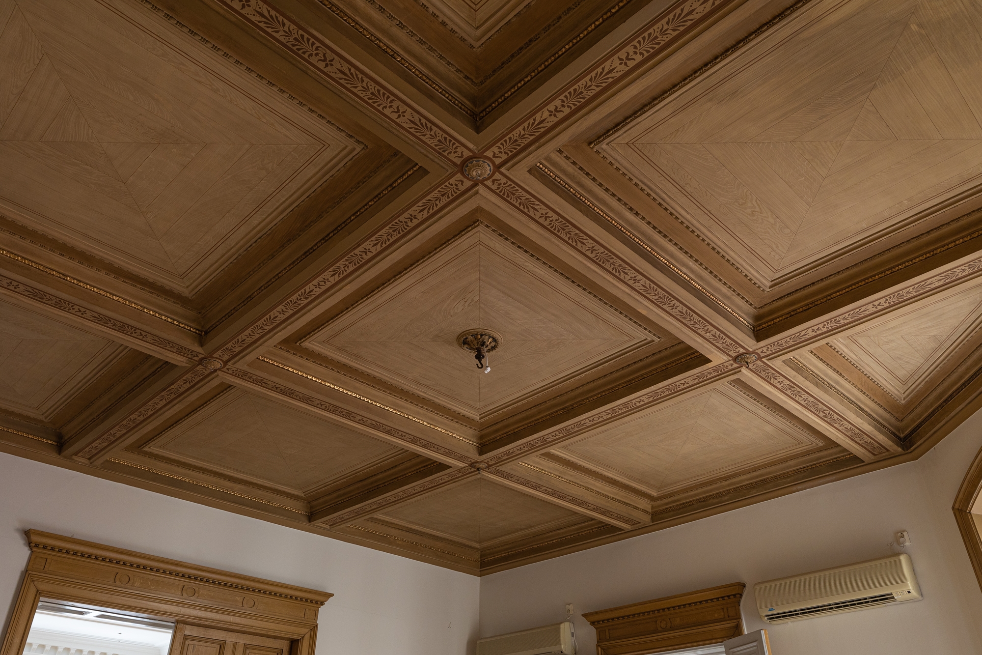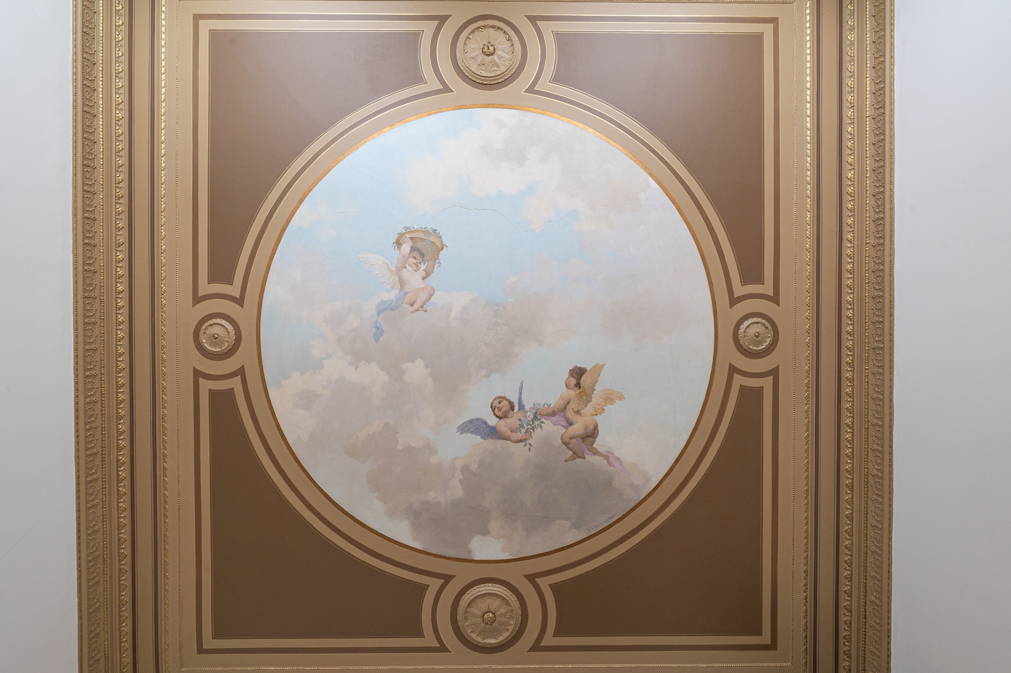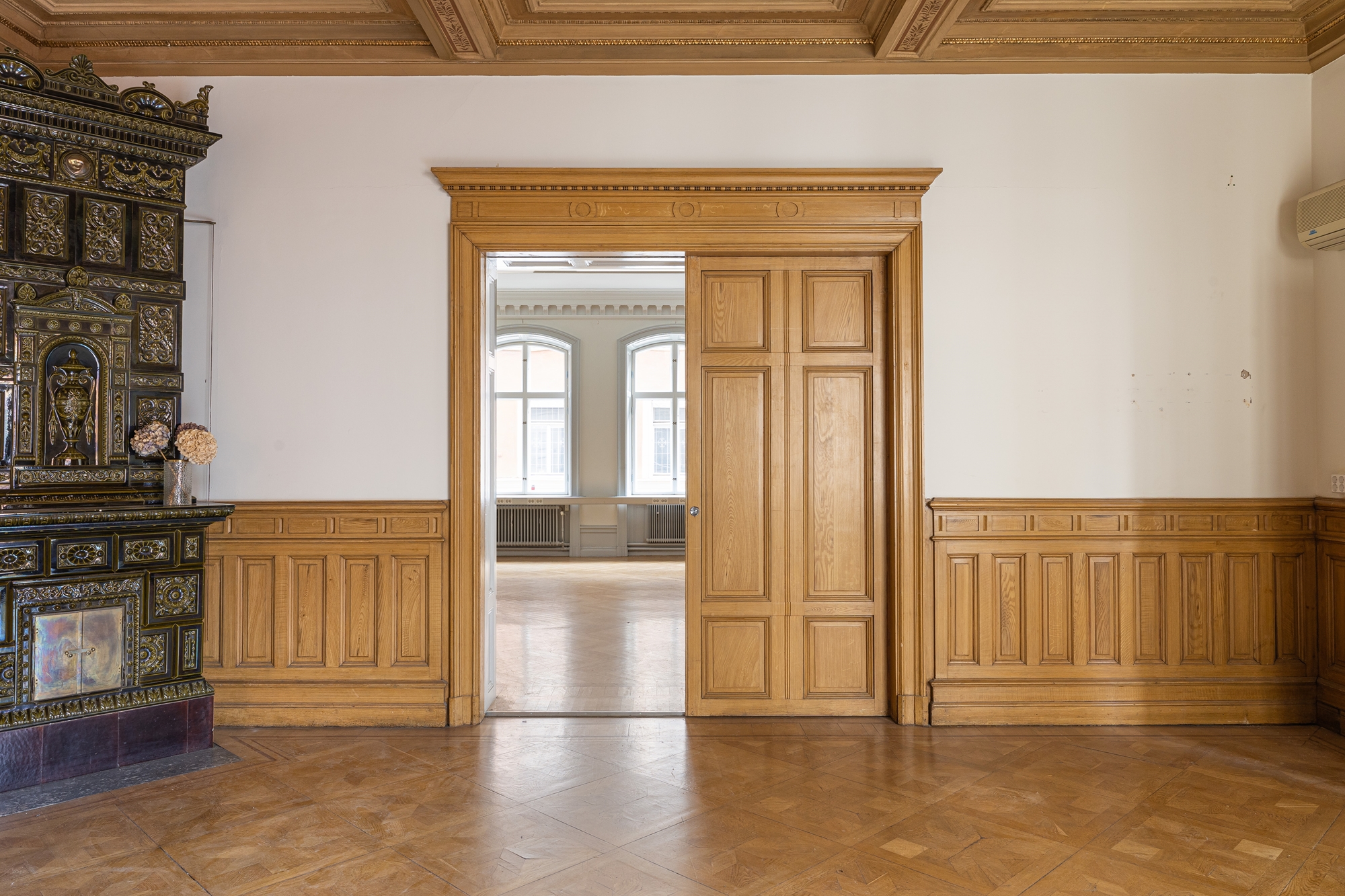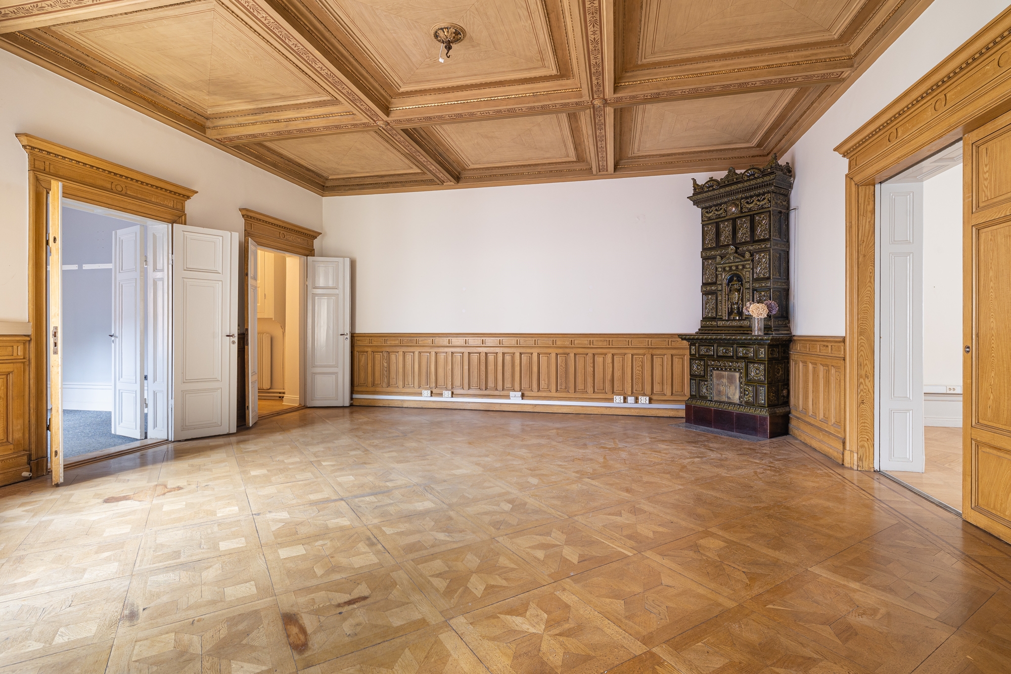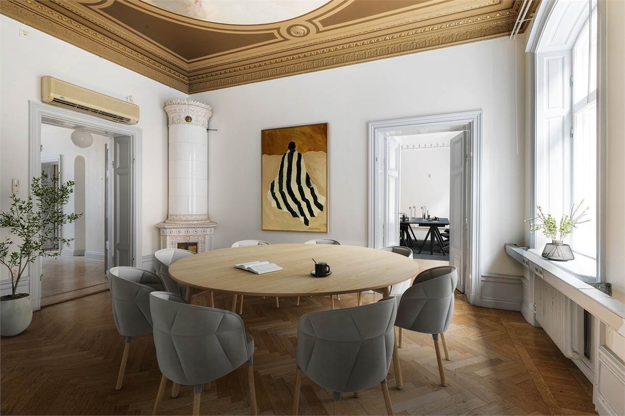 Vidare har du, intill entrén, ett separat mötes/kontorsrum med en vacker takmålning av KG Wetterstrand och kakelugn.