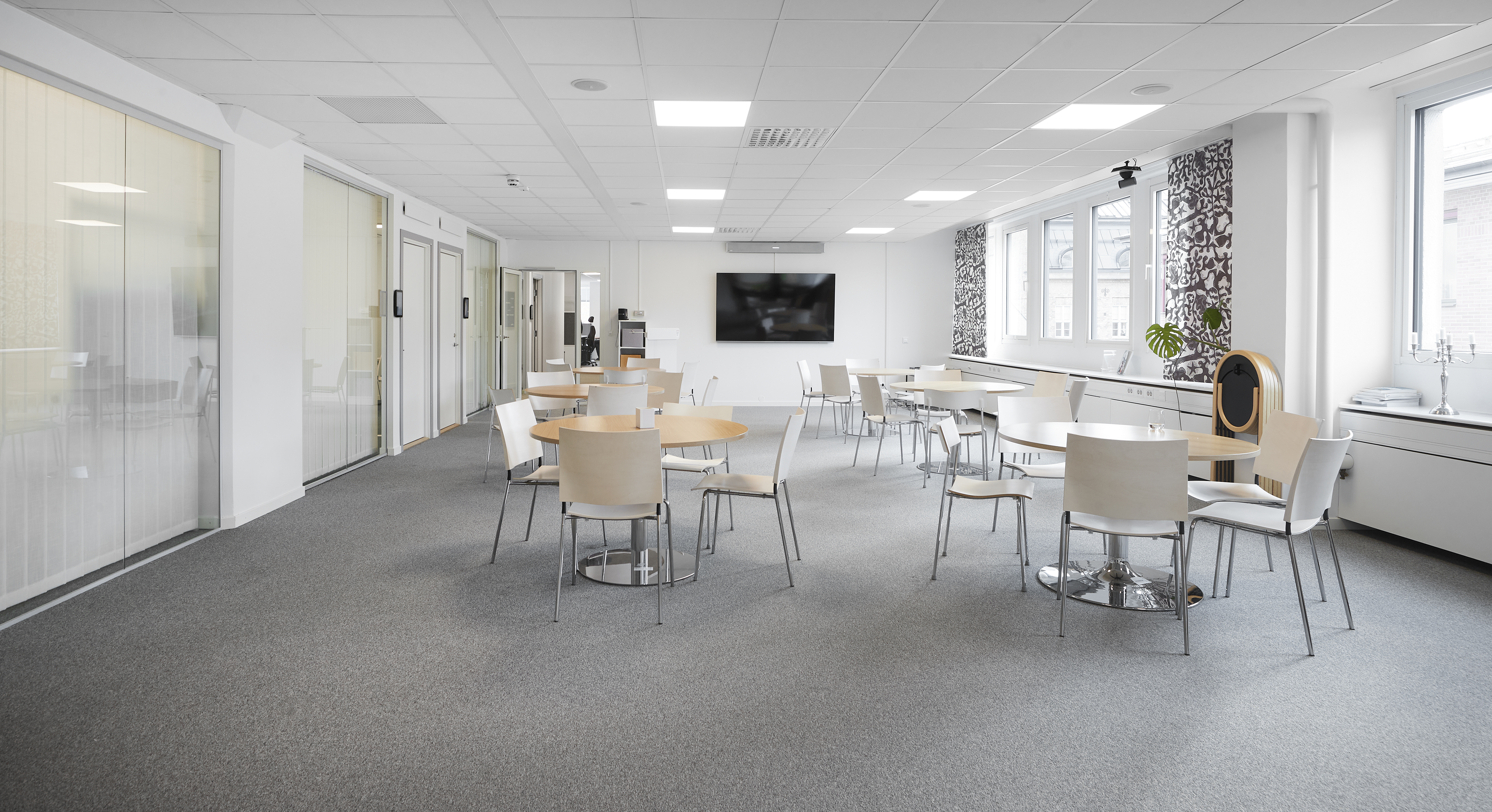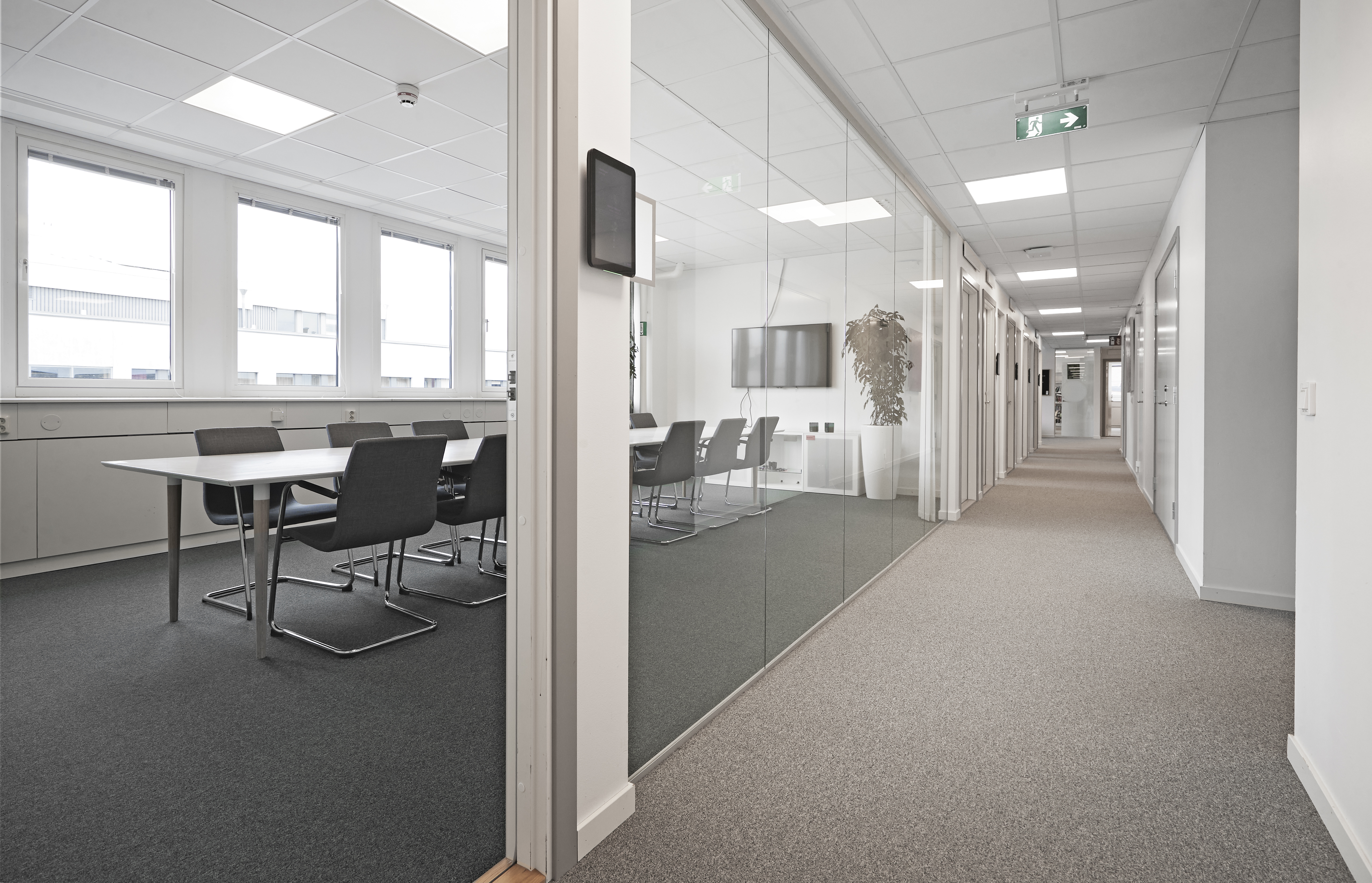 Här får ni hela planet för er själva med plats för 88 arbetsplatser. Två entréer gör att kunder kan gå in åt ett håll och personalen åt ett annat. Planet är pelarbyggt och kan anpassas efter företagets behov.