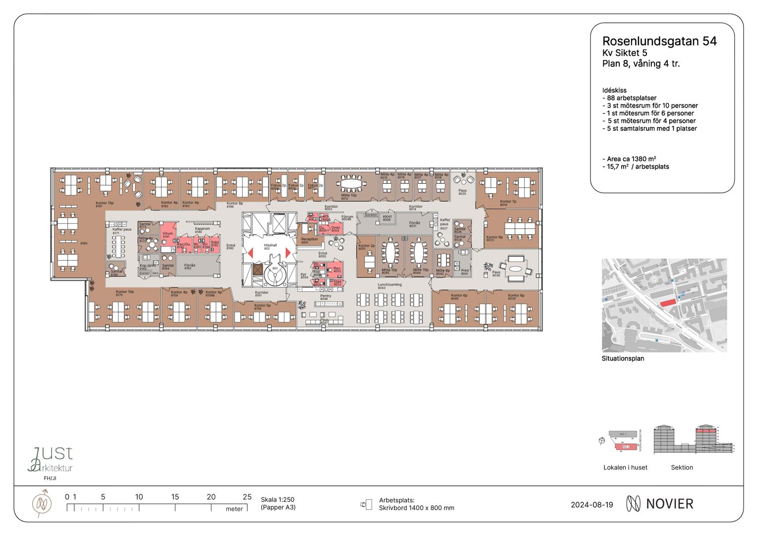 Lokalen innehåller kontorsrum, mötesytor, pentry, lunchrum samt WC. Hisshall i centrum av lokalen ger god åtkomst till hela ytan.