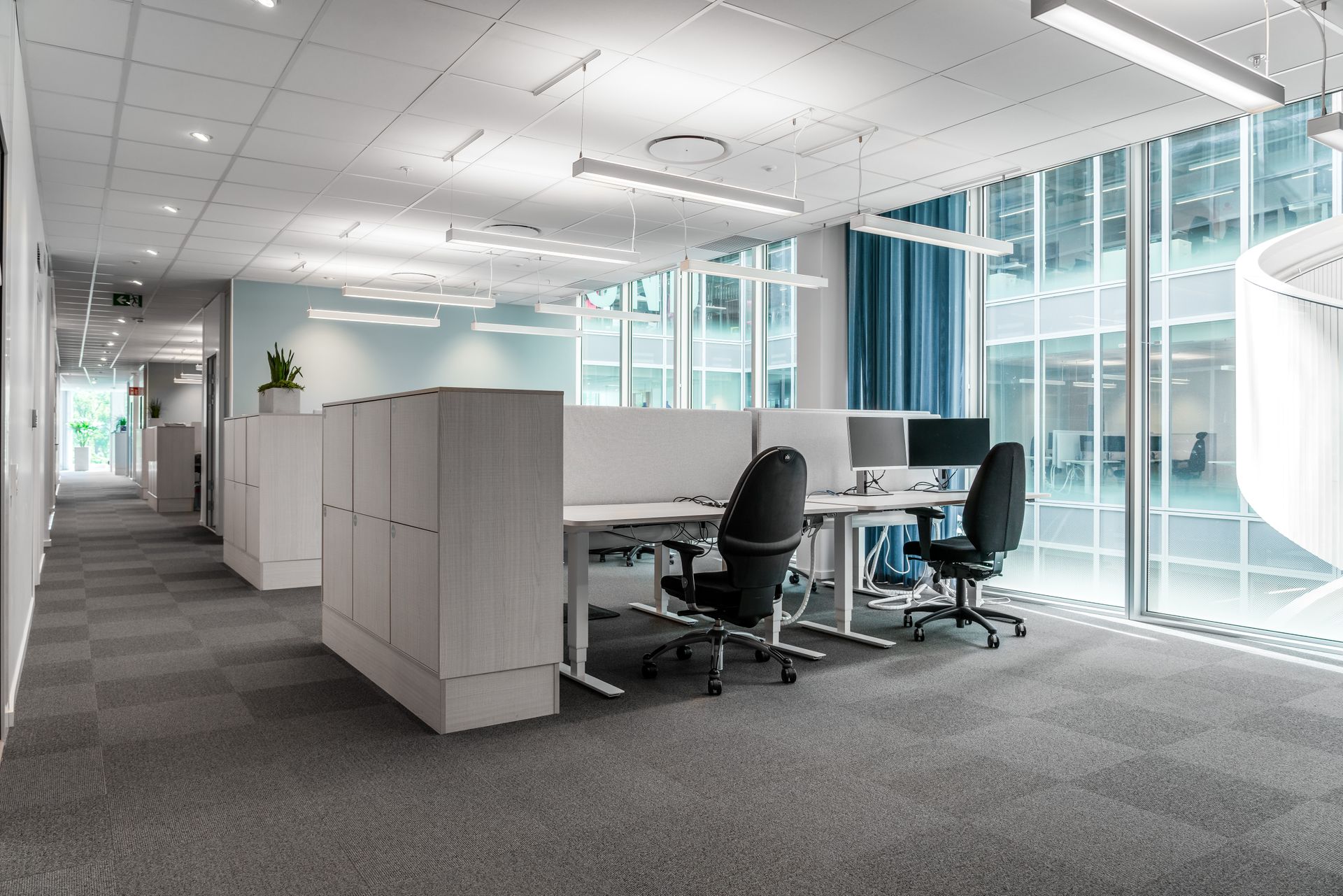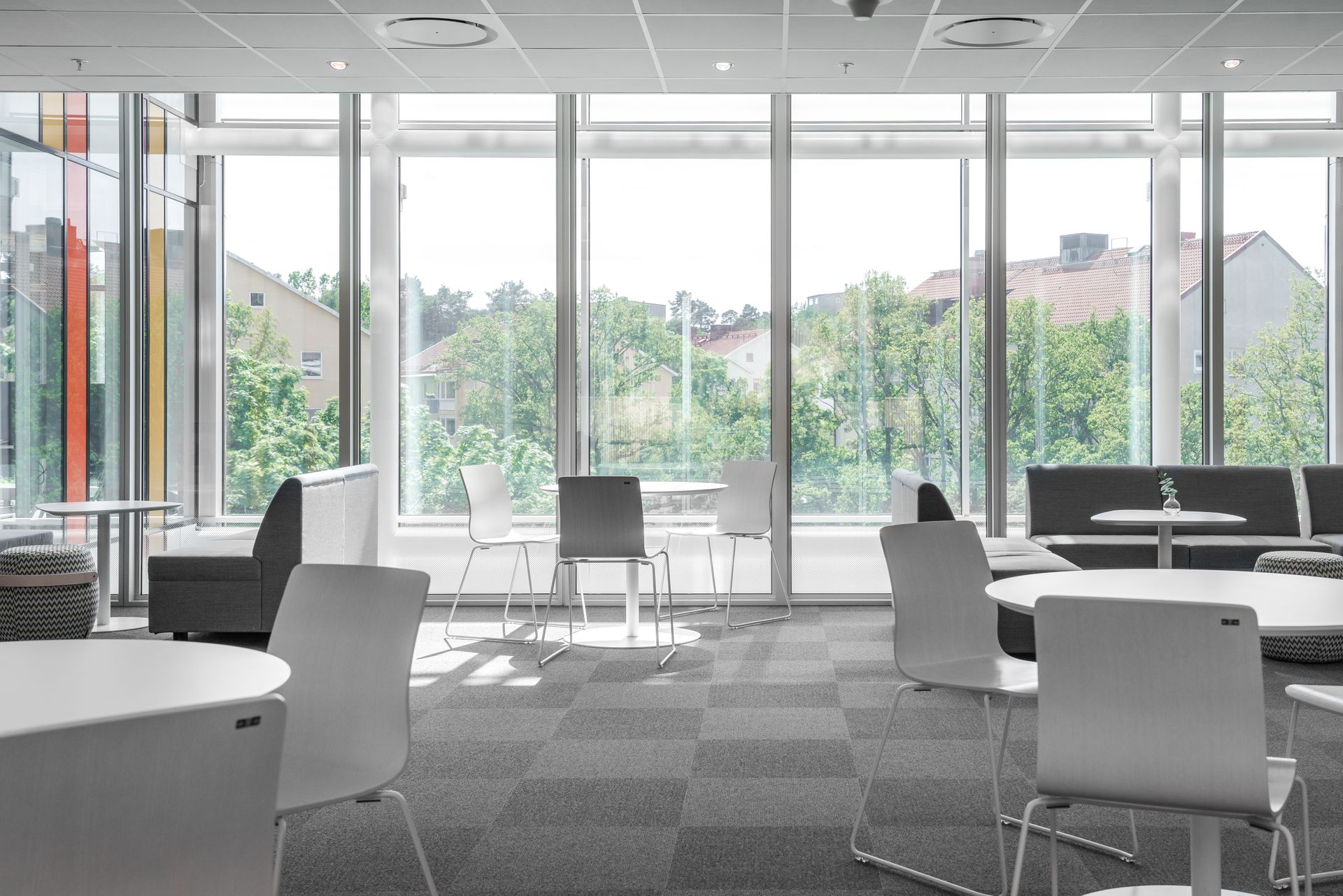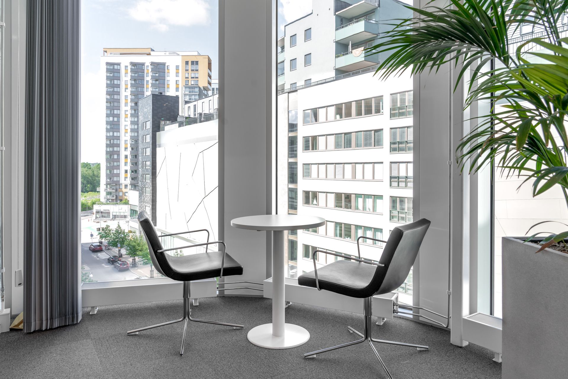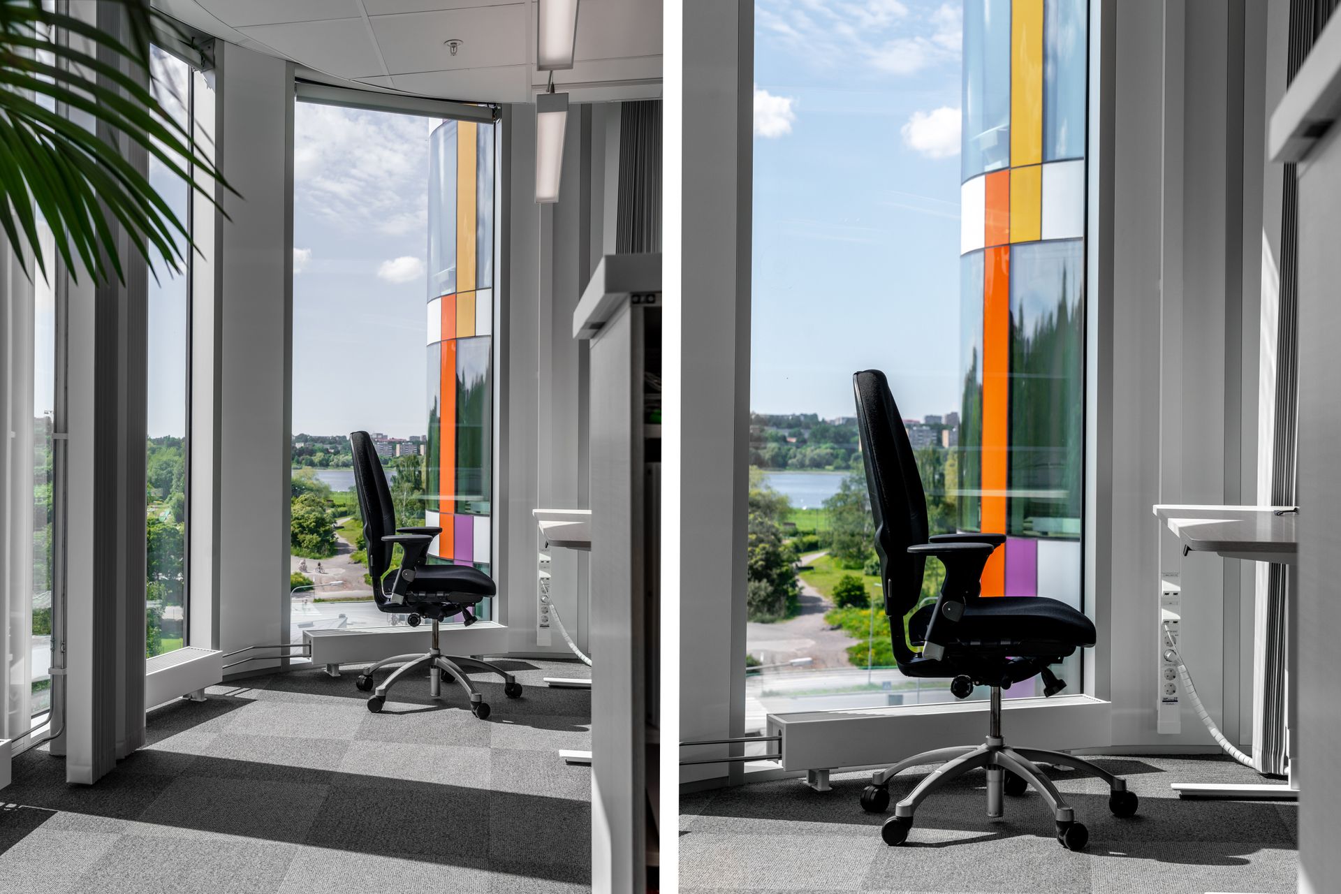 Kontorslokalen har fönster från golv till tak och ljusa, fräscha ytskikt. Vy över pulserande Evenemangsgatan på ena sidan och grönskande Råstasjön på andra. Gott om sällskapsytor ger möjlighet för anställda att umgås.