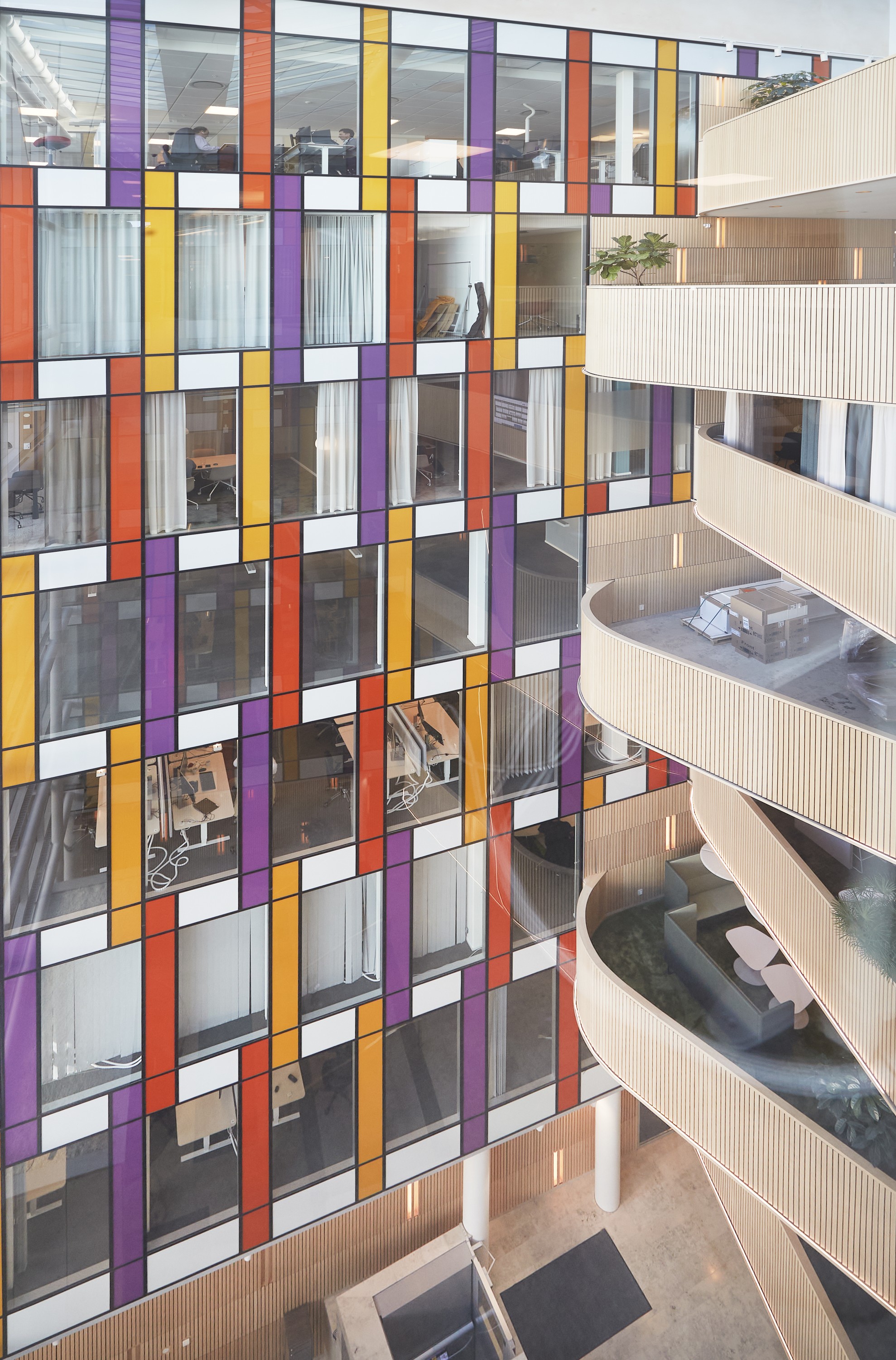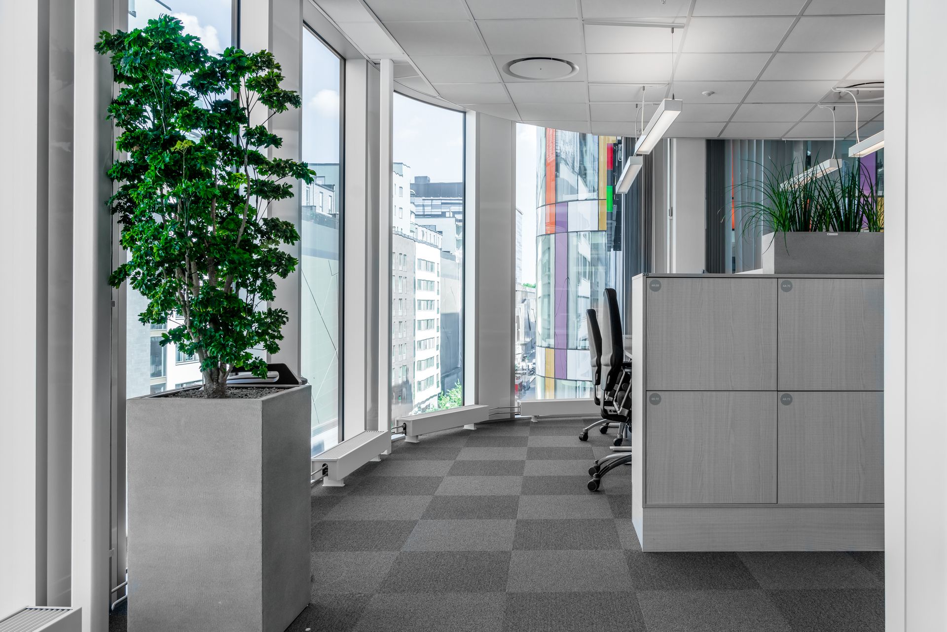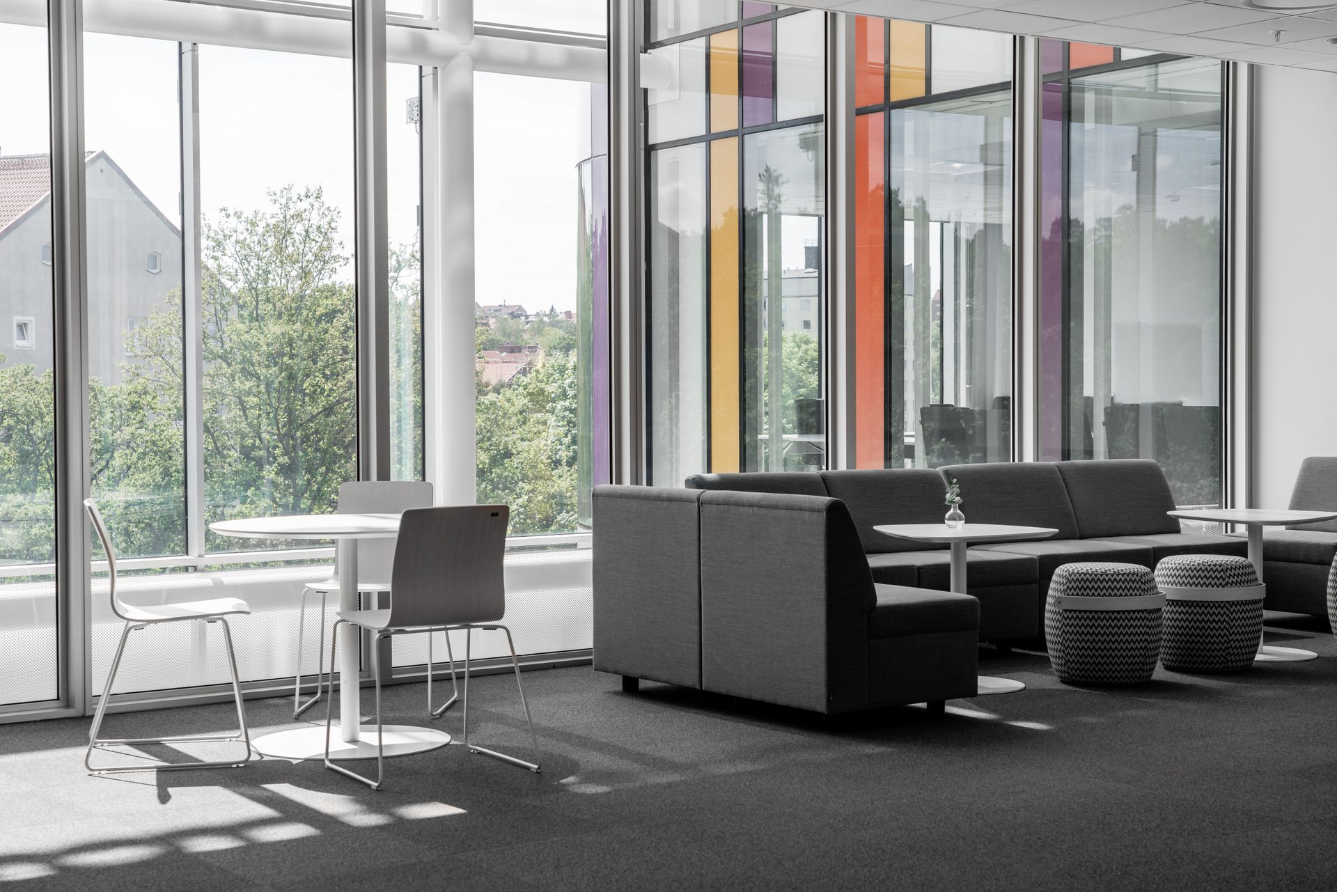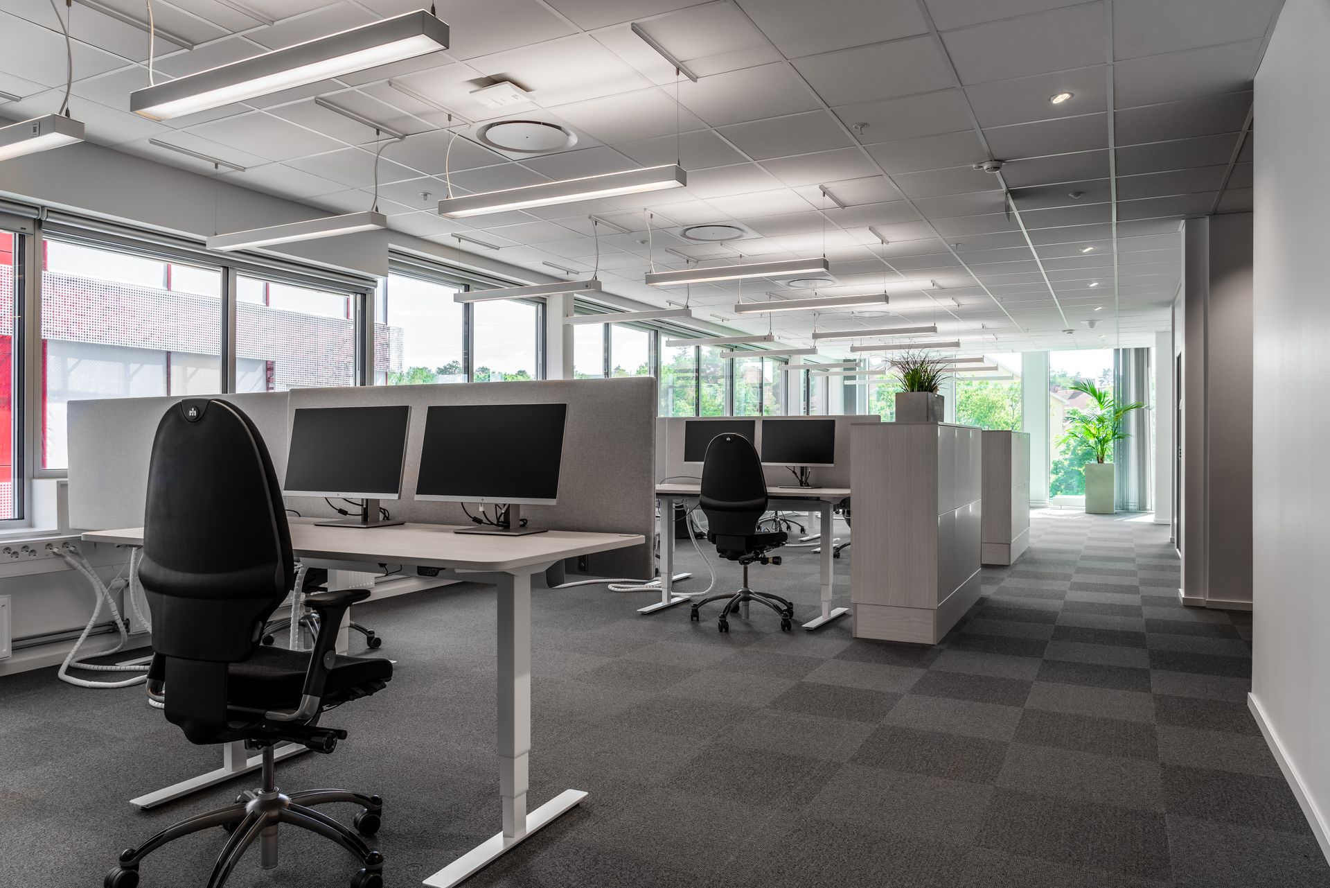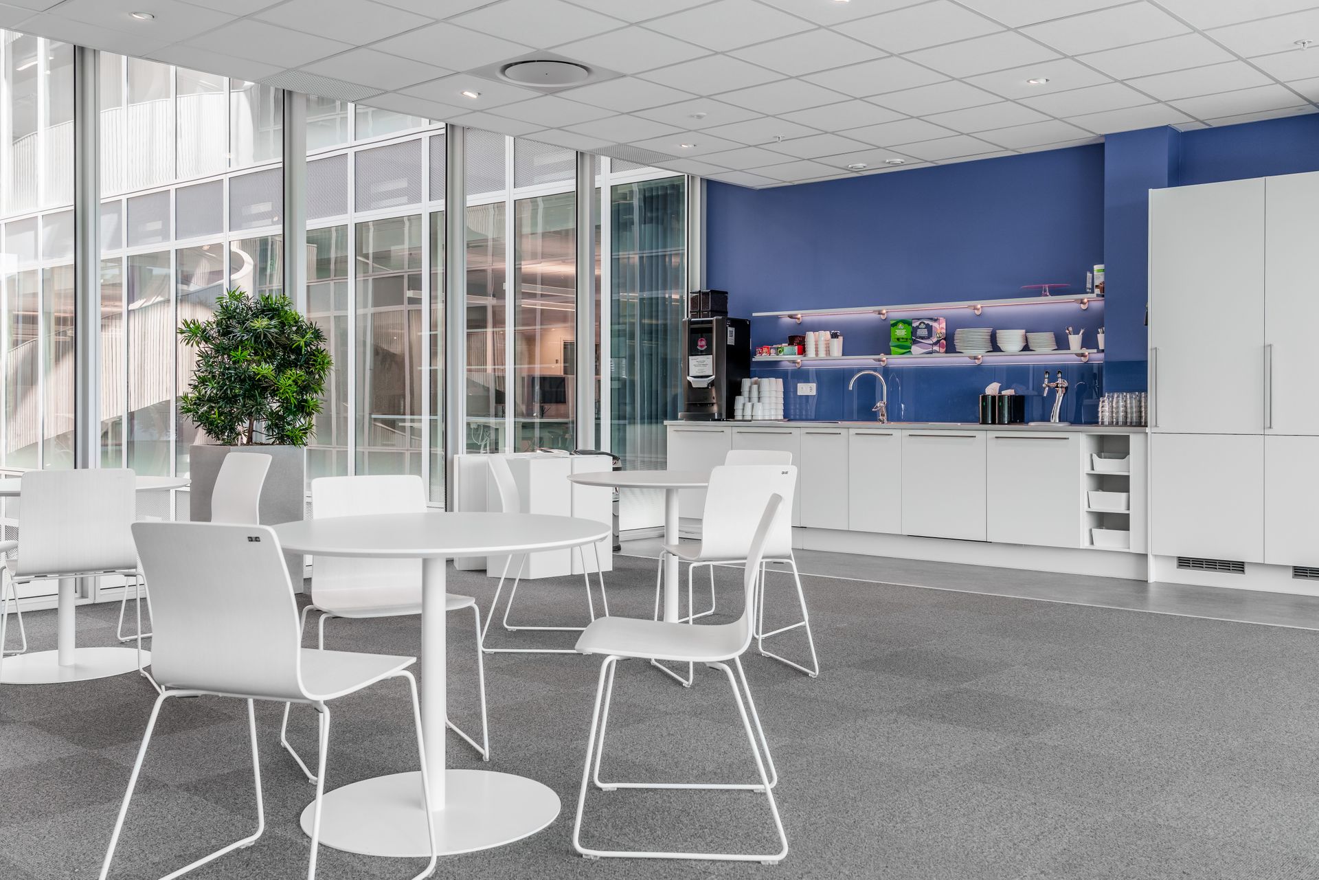 Kontorslokalen har fönster från golv till tak och ljusa, fräscha ytskikt. Vy över pulserande Evenemangsgatan på ena sidan och grönskande Råstasjön på andra. Gott om sällskapsytor ger möjlighet för anställda att umgås.