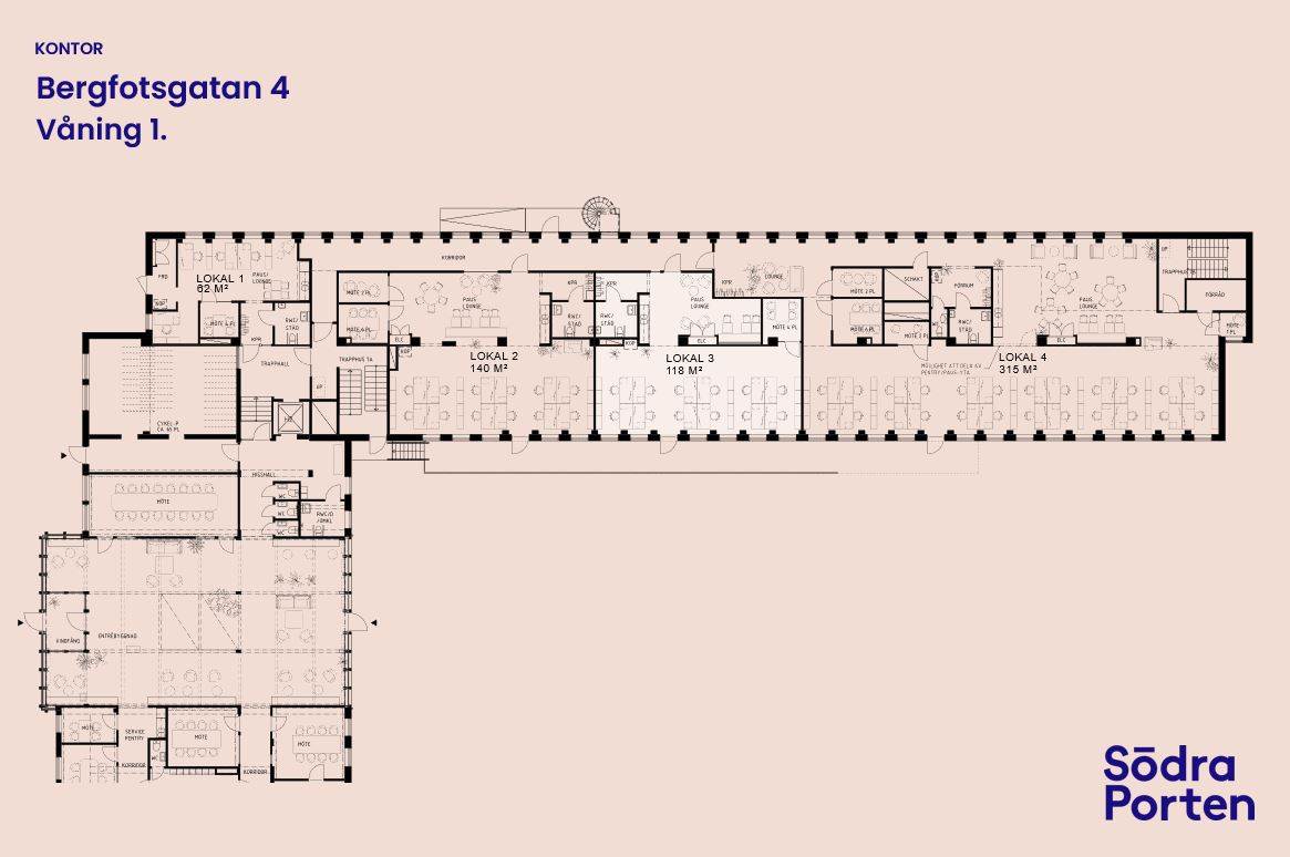 Detta är en del av vårt nya koncept Flexkontor, där vi erbjuder mindre kontorsytor med kortare eller mer flexibla hyresavtal. Varje kontor är utrustat med eget pentry, toalett och ett mindre mötesrum. Utöver detta har ni tillgång till gemensamma faciliteter såsom större mötesrum, omklädningsrum och cykelrum som nås via entrén.