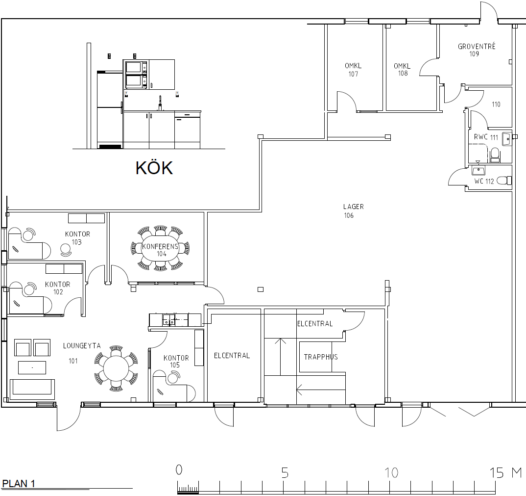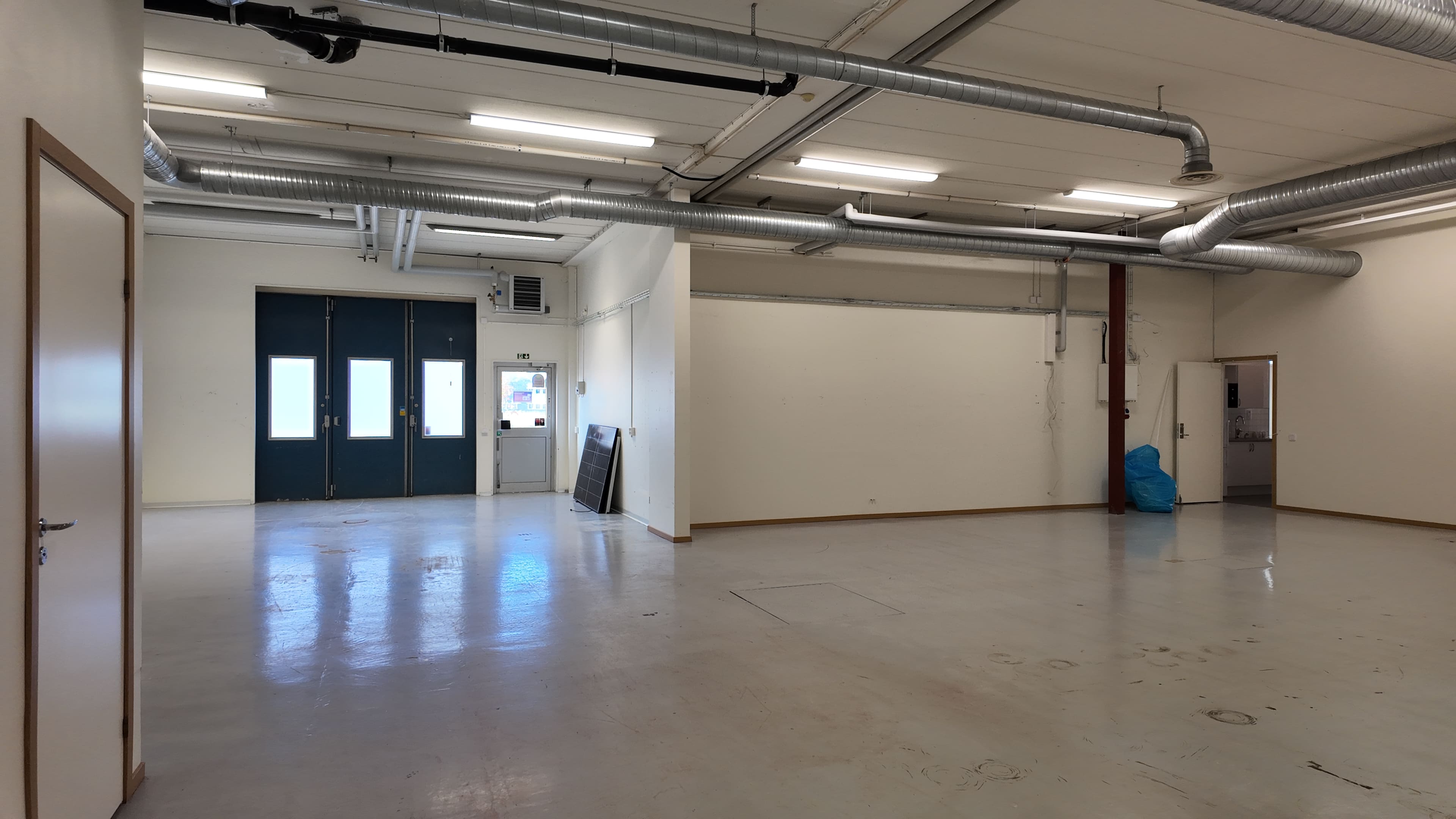 Kontorsdelen ligger i anslutning till lagret med entré från framsidan. Lagret har en rejäl markport. I den bakre delen finns en groventré och möjlighet till fler kontorsrum eller omklädningsrum.