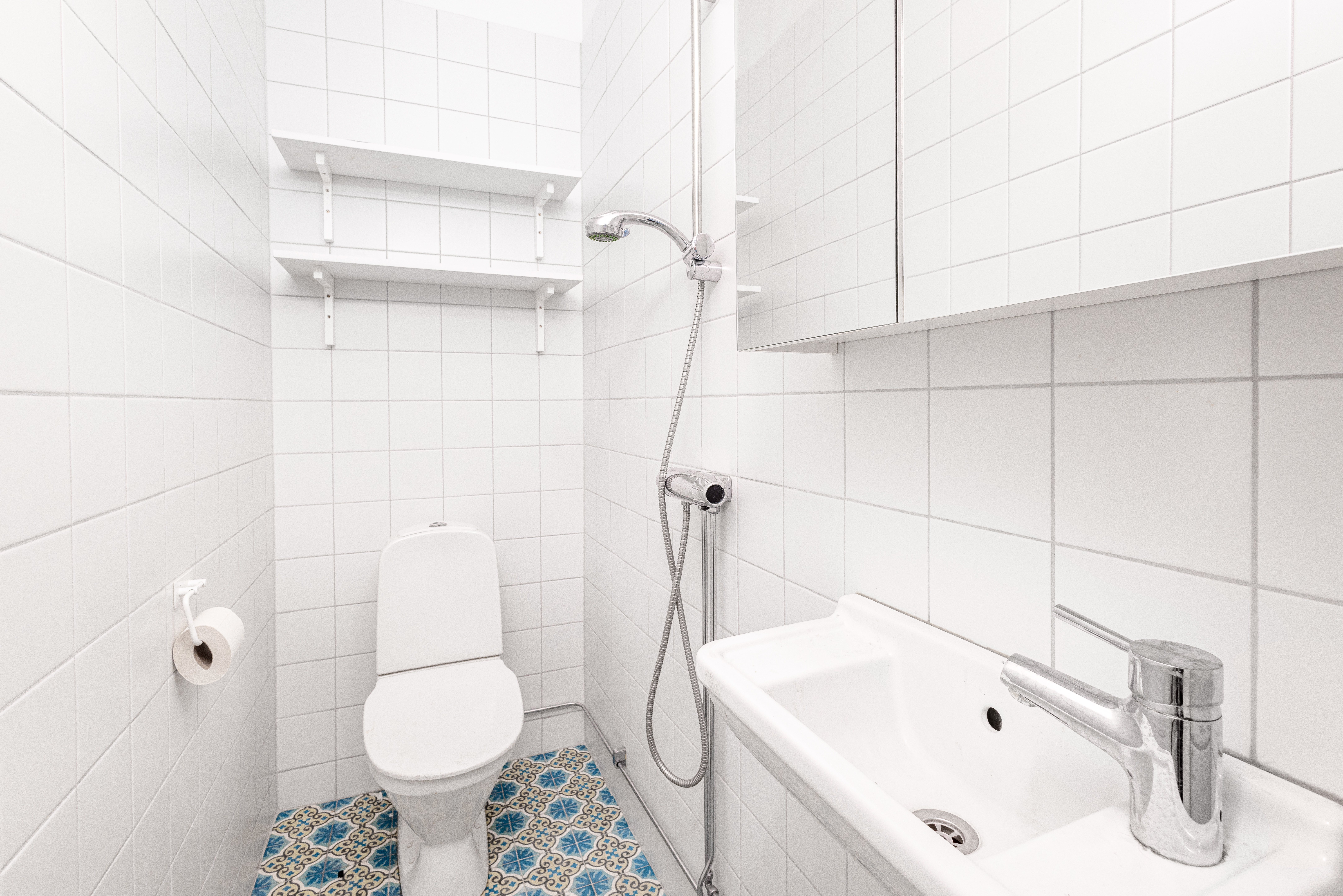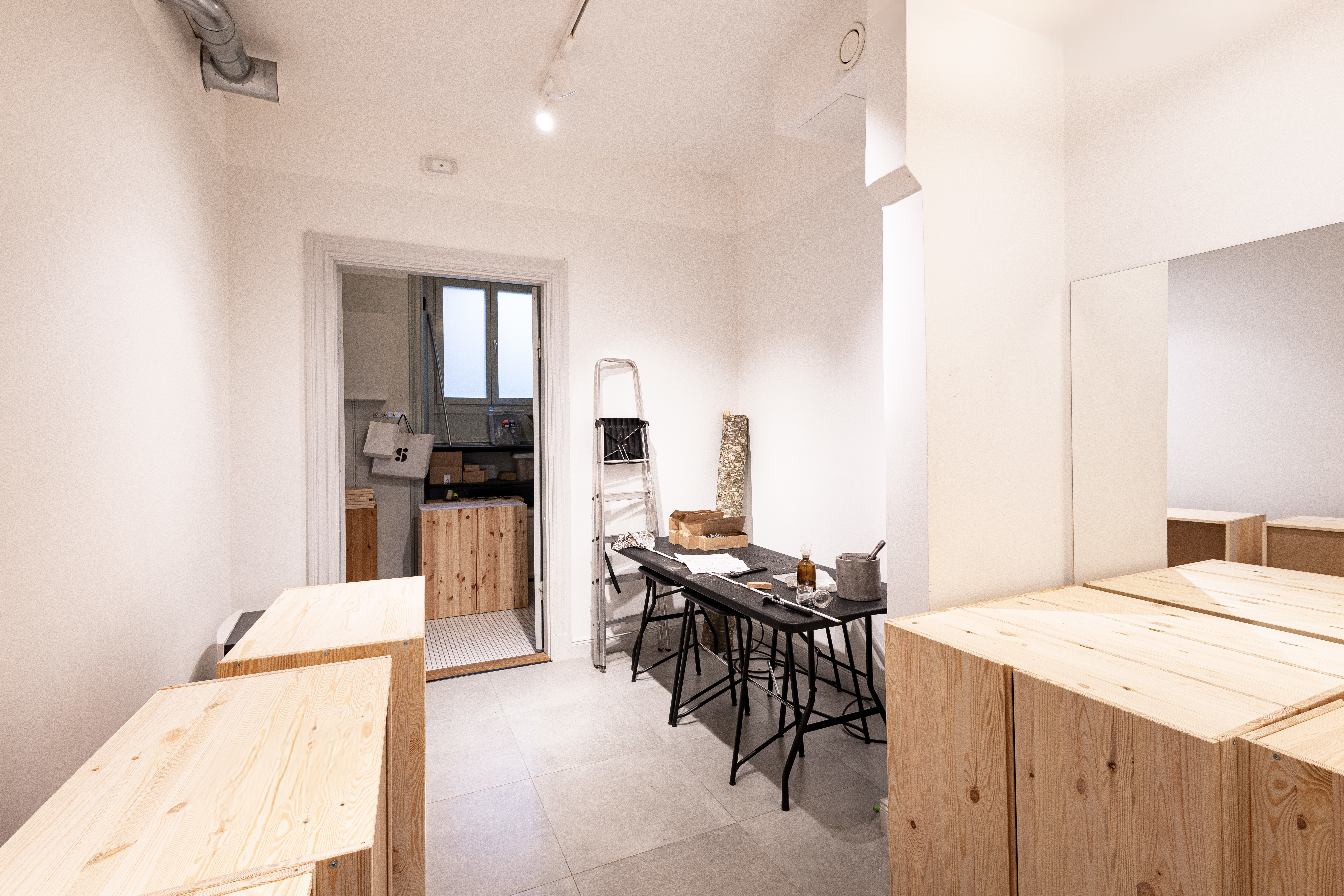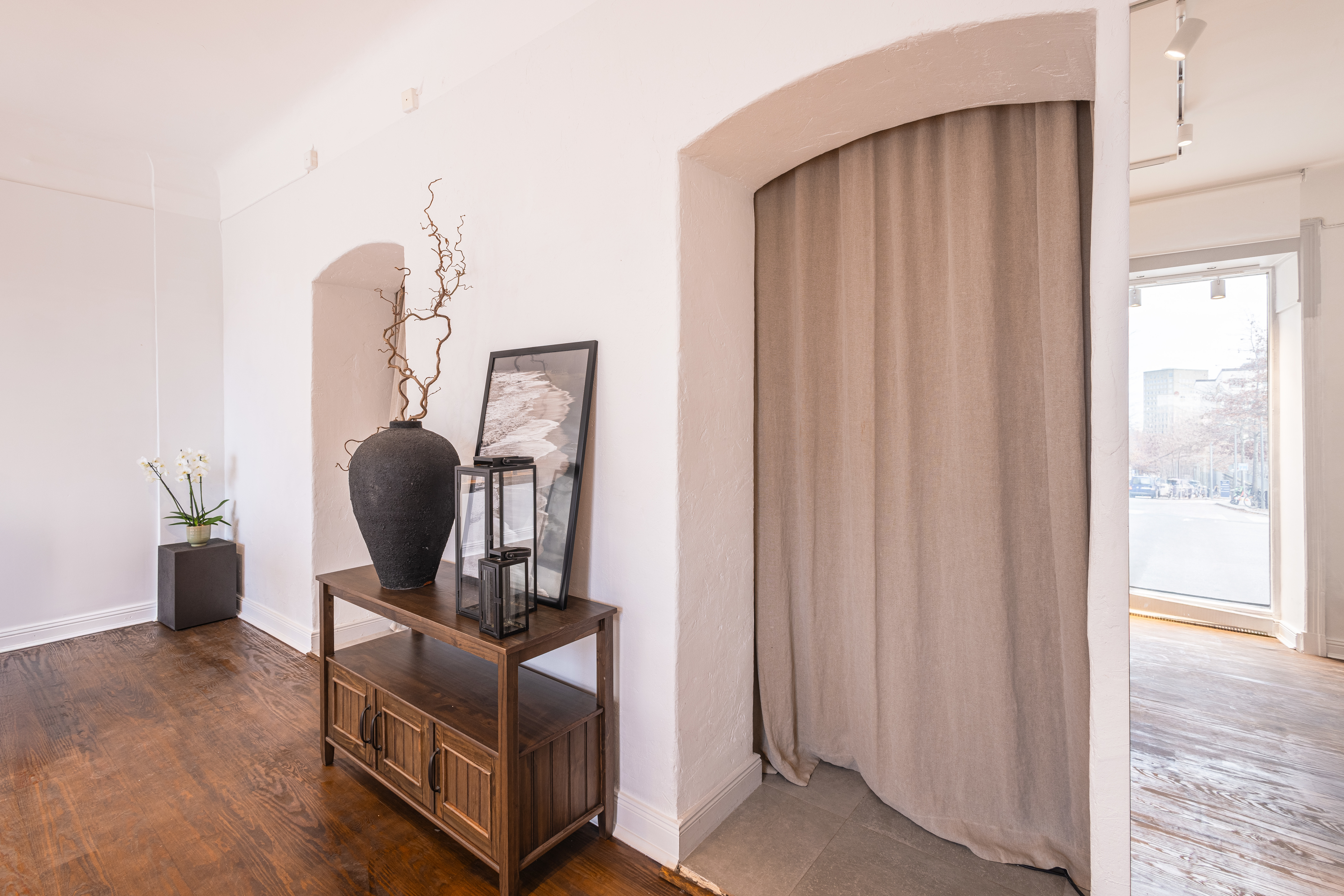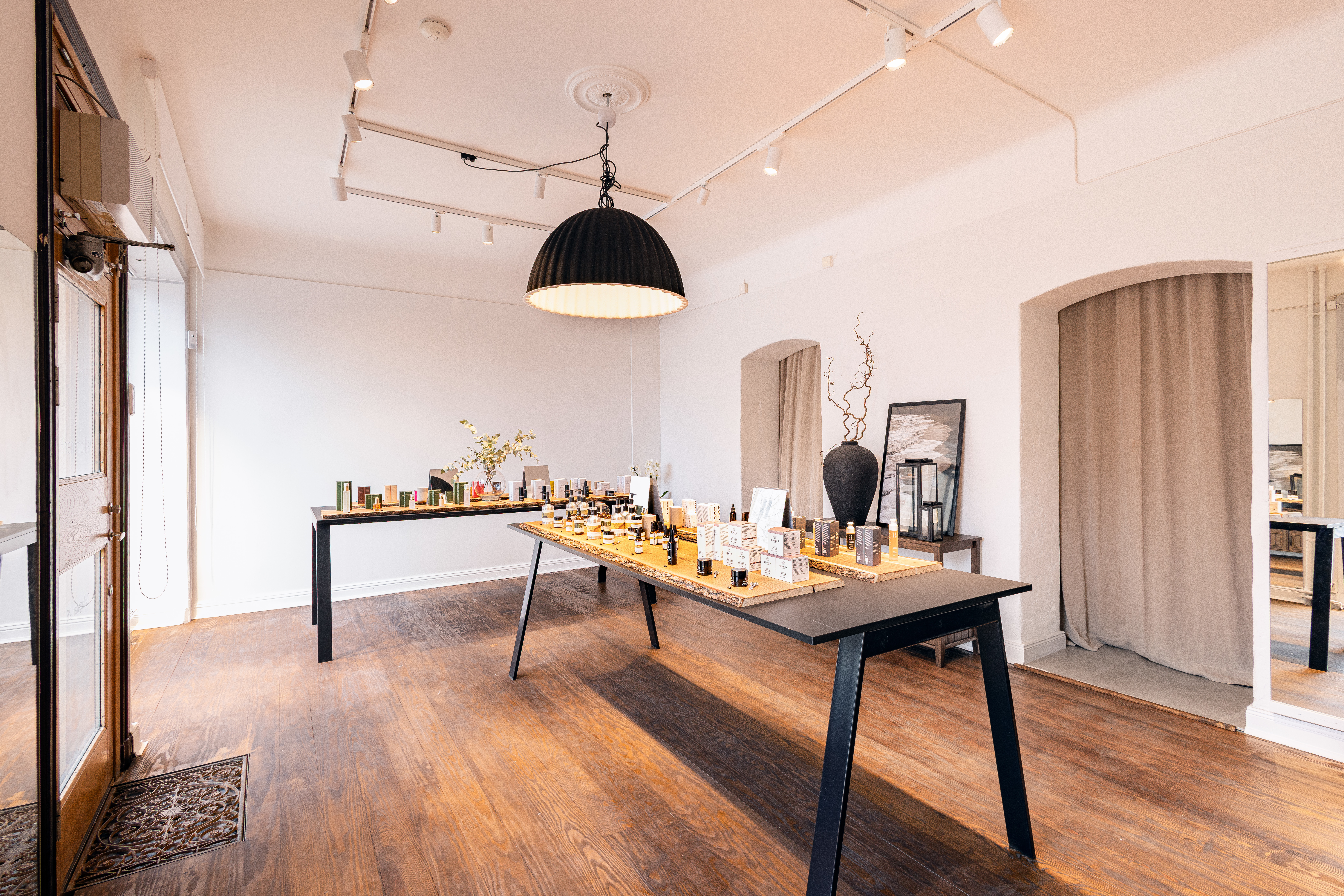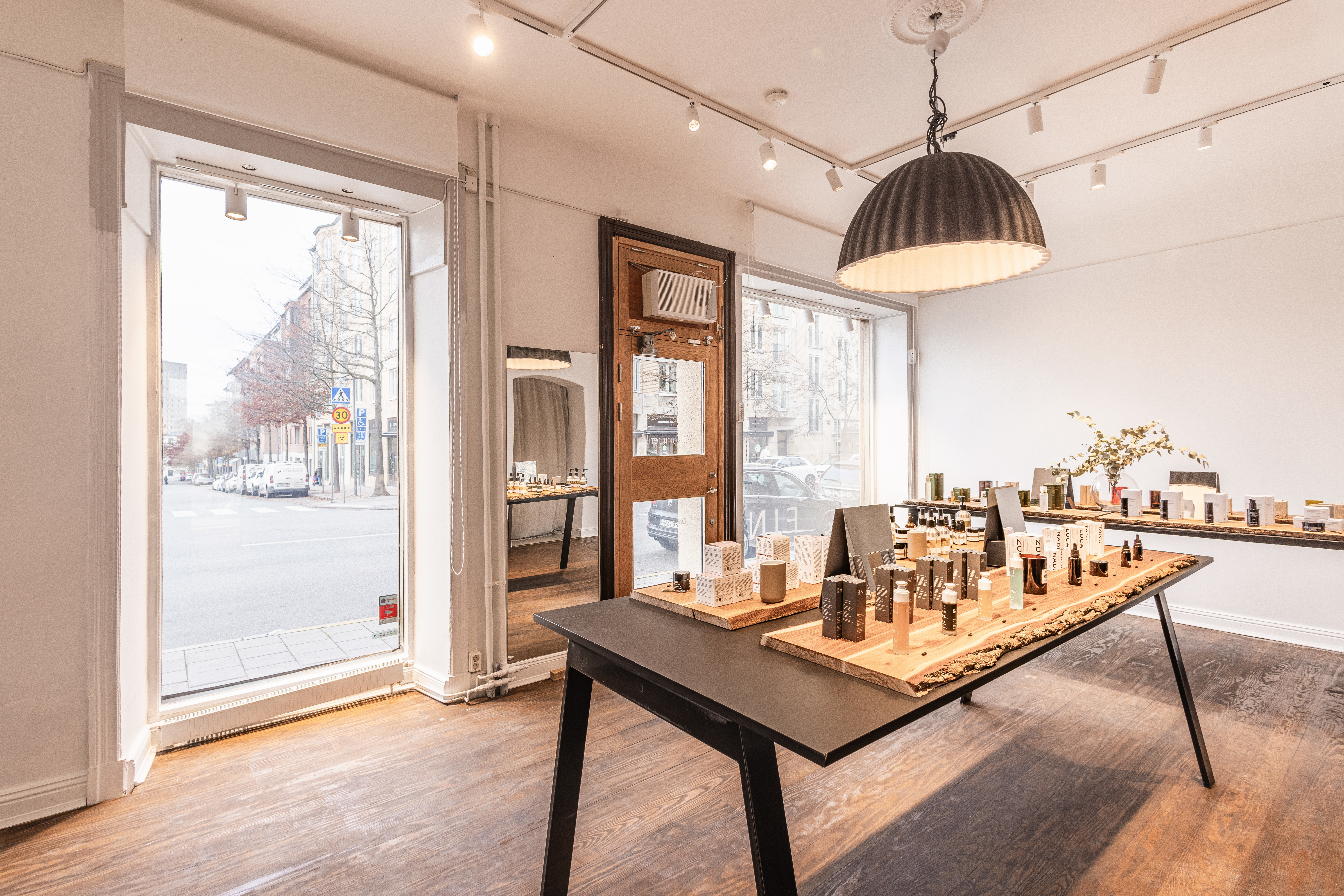 Rummet närmast gatan badar i ljus tack vare de stora fönstren och fungerar perfekt som butiksyta eller showroom. Planlösningen är genomtänkt med tre rum som ger både öppna ytor och plats för lugnare arbetsdelar eller kundmöten. Här finns också ett fint pentry och wc med dusch.