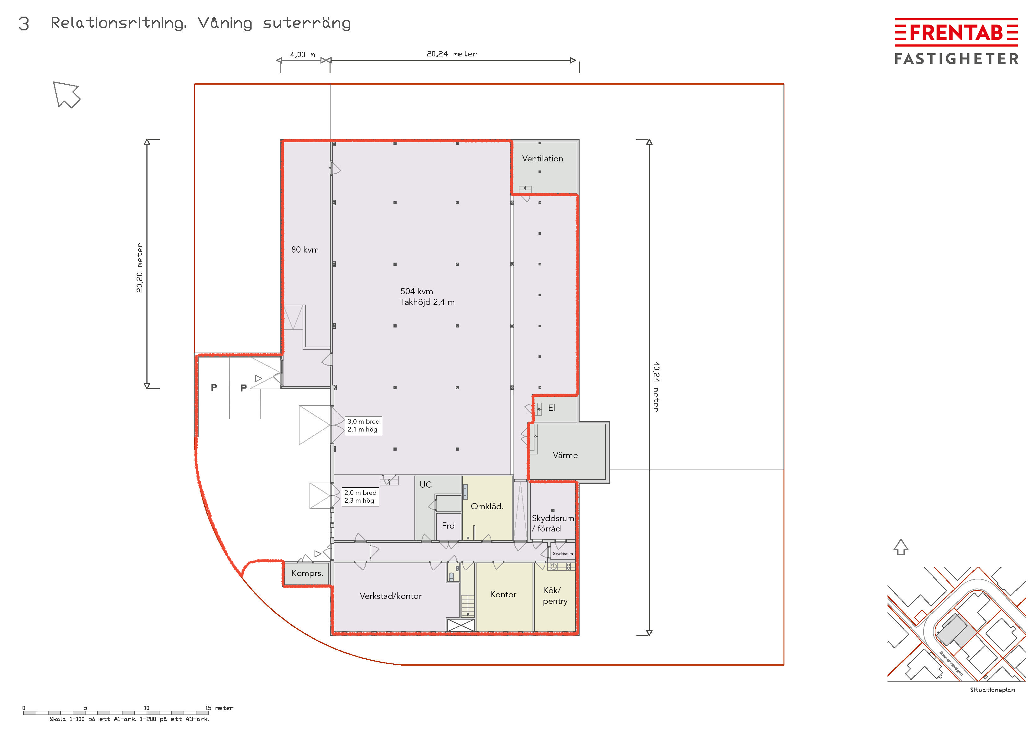 Planlösningen omfattar en souteränglokal om totalt ca 818 kvm, kompletterad med en markyta om ca 164 kvm i direkt anslutning till lokalen. Lokalen har egen entré och port, vilket ger god funktionalitet och tydlig angöring. Stora porten är 2,1 meter hög och 3 meter bred. Lilla porten är 2 meter bred och 2,3 meter hög. Det finns även ett kompressorrum i anslutning till entrén om ca 6 kvm.