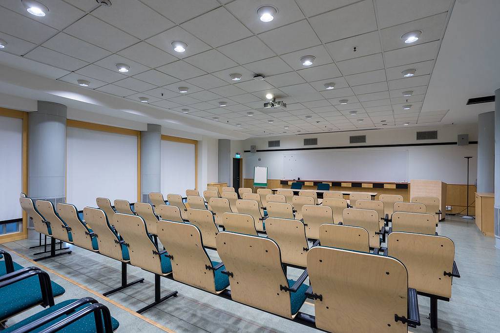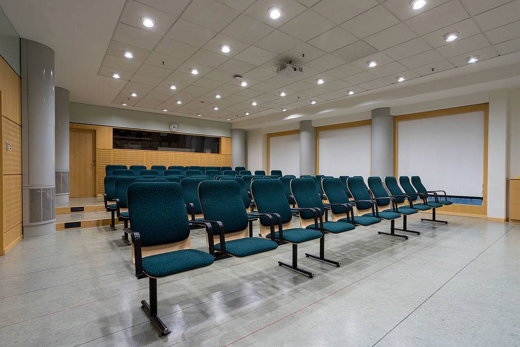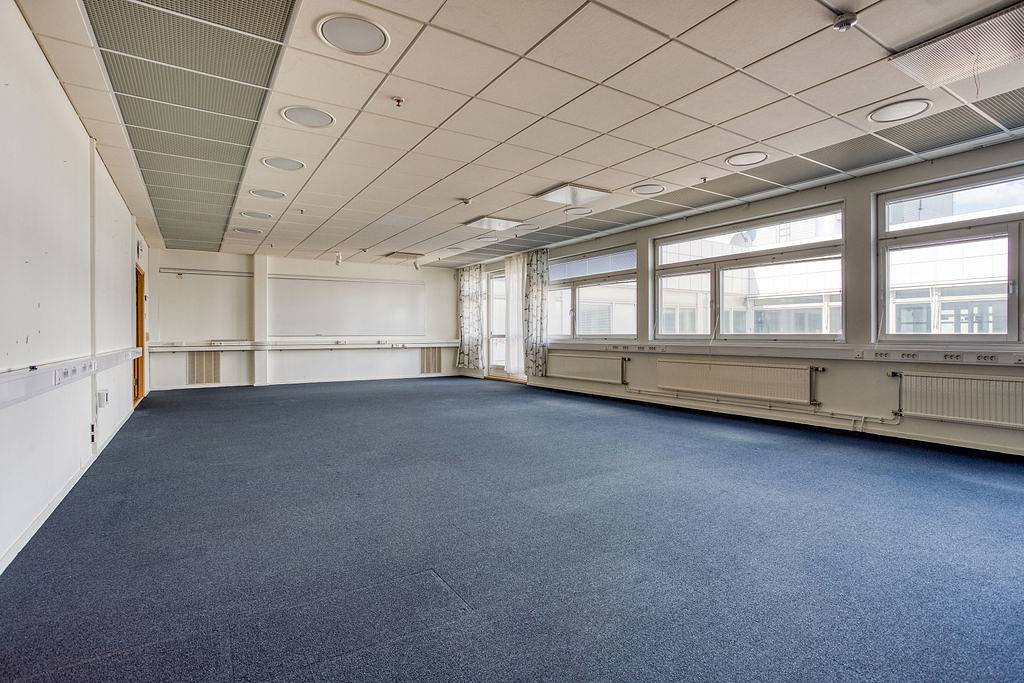 Lokalen håller redan idag en genomgående god standard med fräscha ytskikt. De flesta väggarna är vitmålande med vitt undertak. Golven har mörkgrå textilmatta för optimal akustik.