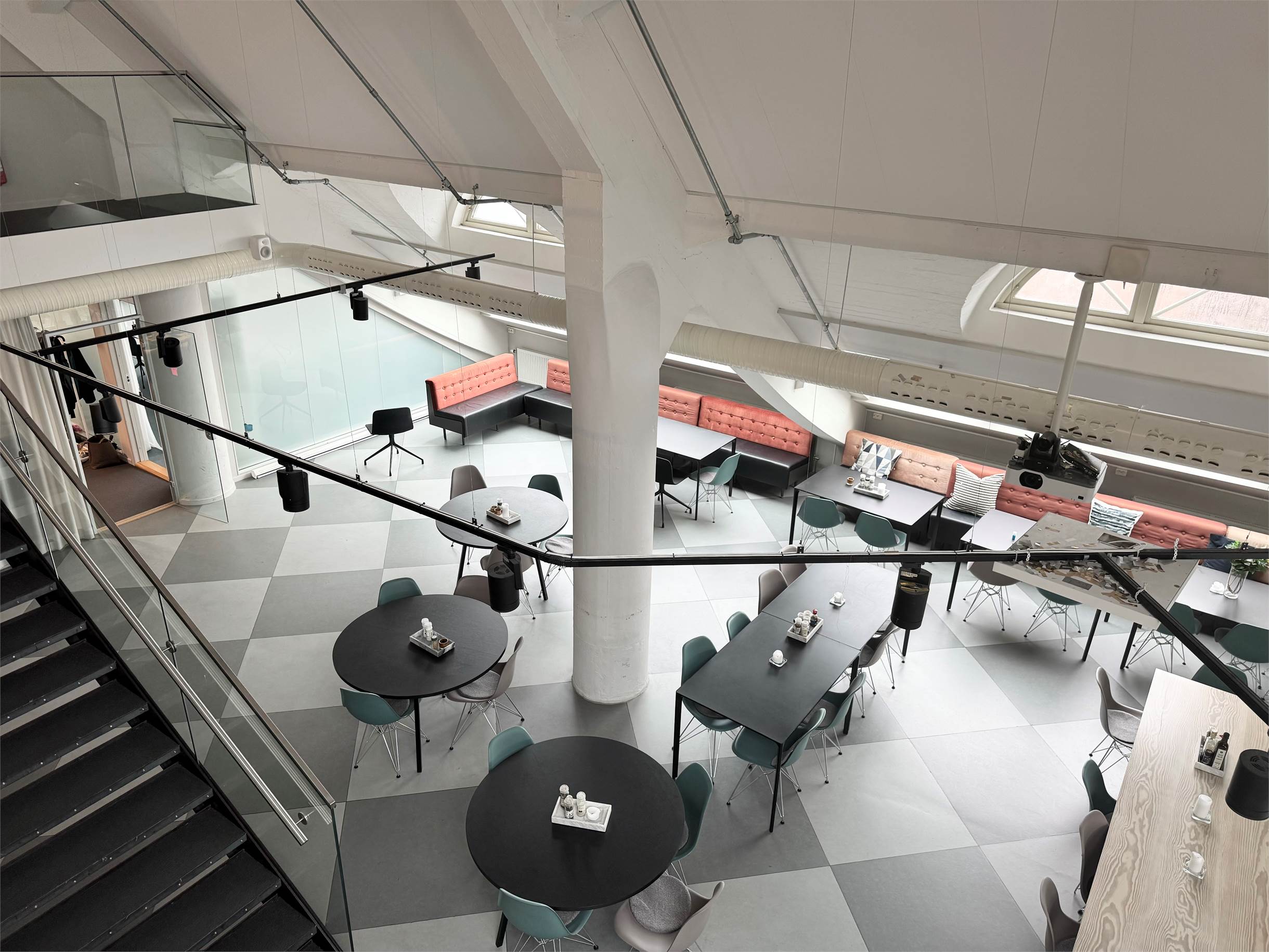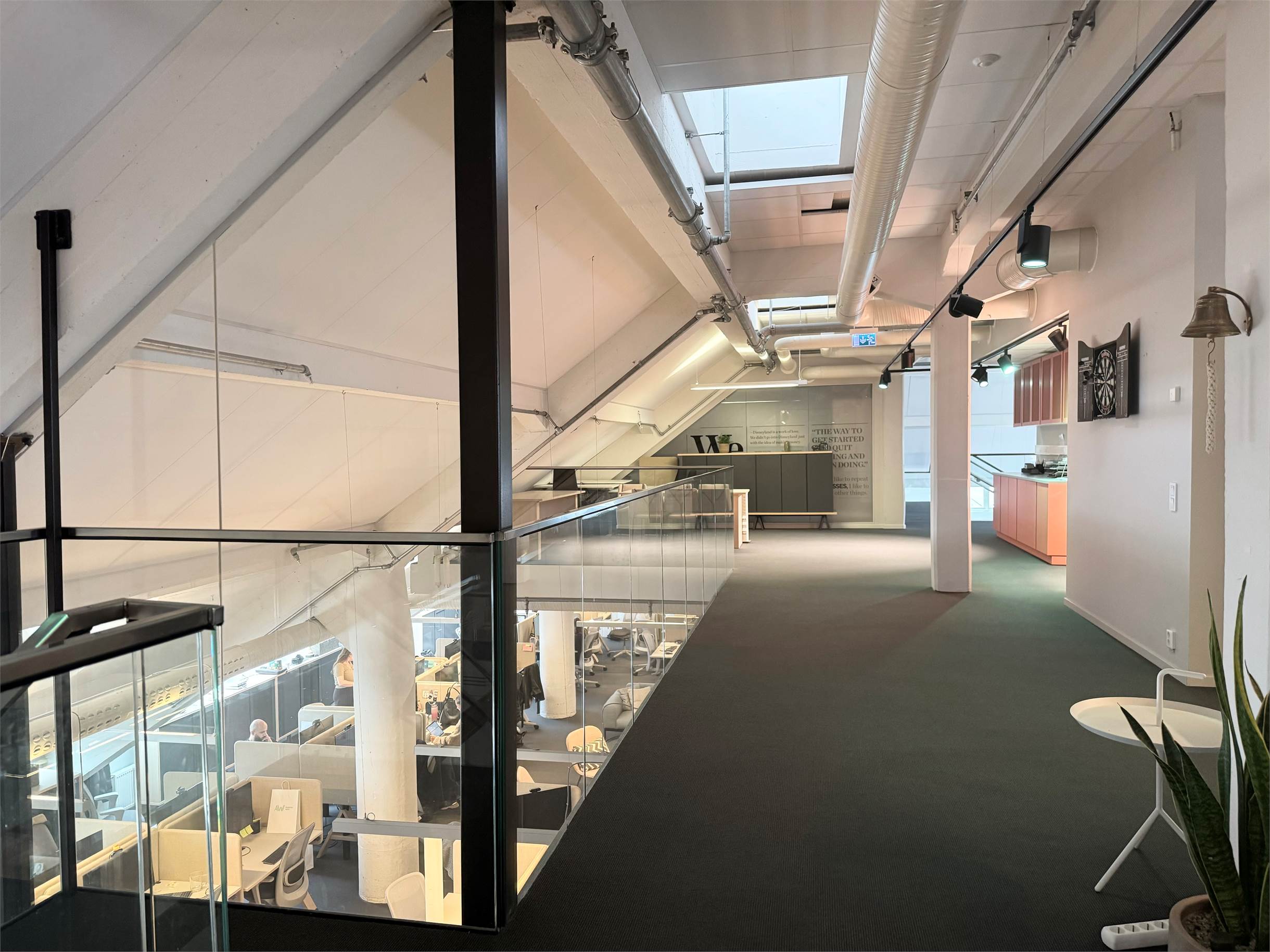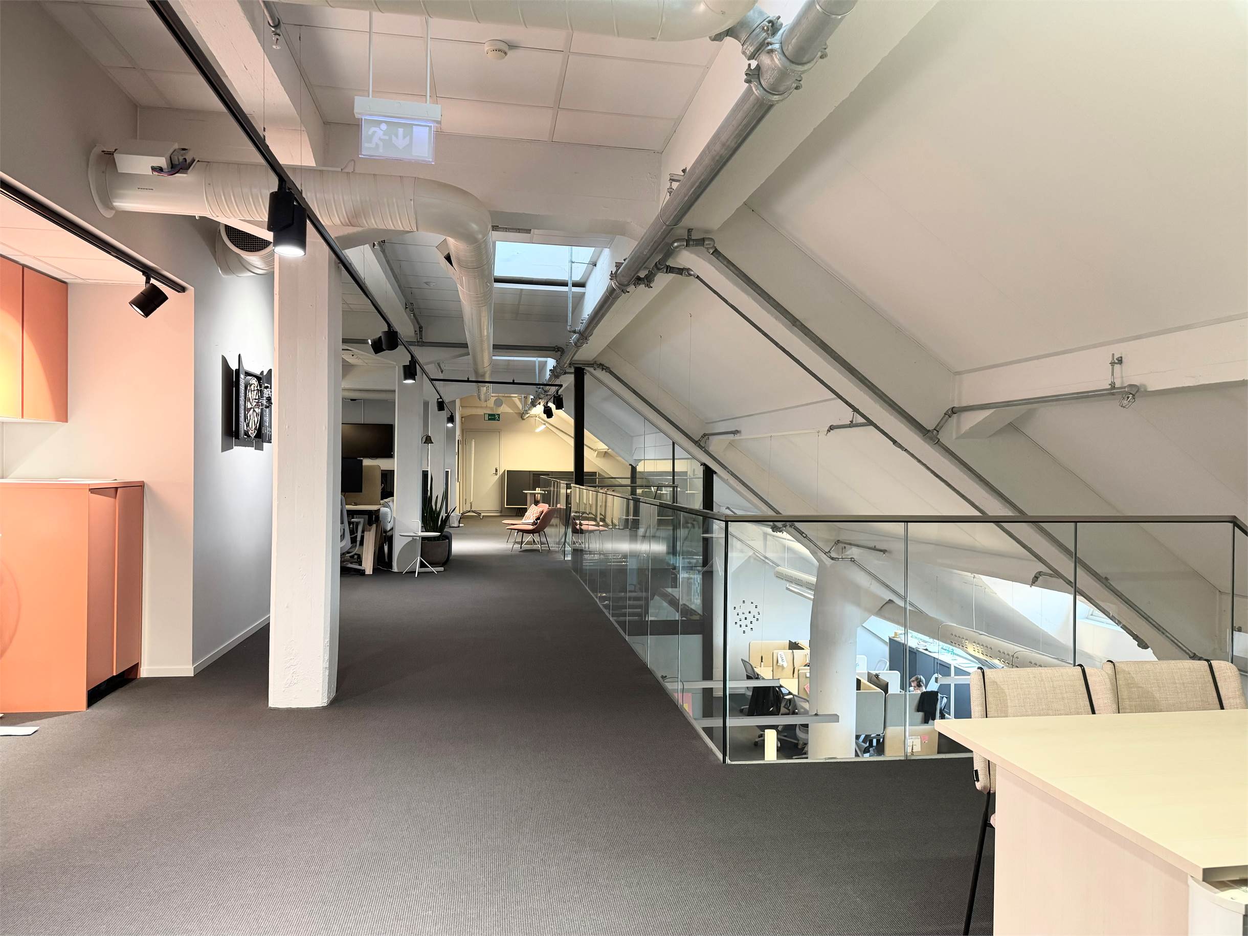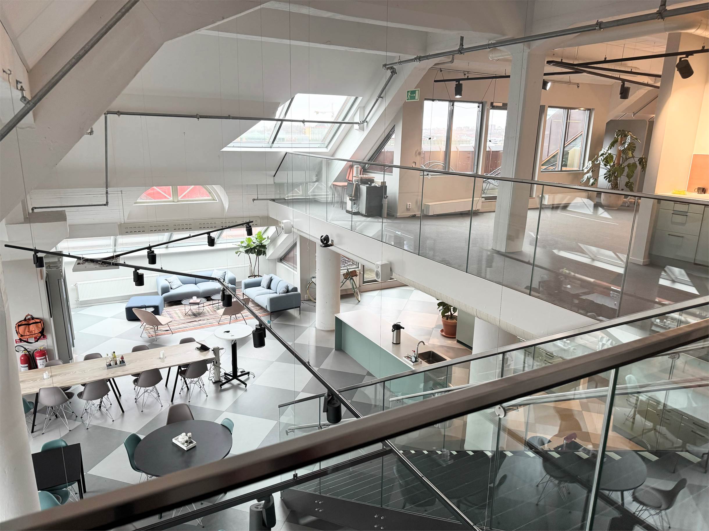En trappa upp fortsätter den öppna och luftiga känslan med öppen vy ner mot entréplanet. Här finns en stor arbetsyta, ett konferensrum, två mindre mötesrum samt två wc, varav ett med dusch. På övre plan finns dessutom flera härliga loungeytor, en kaffestation och ytterligare en balkong. Lokalen erbjuder därmed gott om ytor för både kreativt samarbete och avslappnade möten i en trivsam miljö.