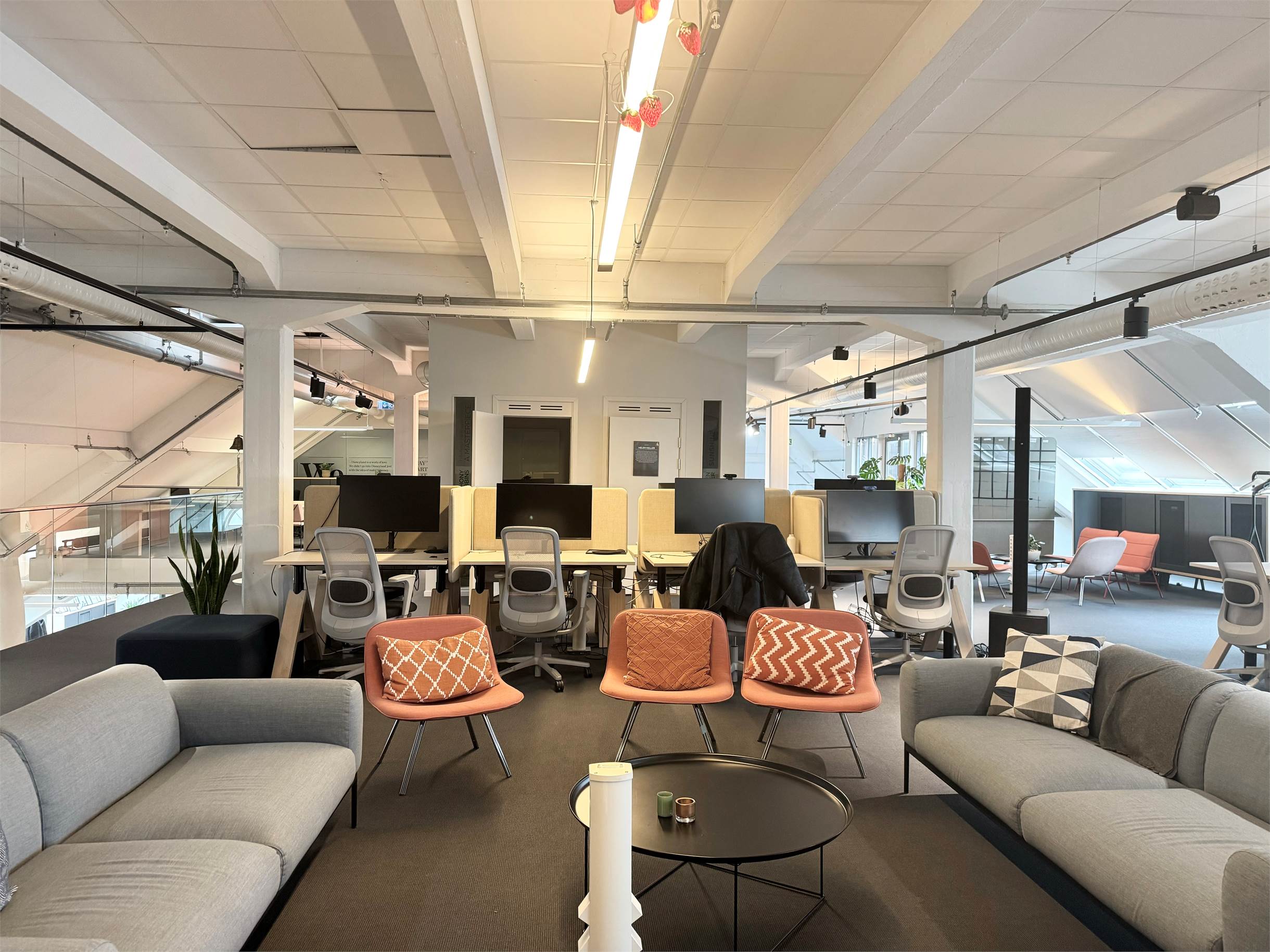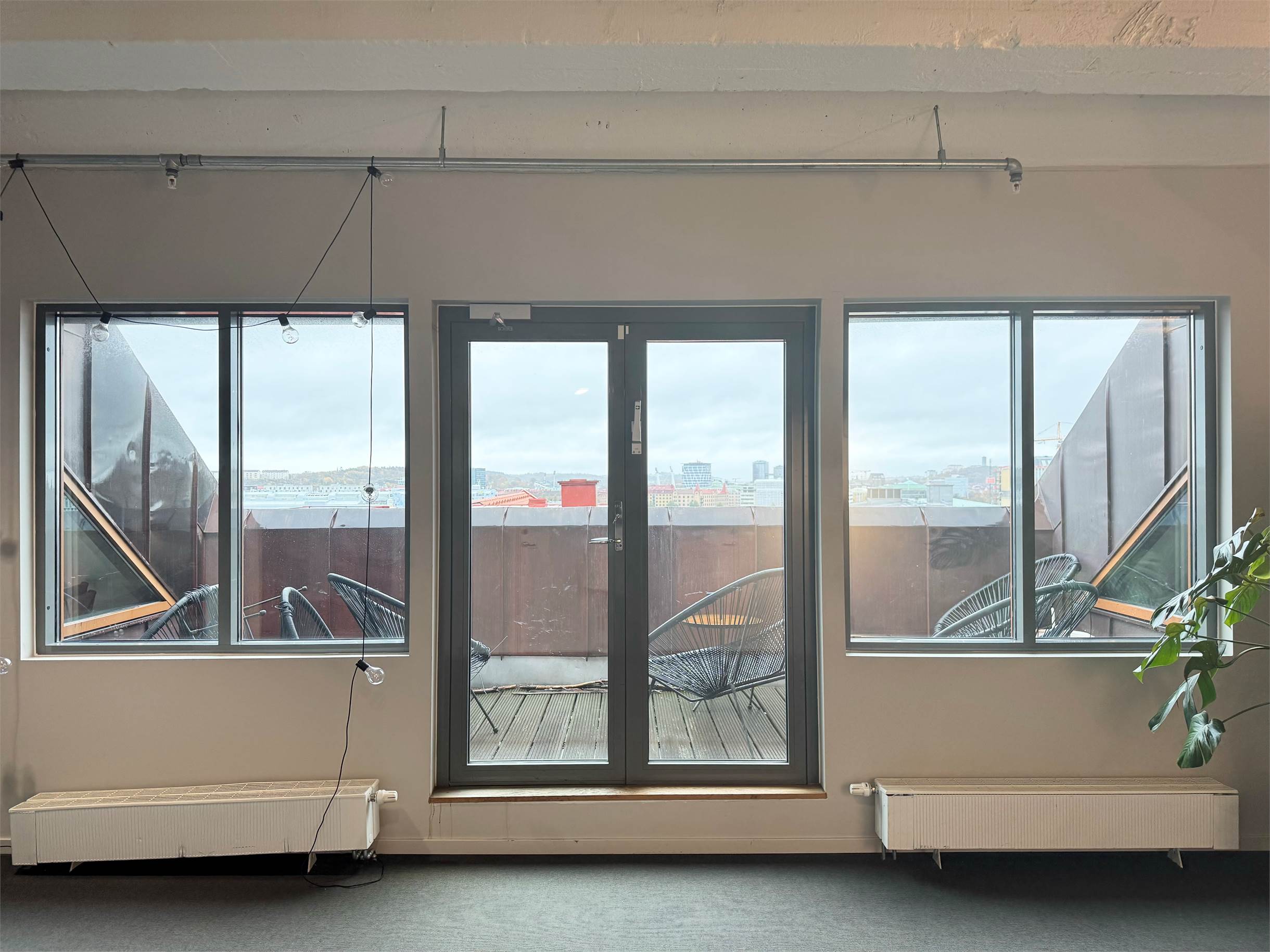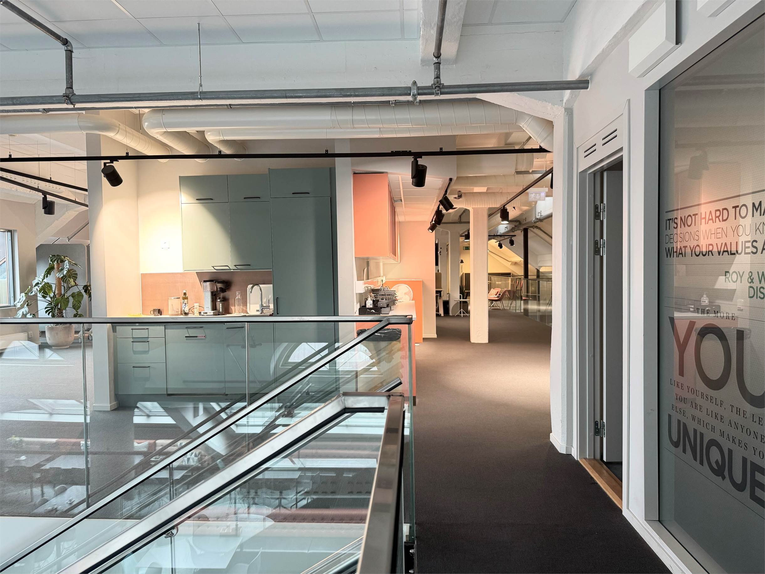 En trappa upp fortsätter den öppna och luftiga känslan med öppen vy ner mot entréplanet. Här finns en stor arbetsyta, ett konferensrum, två mindre mötesrum samt två wc, varav ett med dusch. På övre plan finns dessutom flera härliga loungeytor, en kaffestation och ytterligare en balkong. Lokalen erbjuder därmed gott om ytor för både kreativt samarbete och avslappnade möten i en trivsam miljö.