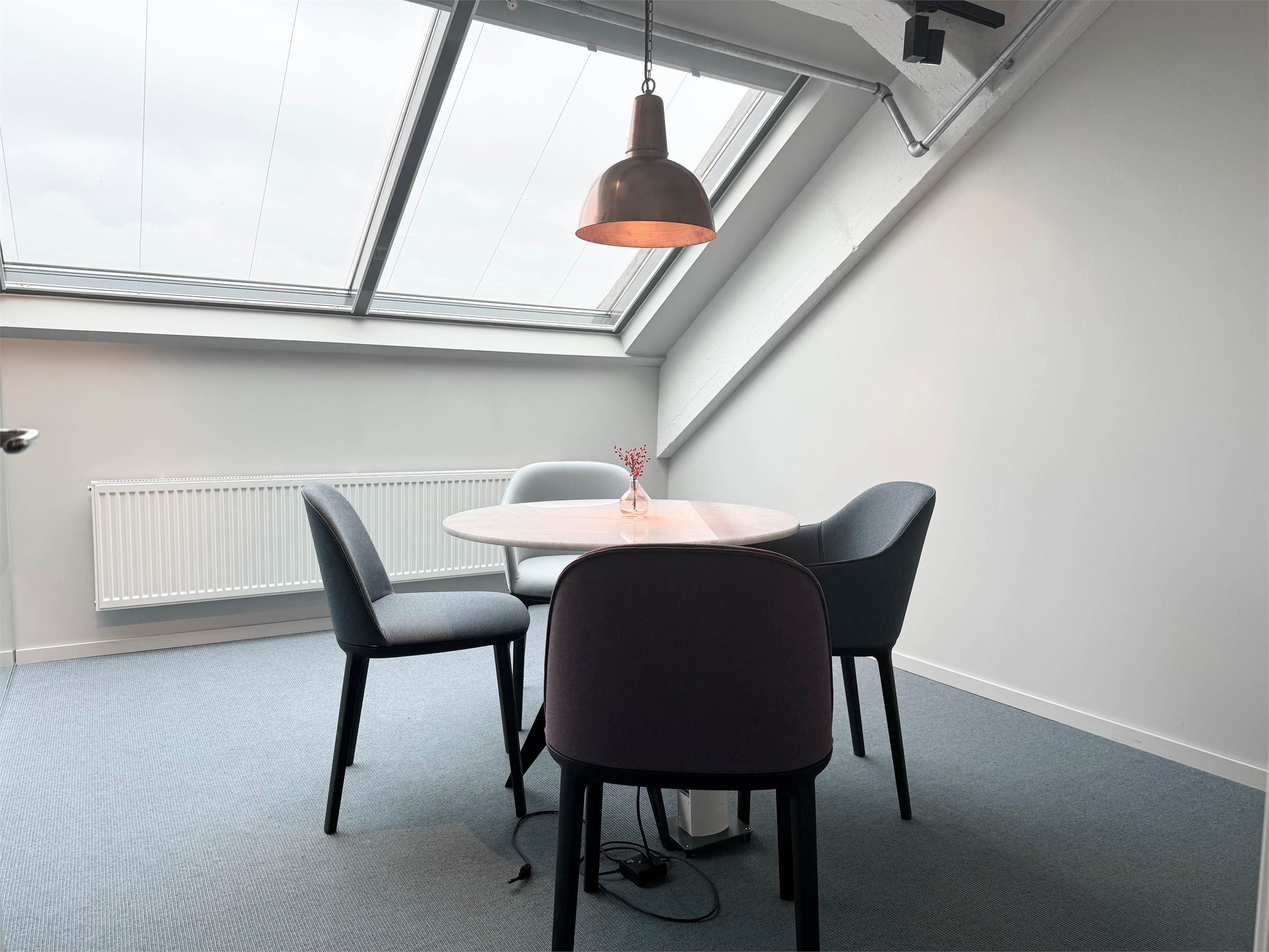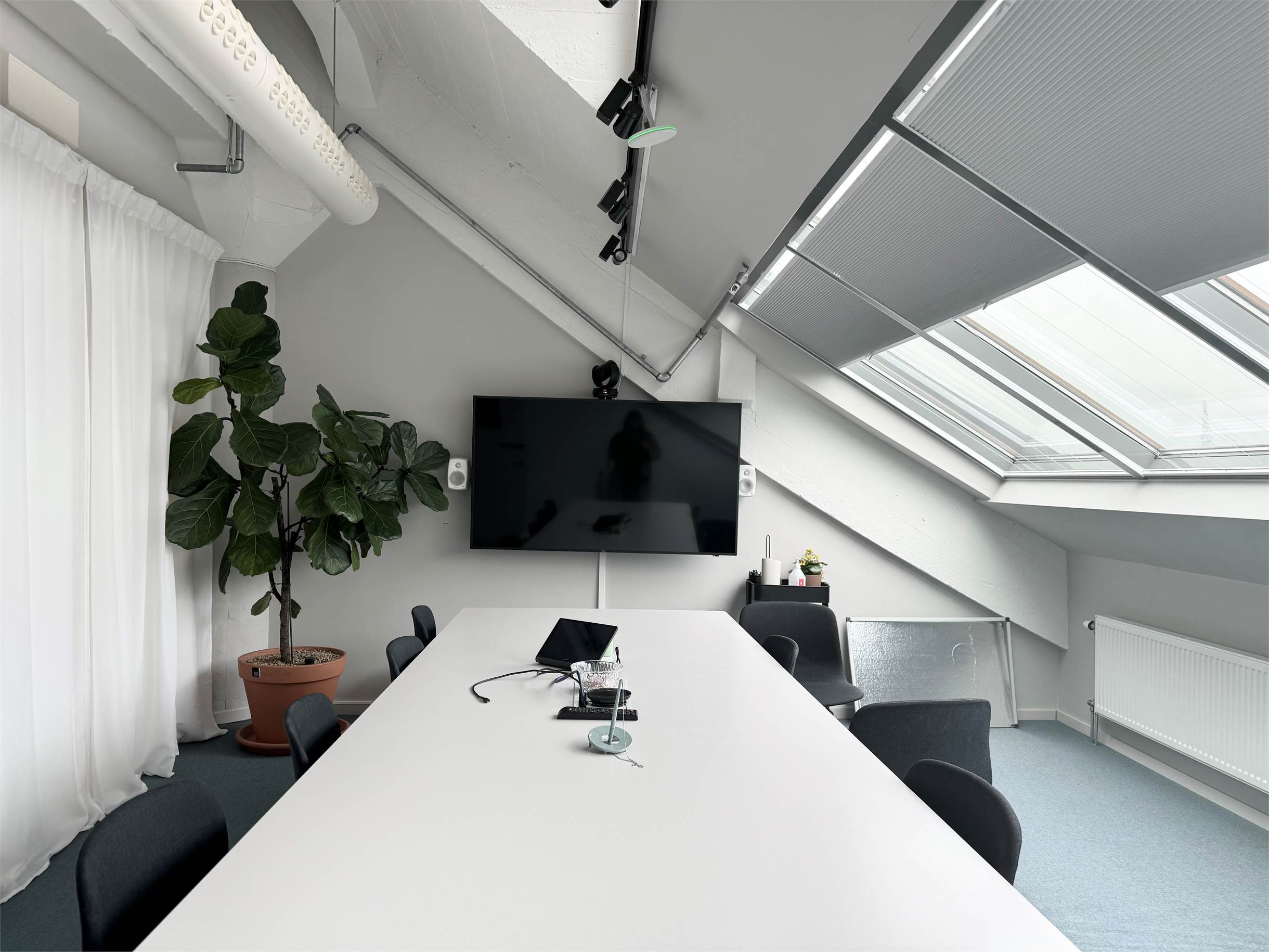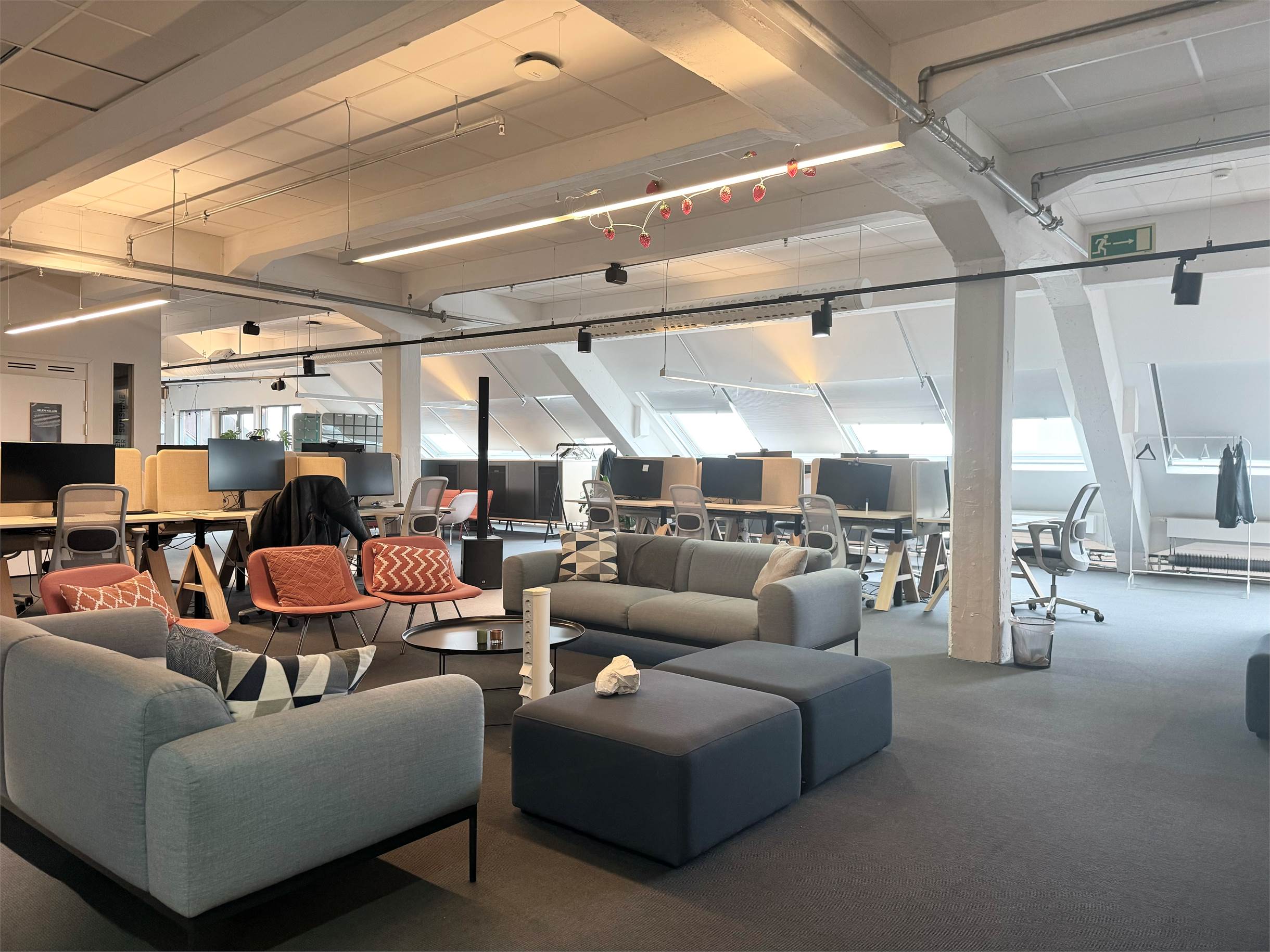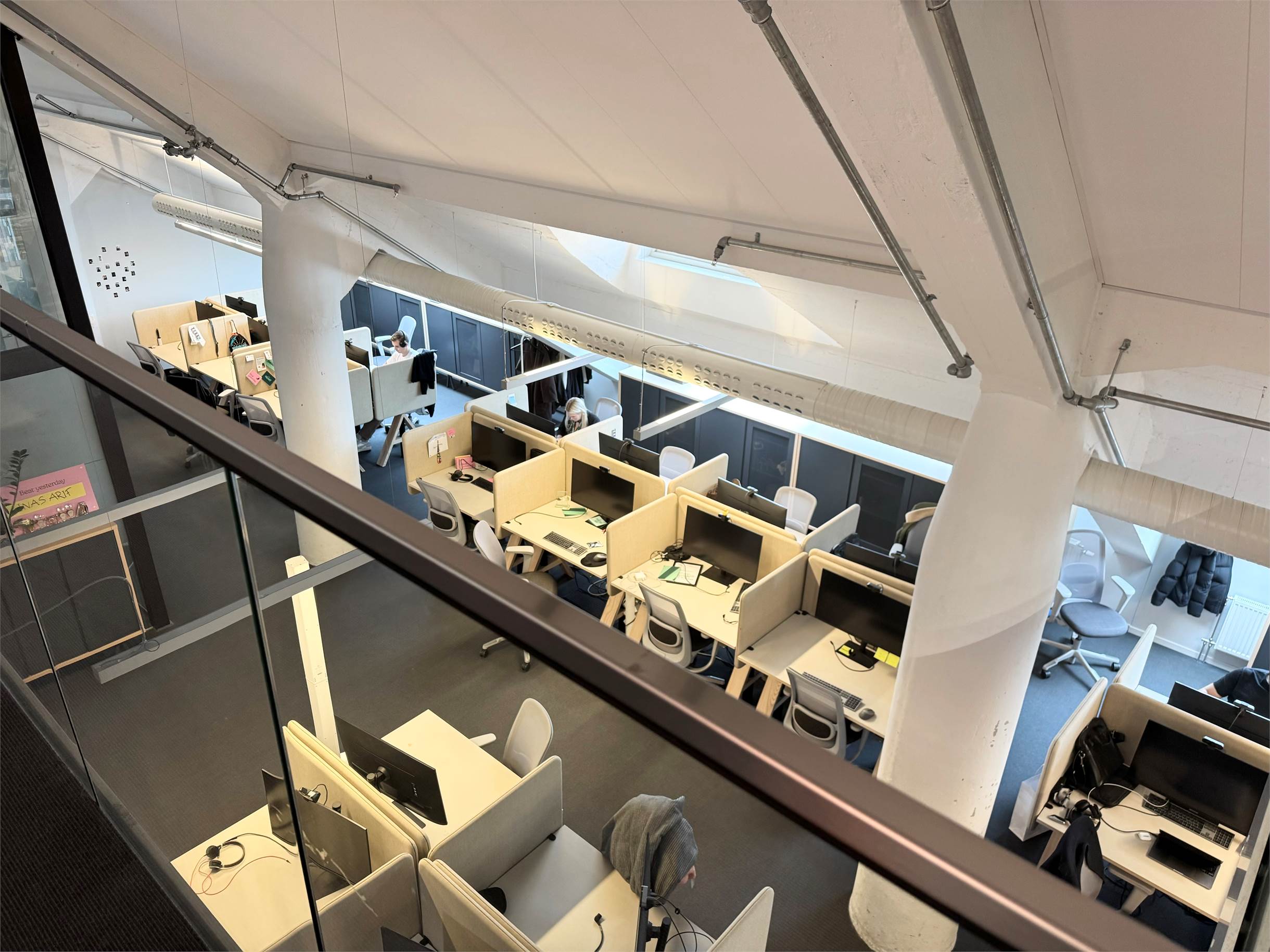 En trappa upp fortsätter den öppna och luftiga känslan med öppen vy ner mot entréplanet. Här finns en stor arbetsyta, ett konferensrum, två mindre mötesrum samt två wc, varav ett med dusch. På övre plan finns dessutom flera härliga loungeytor, en kaffestation och ytterligare en balkong. Lokalen erbjuder därmed gott om ytor för både kreativt samarbete och avslappnade möten i en trivsam miljö.