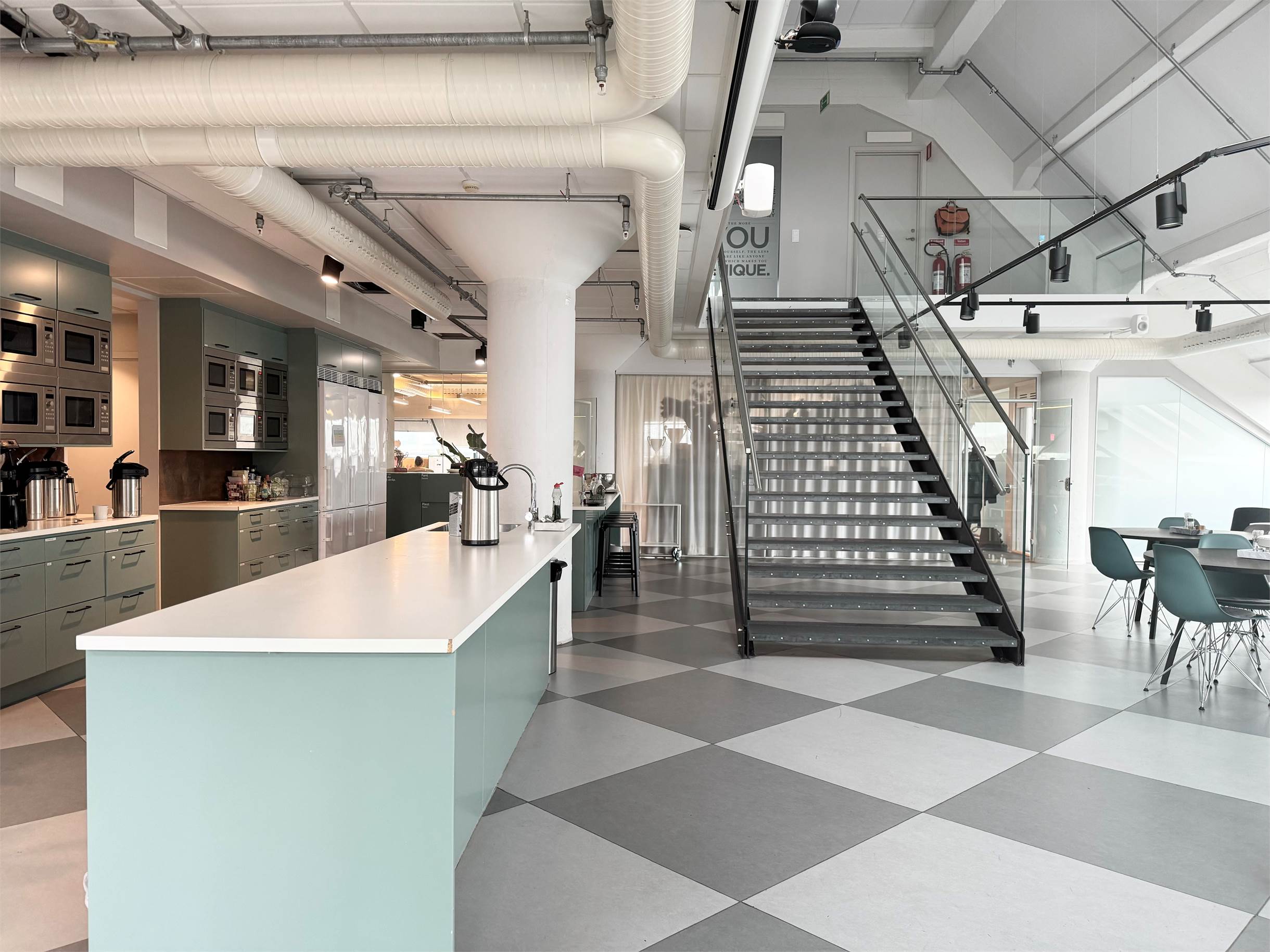 Vid entrén möts du av en välkomnande loungeyta som leder vidare in till ett stort öppet kontorslandskap. På detta plan finns även två stora konferensrum, tio mindre mötesrum och sex wc. I bortre delen av lokalen ligger ett generöst kök med gott om sittplatser och en inbjudande loungeyta – en naturlig samlingspunkt för både medarbetare och besökare. Härifrån nås också en härlig balkong som bjuder in till avkoppling under arbetsdagen.