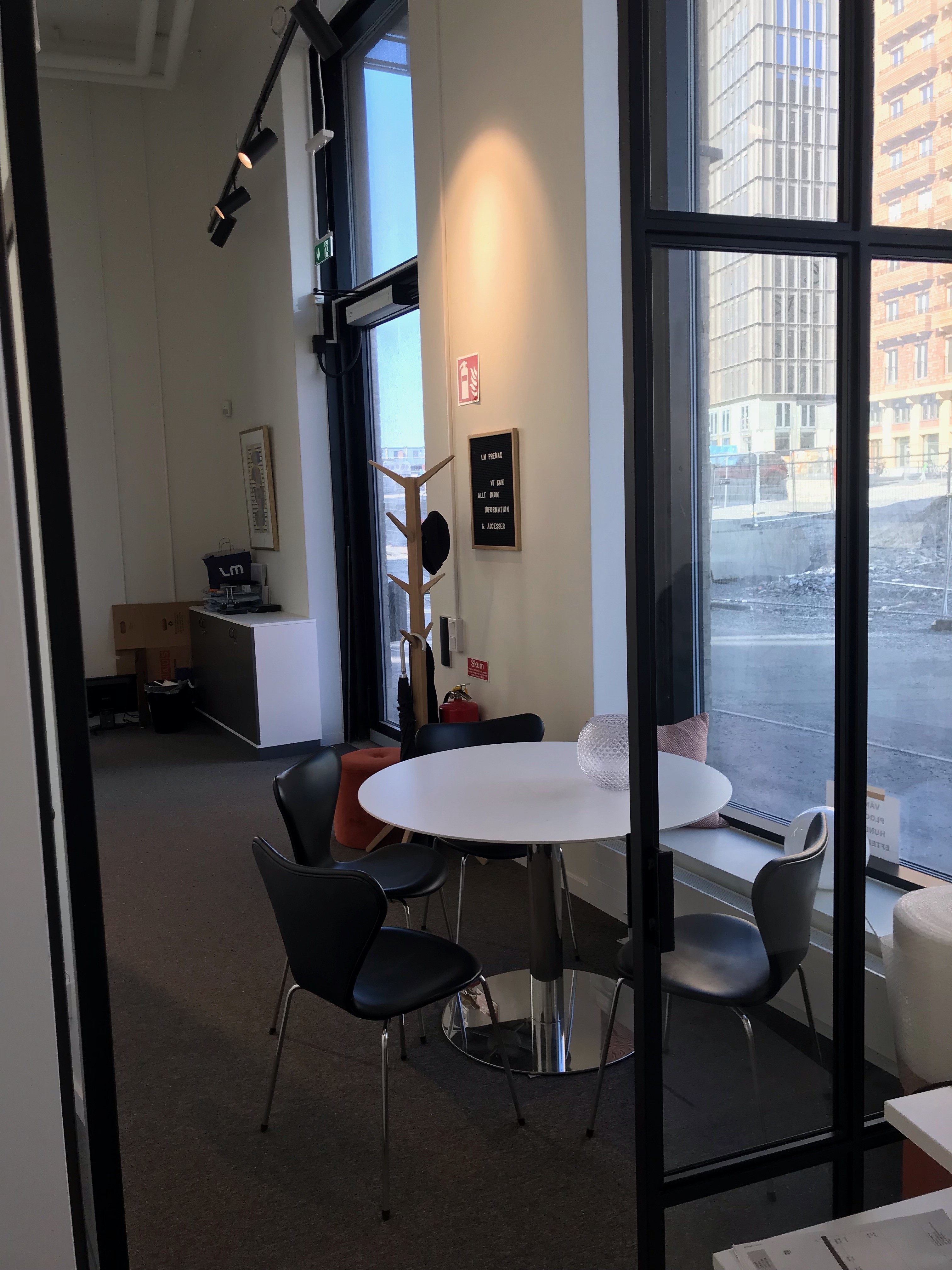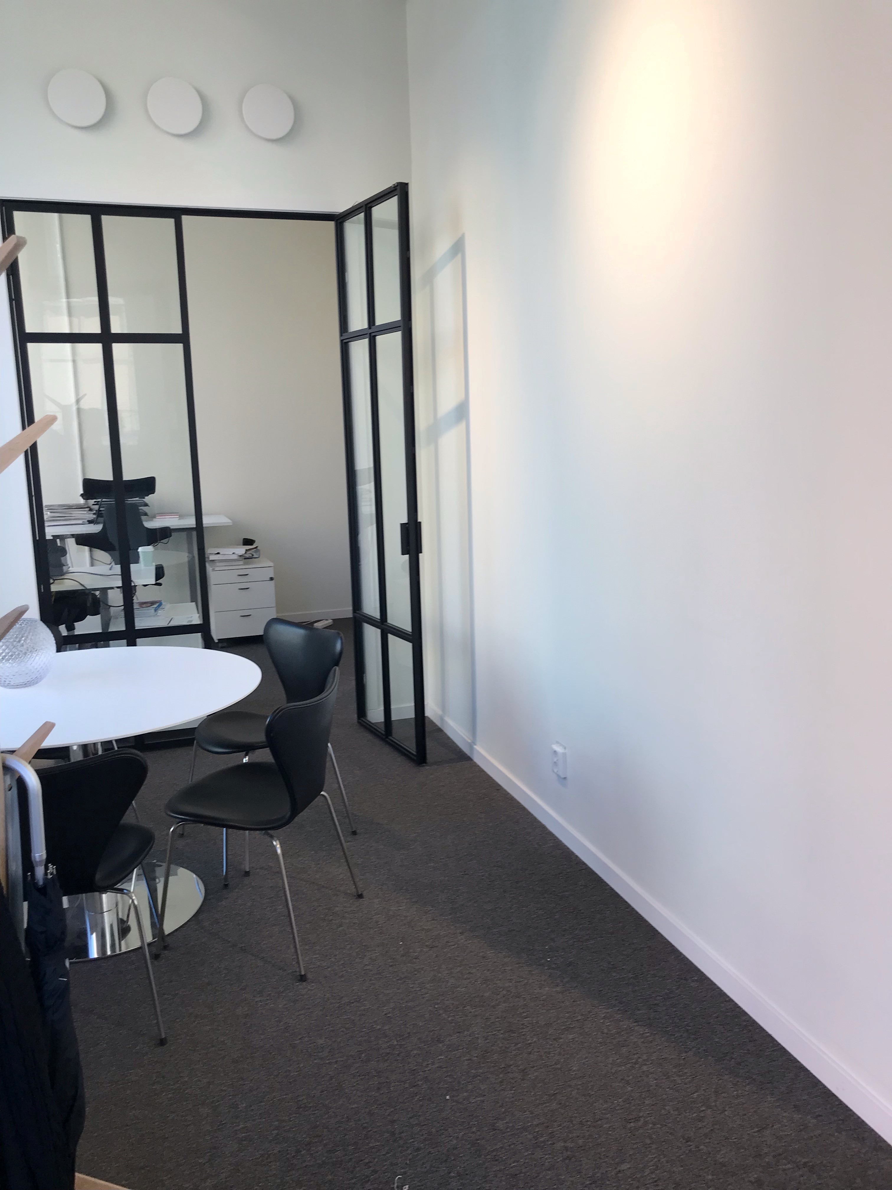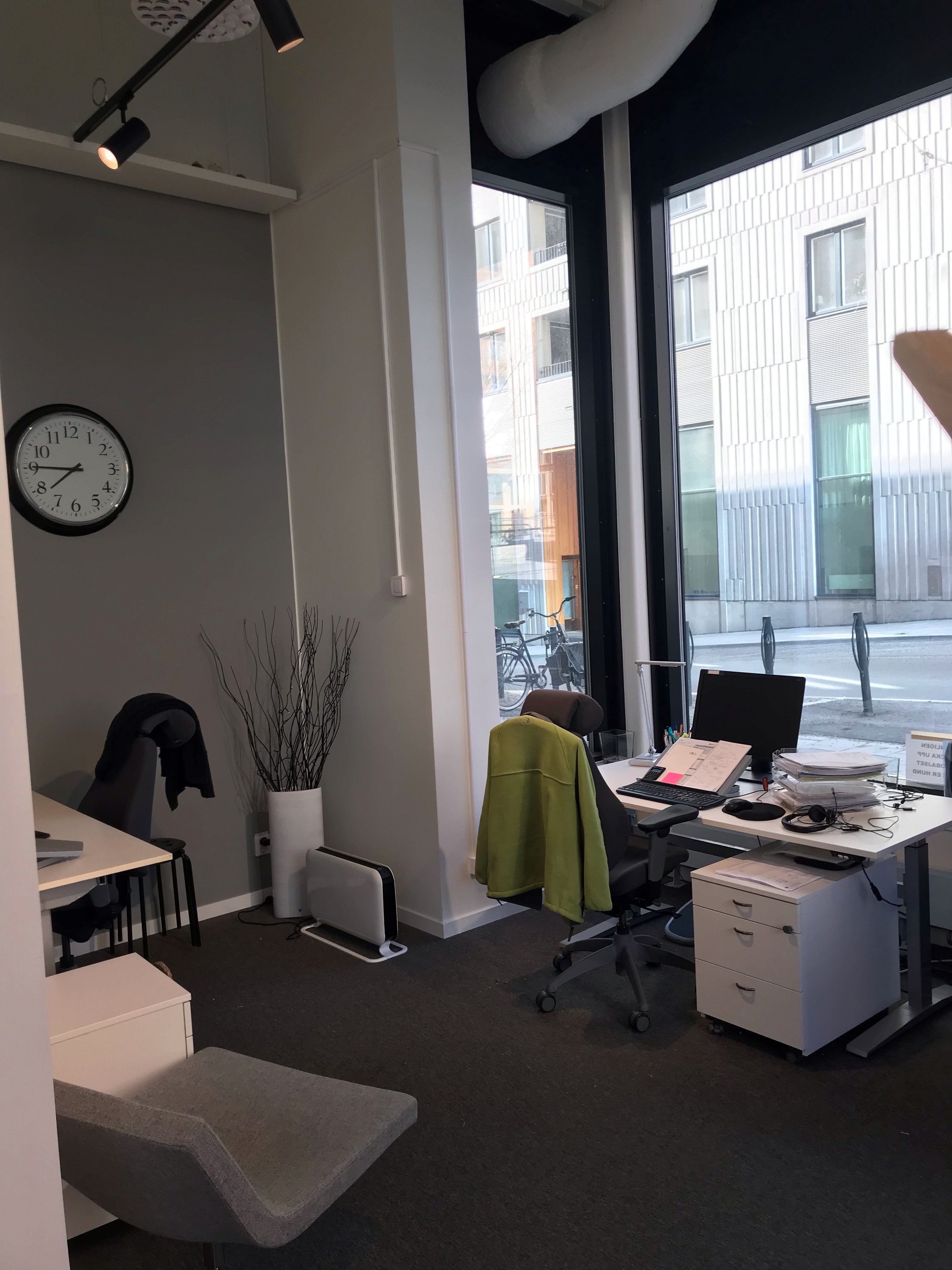 Extremt generös takhöjd med stora fönsterpartier i flera väderstreck ger ljusa kontors -och mötesytor. Textilmatta på golv, industriglasdörrar, ljust målade väggar och öppet till tak med synliga installationer ger lokalen mycket karaktär och en industriell känsla.