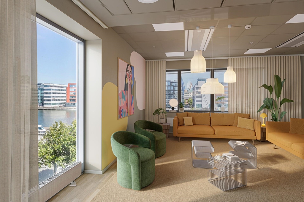 Luftig och välplanerad kontorslokal på ca 949 kvm med ca 80 arbetsplatser, flera mötesrum och generösa sociala ytor i modernt kontor.
