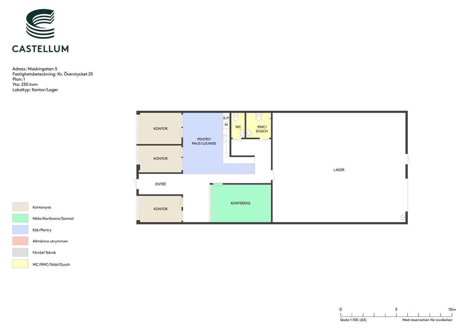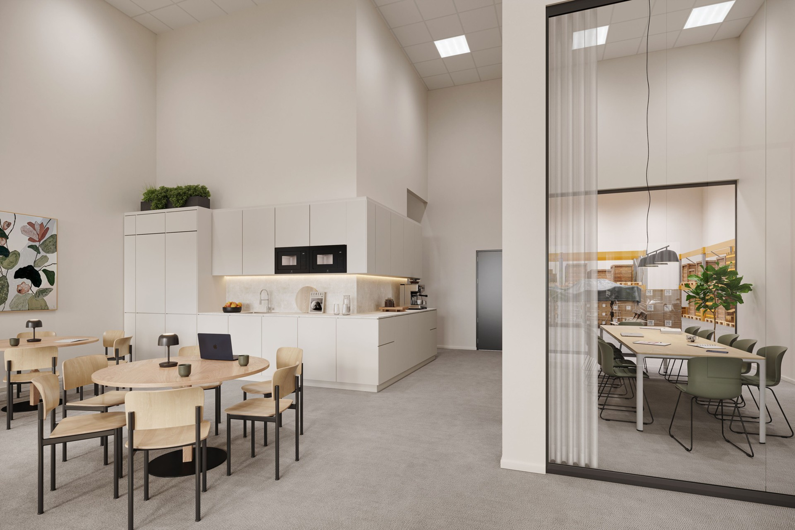 Förslaget visar tre kontorsrum, ett konferensrum samt en paus- och loungeyta med pentry. I anslutning finns även WC och RWC med dusch. Den stora lagerytan ligger lättillgängligt från kontorsdelen och kan anpassas efter verksamhetens behov.