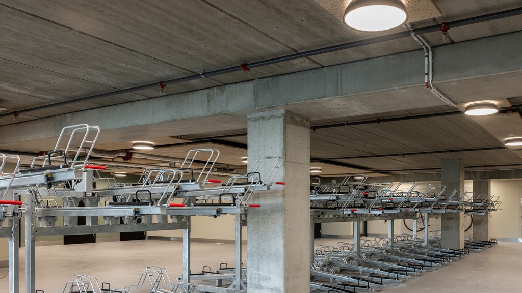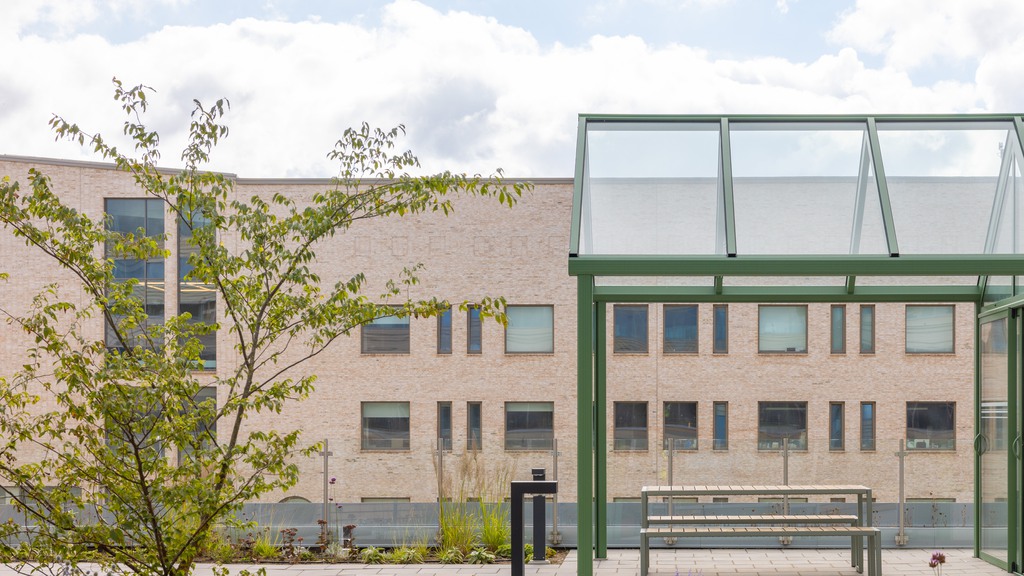Mellan möten och arbetsdagar kan du slå dig ner i de mysiga, möblerade loungeytorna – perfekta för både fokus och informella samtal. För cyklister finns ett ljust och tryggt cykelgarage med glasad vägg mot den bemannade entrén.