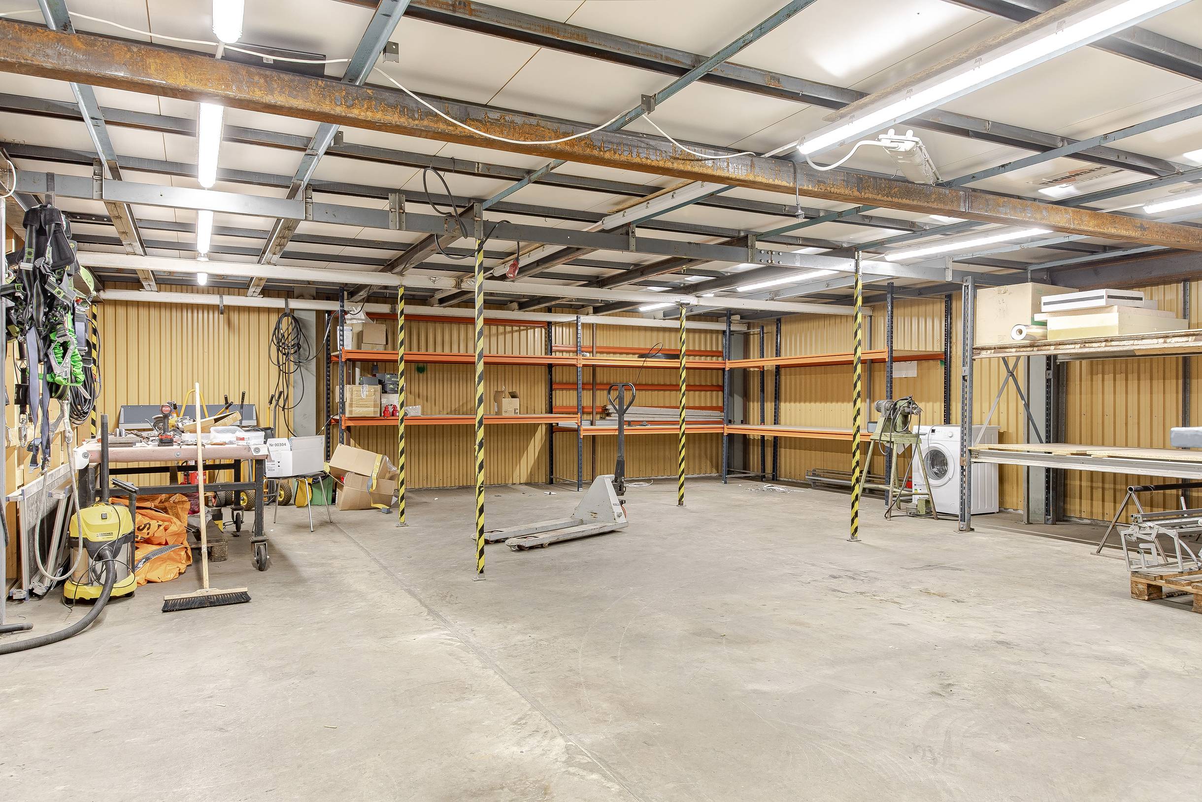 Lokalen är utrustad med WC, pentry och omklädningsrum, vilket ger goda förutsättningar för en praktisk och trivsam arbetsmiljö. Tack vare den generösa takhöjden finns möjlighet att hantera större fordon eller installera lyftutrustning vid behov.