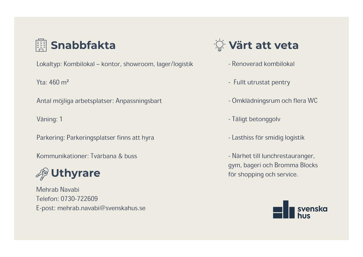 Perfekt för er som söker ett ypperligt läge med smidig in- och utlastning av varor. Lokalen är välutrustad med kontorsrum i varierande storlekar, pentry, WC, dusch och förråd. Missa inte chansen att etablera er verksamhet här!