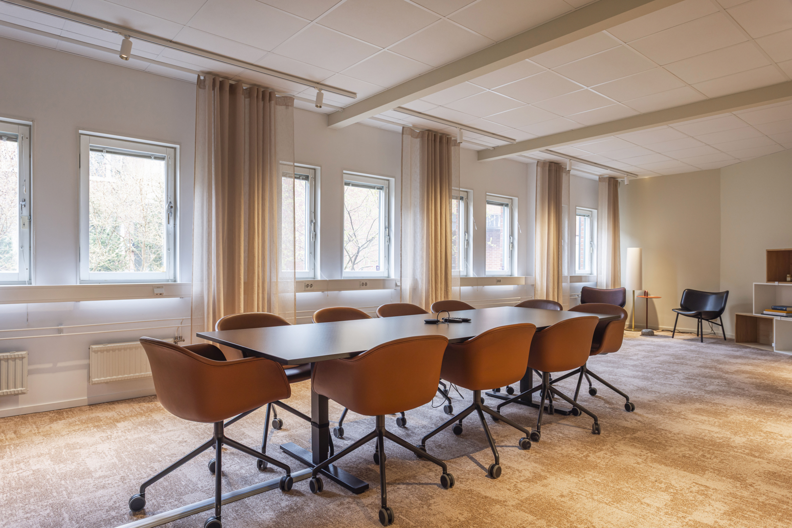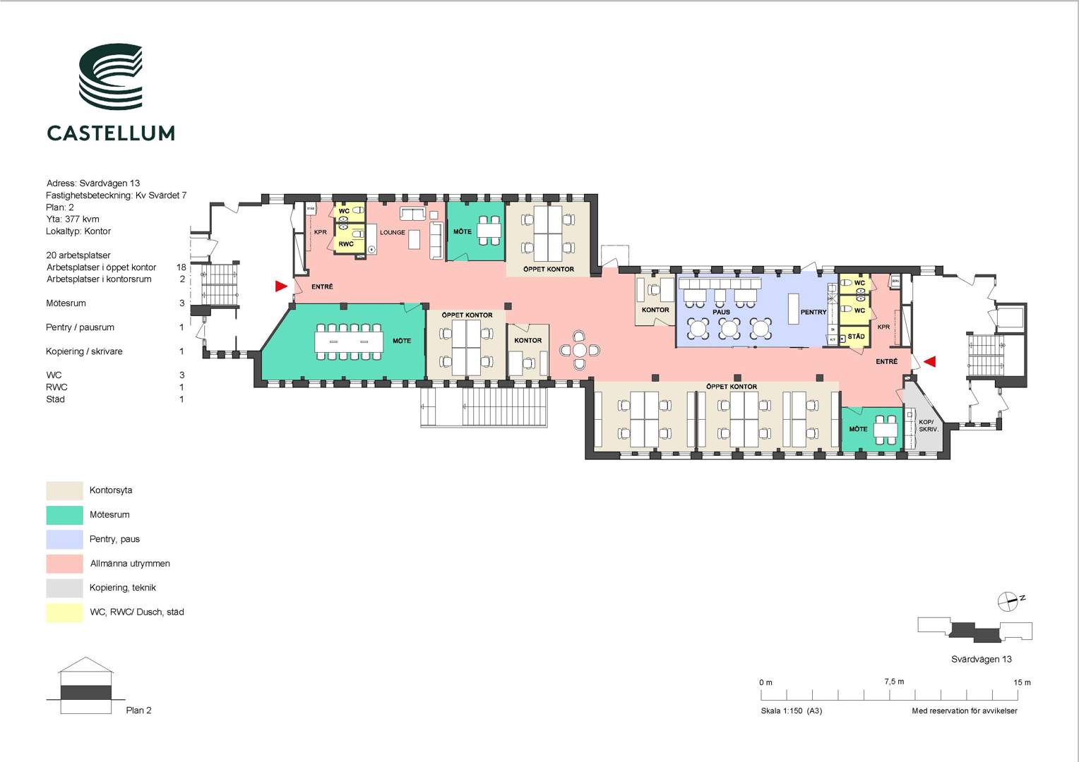 Planlösningen är smart och flexibel med en blandning av öppna landskap, kontorsrum och konferensrum. Här finns plats för både koncentrerat arbete och kreativa samarbeten. Den öppna ytan är idealisk för arbetsgrupper eller coworking, medan de rymliga kontorsrummen erbjuder avskildhet för ledning eller projektteam. Konferensrummen är välutrustade för effektiva möten, presentationer och workshops. Lokalen kompletteras med pentry, loungeyta och flera toaletter, vilket skapar en komplett och funktionell arbetsplats.