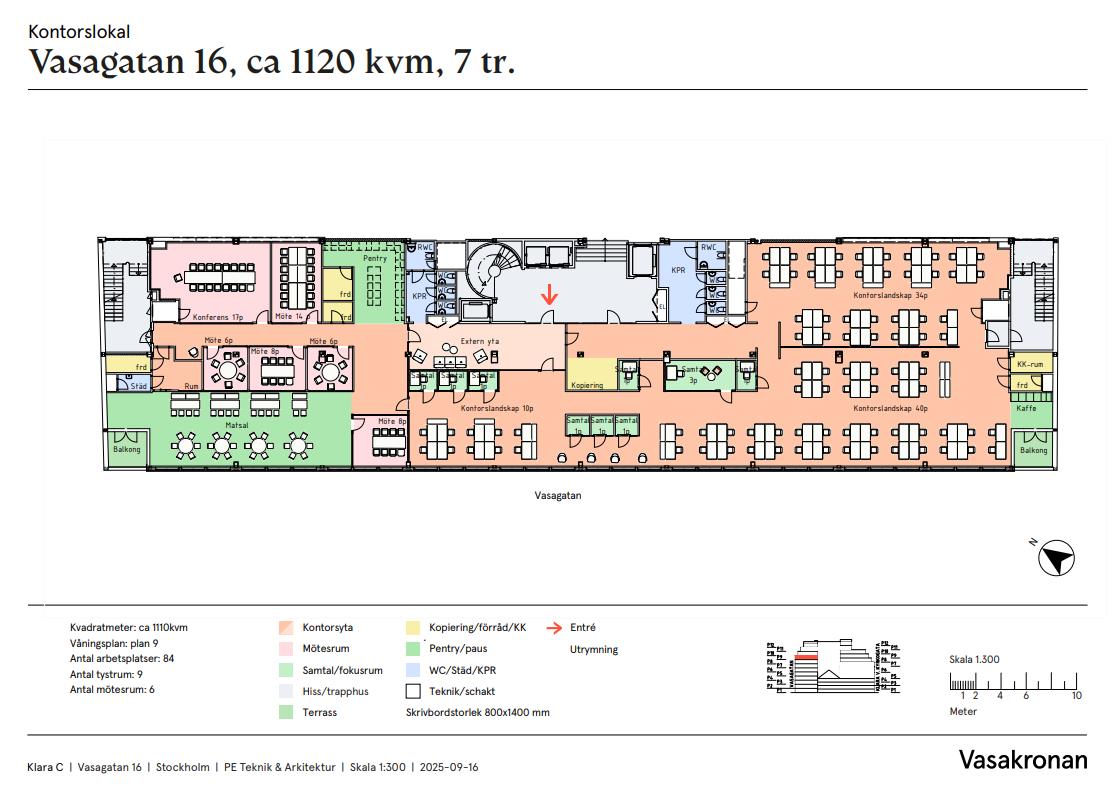 Ett unikt nav för möten, tillväxt och affärer i Stockholms city Söker ni det perfekta läget för effektiva möten, smidiga affärsluncher och dynamiskt nätverkande mitt i stadens puls? Nu finns chansen att hamna helt rätt. Kontoret på Vasagatan kan bli ert strategiska nav med optimal närhet till kommunikationer. Med Stockholm centralstation som granne blir er närvaro i staden både smidig och imponerande för era anställda och kunder, oavsett varifrån de kommer. Ni befinner er mitt i Stockholms hjärta och nära till allt som staden har att erbjuda, från shopping och restauranger till träningsmöjligheter och kulturella upplevelser. När hissdörrarna öppnas på plan 9 möts ni av en ljus och rymlig atmosfär, med stora fönster som ramar in en fantastisk vy över Riddafjärden. Det ger en inspirerande bakgrund till arbetsdagen och förstärker känslan av att vara på den optimala platsen för tillväxt och framgång. Starta arbetsdagen med kaffe på takterrassen och inspireras av stadens pulserande vy medan ni förbereder möten och samarbeten. Vi skapar ert drömkontor med kreativt återbruk och era önskemål i fokus Här kan ni forma er arbetsdag precis som ni vill. De öppna ytorna uppmuntrar till spontanitet och samarbete, medan de avskilda rummen ger en lugn plats för möten och fokuserat arbete. Ni kan vara säkra på att era behov och önskemål inkluderas i planeringen av lokalen på 704 kvm, där återbruk och hållbarhet genomsyrar designen. Ni är centralt placerade, med tunnelbana, pendeltåg, Arlanda Express och fjärrtåg en kort promenad bort. Cyklister tar sig enkelt hit och har tillgång till cykelrum, omklädningsrum och garage i huset. I entrén möts ni av en modern lounge och reception som guidar besökare. Här finns mötesrum för både mindre konferenser och stora presentationer. Grannar inom finans, juridik, teknik och coworking som Convendum gör detta till ett dynamiskt affärscentrum med utmärkt skyltläge mot Centralbron. Vasakronan är som er mentor, här för att guida och vägleda er rätt!