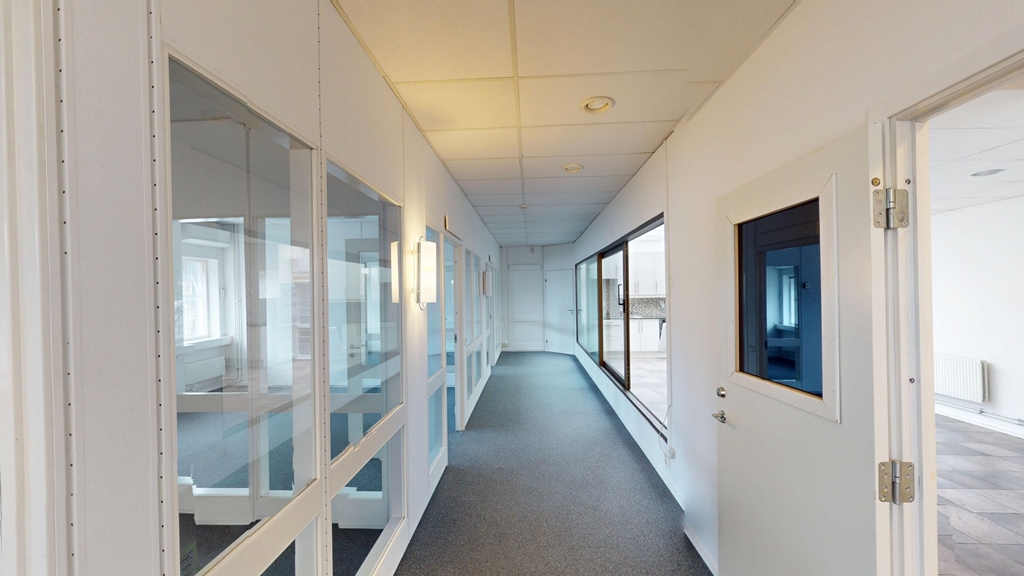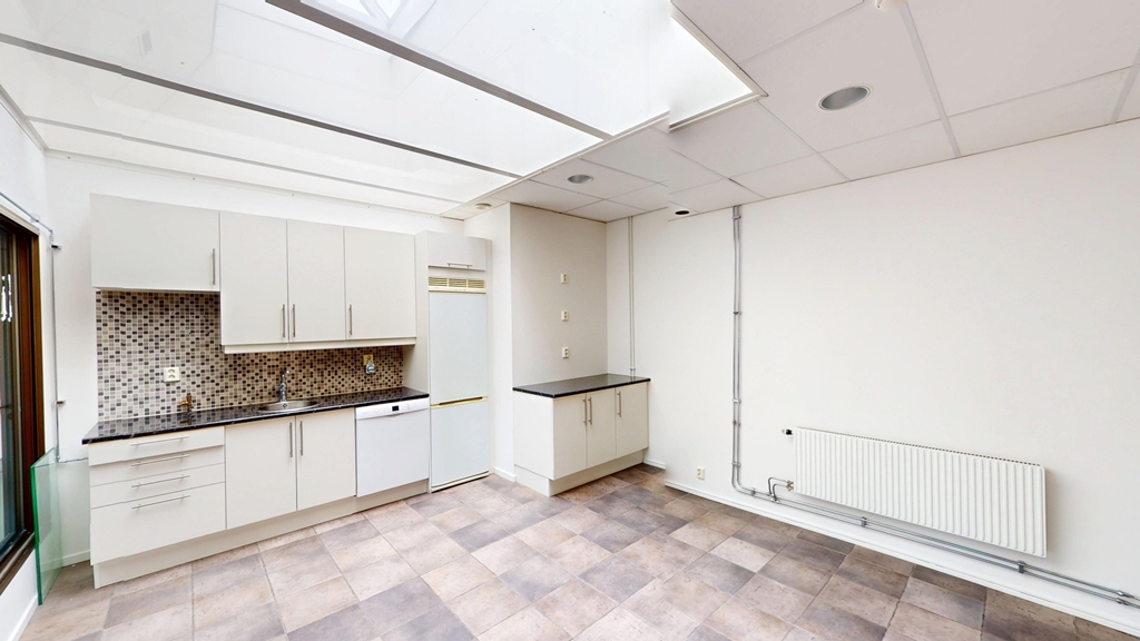 Lokalen har en kombination av öppet landskap och egna kontorsrum. Kontorsytorna har glasväggar som skapar en öppen känsla samtidigt som de erbjuder avskildhet. Det moderna pentryt är fullt utrustat och matsalen får ett härligt ljusinsläpp tack vare stora takfönster.