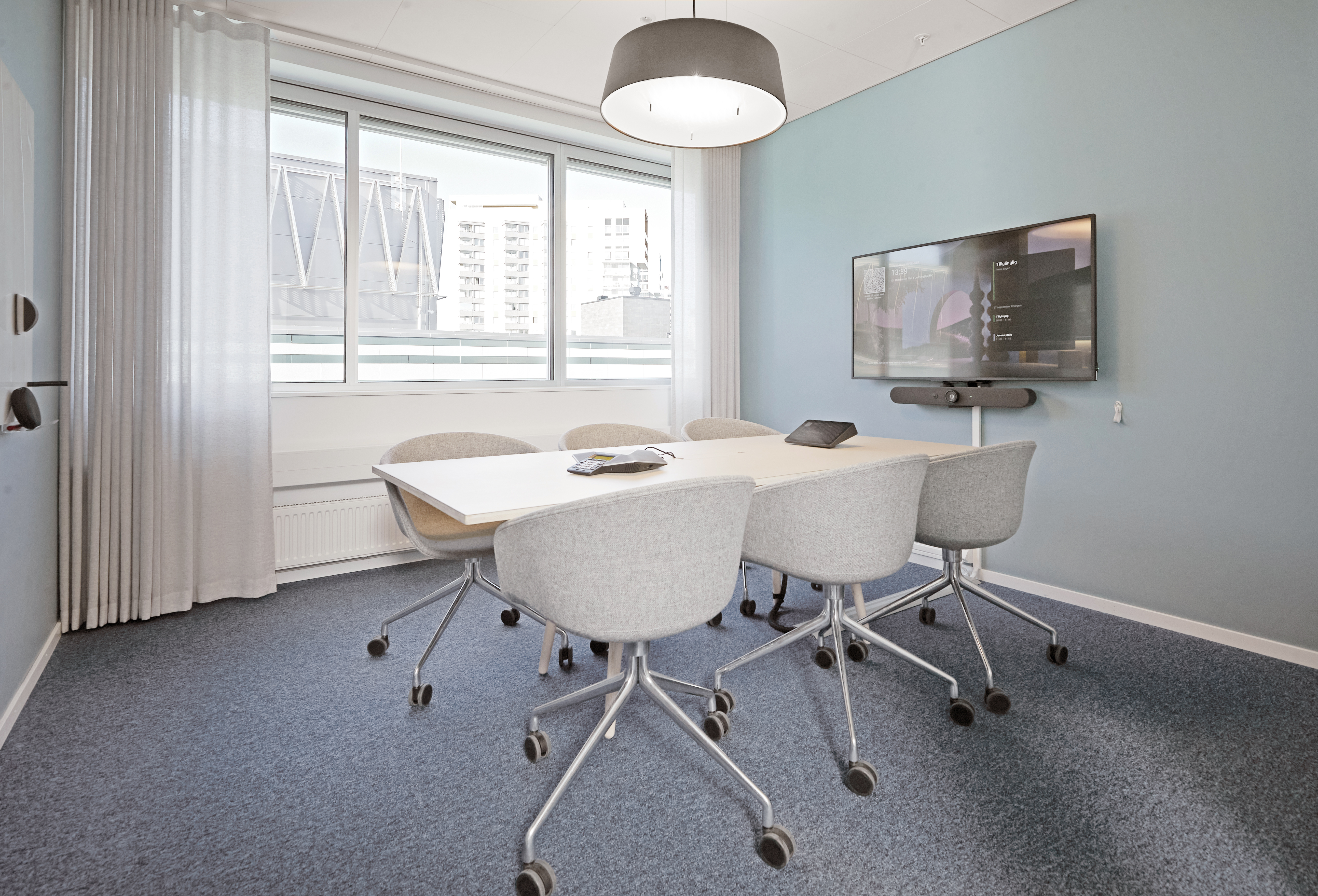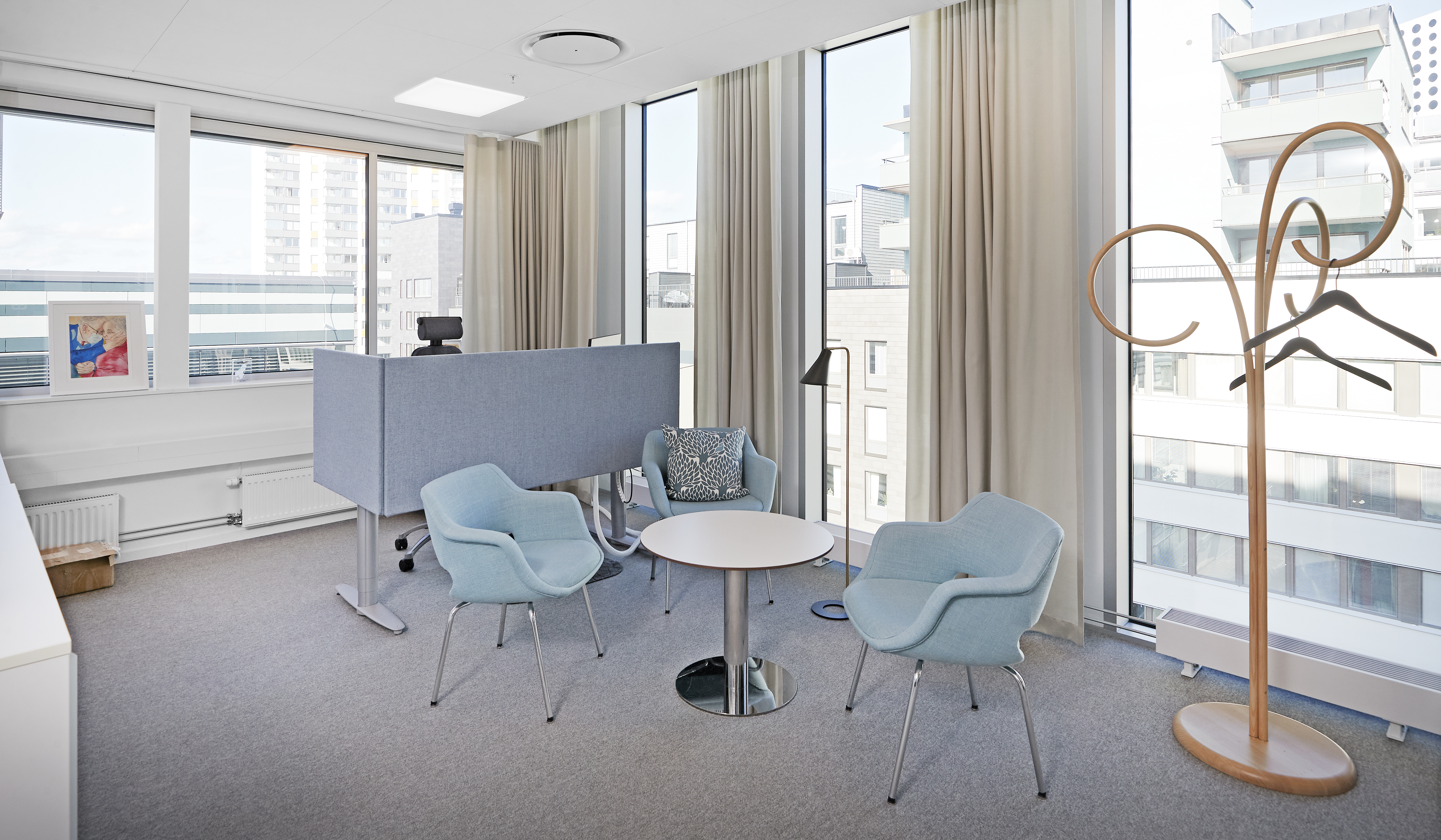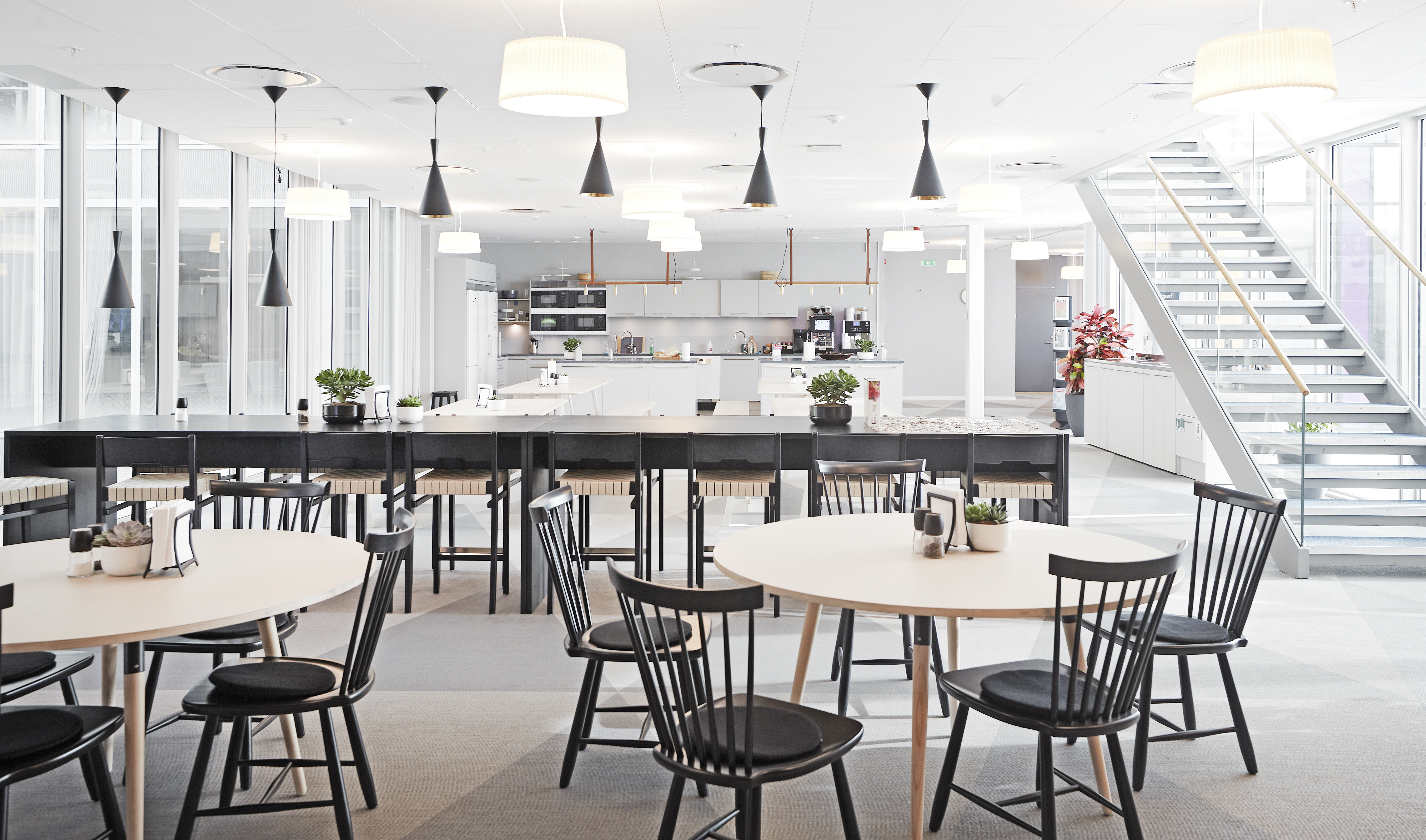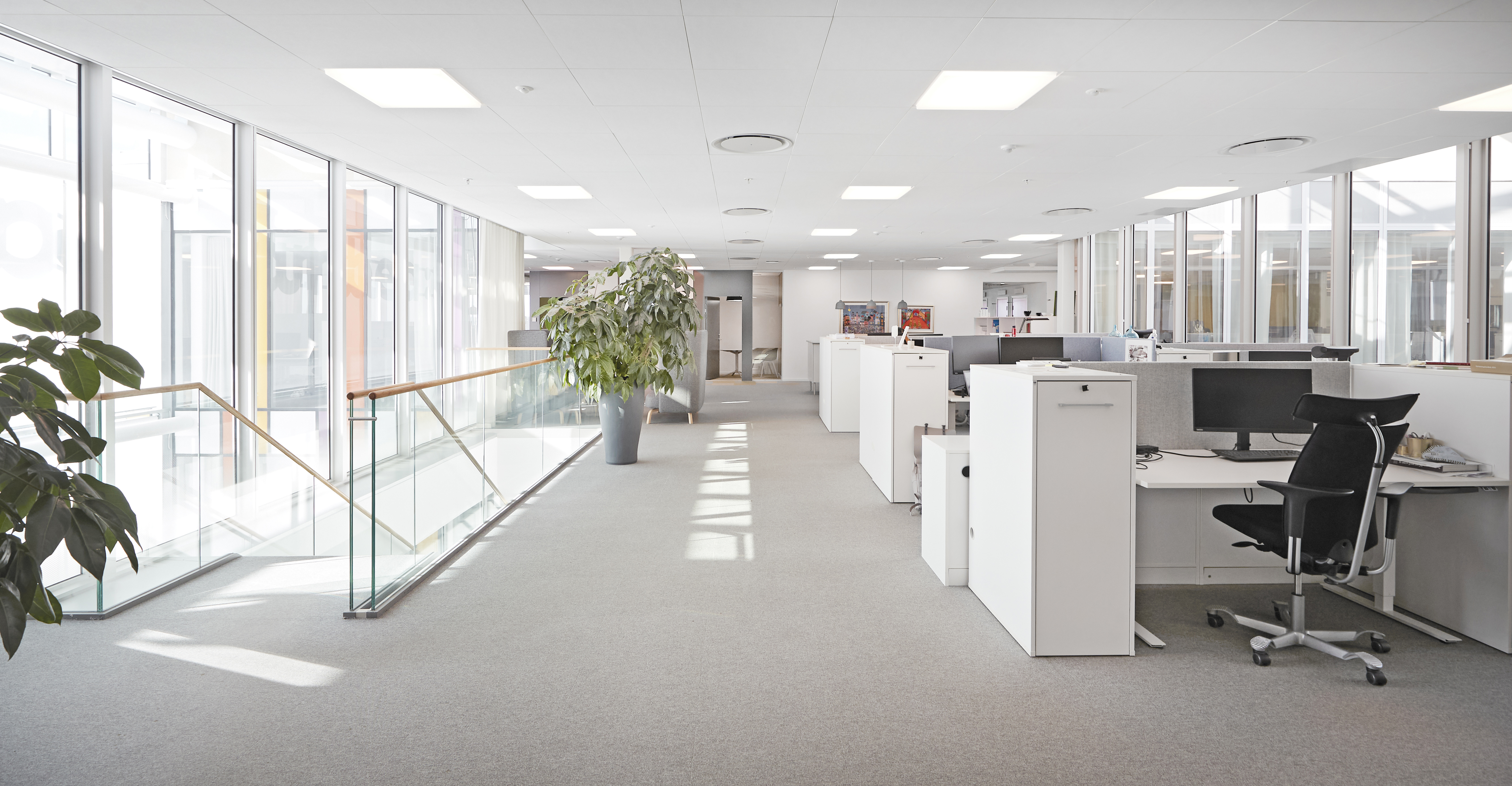 Kontorslokalen har fönster från golv till tak och ljusa, fräscha ytskikt. Vy över pulserande Evenemangsgatan på ena sidan och grönskande Råstasjön på andra. Gott om sällskapsytor ger möjlighet för anställda att umgås.