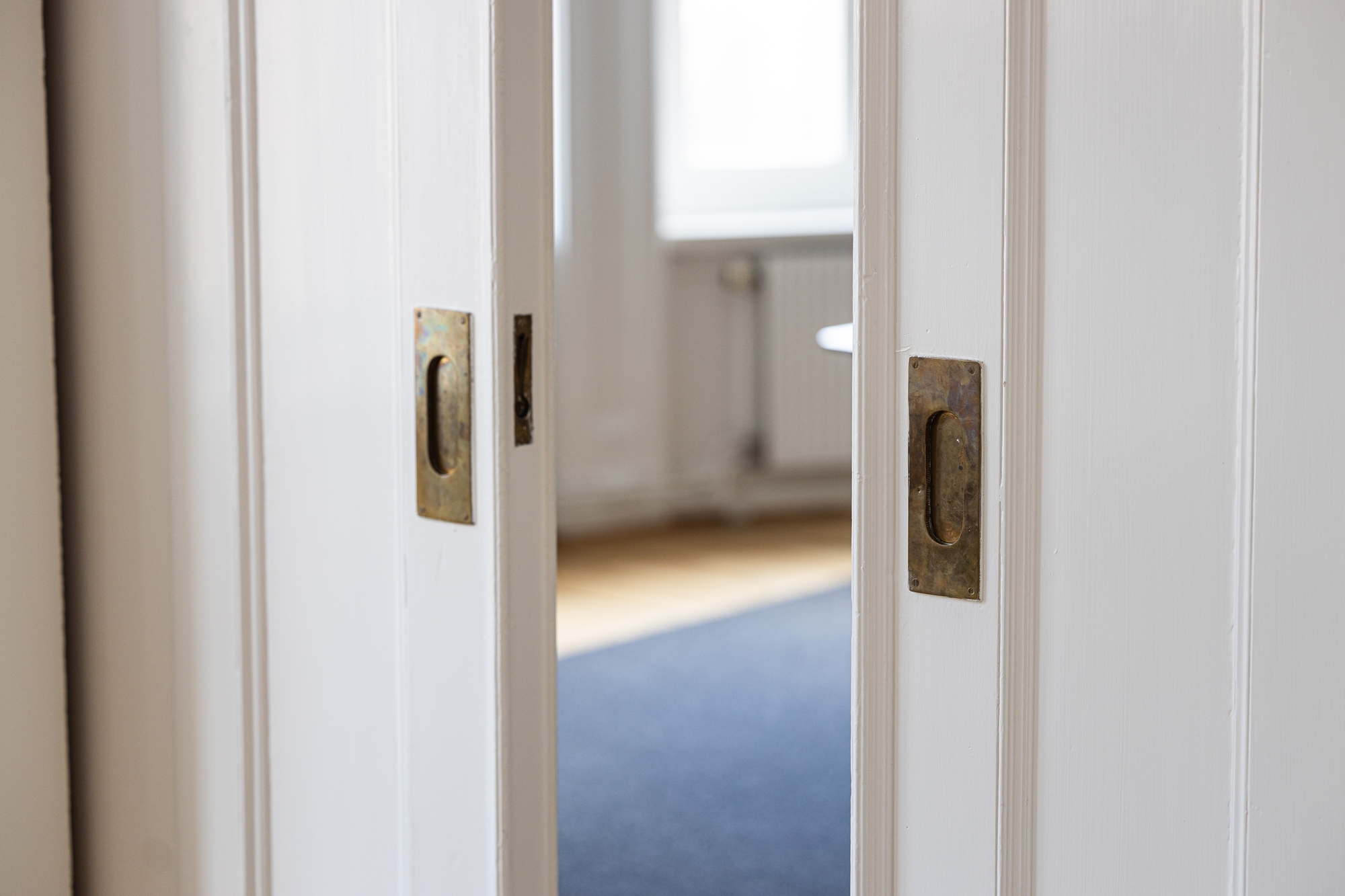 Rumsindelad planlösning, möjlighet att ha dubbeldörrarna öppna mellan kontorsrummen för att få ett större sammanhängande kontorslandskap.