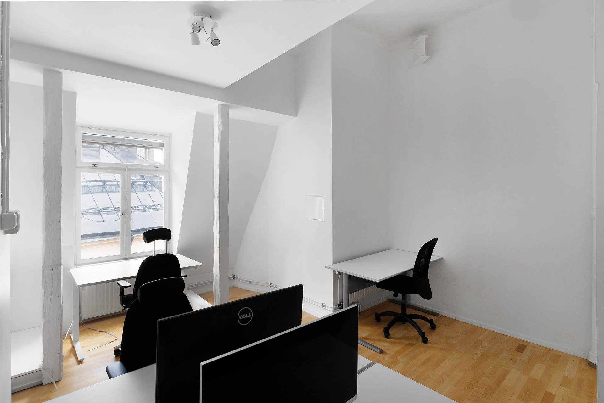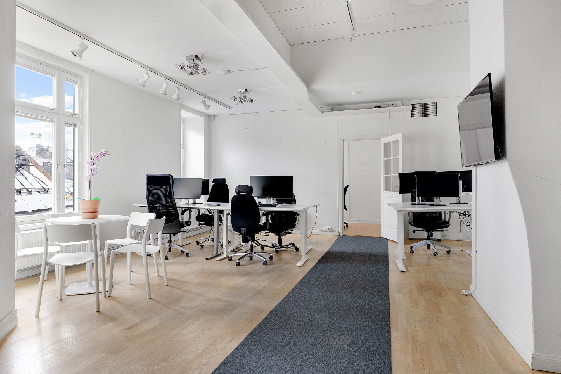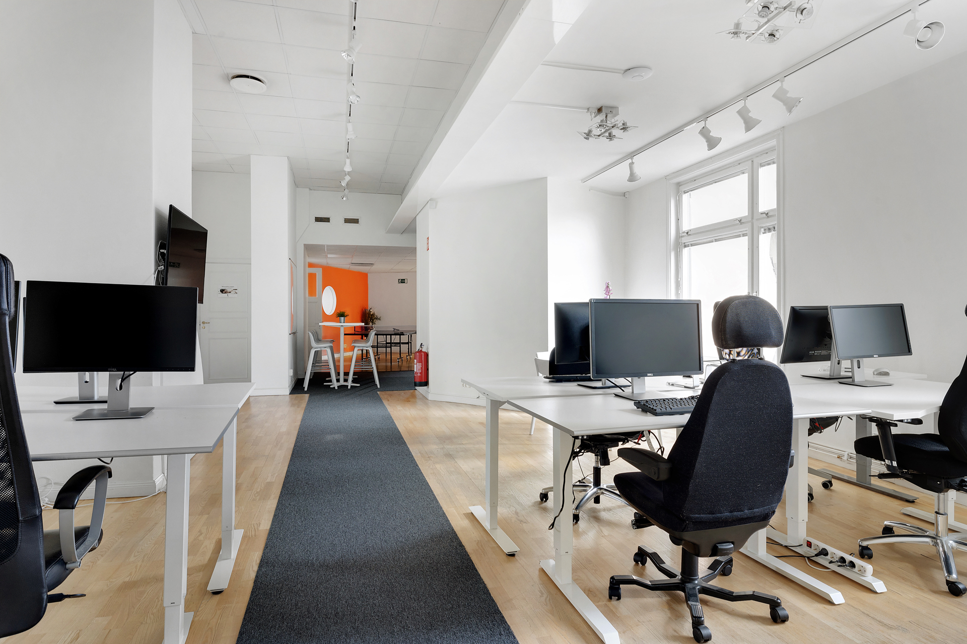Lokalen består utav en stor öppen arbetsyta (idag uppmöblerad för ca 6 arbetplatser, men kan möbleras upp för fler), 3 st mötesrum varav 2 st mindre för 2 pesoner/rum och 1 st större perfekt för 8-10 personer.